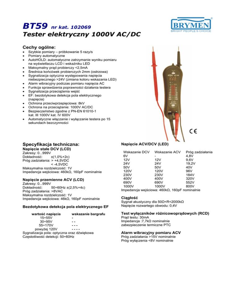 BT59 nr kat. 102069 Tester elektryczny 1000V AC/DC Cechy ogólne: • • • • • • • • • • • • • • Szybkie pomiary – próbkowanie 5 razy/s Pomiary automatyczne AutoHOLD: automatyczne zatrzymanie wyniku pomiaru na wyświetlaczu LCD i wskaźniku LED Maksymalny prąd probierczy <2,5mA Średnica końcówek probierczych 2mm (ostrzowa) Sygnalizacja optyczna występowania napięcia niebezpiecznego >24V (zmiana koloru wskazania LED) Alarm wibracyjny podczas pomiaru napięcia AC Funkcja sprawdzenia poprawności działania testera Sygnalizacja przeciążenia wejść EF: bezdotykowa detekcja pola elektrycznego (napięcia) Ochrona przeciwprzepięciowa: 8kV Ochrona na przeciążenie: 1000V AC/DC Bezpieczeństwo zgodne z PN-EN 61010-1 kat. III 1000V kat. IV 600V Automatyczne włączanie i wyłączanie testera po 15 sekundach bezczynności Specyfikacja techniczna: Napięcie stałe DCV (LCD) Zakresy: 0...999V Dokładność: ±(1,0%+2c) Próg zadziałania: > +4,5VDC < -4,5VDC Maksymalna rozdzielczość: 1V Impedancja wejściowa: 460kΩ, 160pF nominalnie Napięcie przemienne ACV (LCD) Zakresy: 0...999V Dokładność: 50÷60Hz ±(2,5%+4c) Próg zadziałania: >8VAC Maksymalna rozdzielczość: 1V Impedancja wejściowa: 46kΩ, 160pF nominalnie Bezdotykowa detekcja pola elektrycznego EF wartość napięcia wskazanie bargrafu 15÷55V -30÷95V --55÷170V ---powyżej 120V Sygnalizacja pola: optyczna oraz dźwiękowa Częstotliwość detekcji: 50÷60Hz Napięcie ACV/DCV (LED) Wskazanie DCV Wskazanie ACV Próg zadziałania 6V 4,8V 12V 12V 9,6V 24V 24V 19,2V 50V 50V 40V 120V 120V 96V 230V 230V 184V 400V 400V 320V 690V 690V 552V 1000V 1000V 800V Impedancja wejściowa: 460kΩ, 160pF nominalnie Ciągłość Sygnał akustyczny dla 50Ω<R<2000kΩ Napięcie rozwartego obwodu: 0,4V Test wyłączników różnicowoprądowych (RCD) Prąd testu: 30mA Impedancja :7,7kΩ nominalnie zabezpieczenie termiczne PTC Alarm wibracyjny pomiaru ACV Próg zadziałania >15V nominalnie Próg wyłączenia <8V nominalnie Pozostałe dane: Wyposażenie standardowe: Wyświetlacz: LCD (999 max) Próbkowanie: 5 razy/s Bezpieczeństwo: PN-EN61010-1 kat. III 1000V, kat. IV 600V Kompatybilność elektromagnetyczna: PN-EN61326 PN-EN61000-4-2, PN-EN61000-4-3 Ochrona wejść na przeciążenie: V: 1000V AC/DC Ochrona przeciwprzepięciowa: 8kV (1,2/50µs SURGE) Współczynnik temperatury: 0,15 x (podana dokładność) / °C (0÷18°C, 28÷55°C) Środowisko pracy: 0÷55°C; RH<80% 31°C, RH<50% 55°C Środowisko przechowywania: -20÷60°C, RH<80% Zasilanie: 2 baterie 1,5V (R03, AAA) Wymiary: 178x57x34mm Masa: 174 g • • • przewody pomiarowe (para) komplet baterii (2 szt.) - zainstalowane instrukcja obsługi w języku polskim BIALL Sp. z o.o. Otomin, ul. Słoneczna 43 80-174 Gdańsk (0-58) 322-11-91,92,93 e-mail: [email protected] www.biall.com.pl
