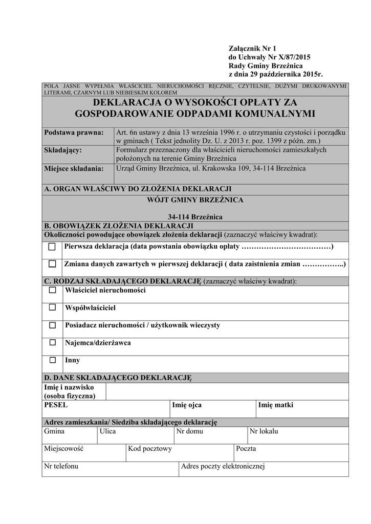 Załącznik Nr 1 do Uchwały Nr X/87/2015 Rady Gminy Brzeźnica z dnia 29 października 2015r. POLA JASNE WYPEŁNIA WŁAŚCICIEL NIERUCHOMOŚCI RĘCZNIE, CZYTELNIE, DUŻYMI DRUKOWANYMI LITERAMI, CZARNYM LUB NIEBIESKIM KOLOREM DEKLARACJA O WYSOKOŚCI OPŁATY ZA GOSPODAROWANIE ODPADAMI KOMUNALNYMI Podstawa prawna: Składający: Miejsce składania: Art. 6n ustawy z dnia 13 września 1996 r. o utrzymaniu czystości i porządku w gminach ( Tekst jednolity Dz. U. z 2013 r. poz. 1399 z późn. zm.) Formularz przeznaczony dla właścicieli nieruchomości zamieszkałych położonych na terenie Gminy Brzeźnica Urząd Gminy Brzeźnica, ul. Krakowska 109, 34-114 Brzeźnica A. ORGAN WŁAŚCIWY DO ZŁOŻENIA DEKLARACJI WÓJT GMINY BRZEŹNICA 34-114 Brzeźnica B. OBOWIĄZEK ZŁOŻENIA DEKLARACJI Okoliczności powodujące obowiązek złożenia deklaracji (zaznaczyć właściwy kwadrat): Pierwsza deklaracja (data powstania obowiązku opłaty ………………………………) Zmiana danych zawartych w pierwszej deklaracji ( data zaistnienia zmian ……………..) C. RODZAJ SKŁADAJĄCEGO DEKLARACJĘ (zaznaczyć właściwy kwadrat): Właściciel nieruchomości Współwłaściciel Posiadacz nieruchomości / użytkownik wieczysty Najemca/dzierżawca Inny D. DANE SKŁADAJĄCEGO DEKLARACJĘ Imię i nazwisko (osoba fizyczna) PESEL Imię ojca Adres zamieszkania/ Siedziba składającego deklarację Gmina Ulica Nr domu Miejscowość Nr telefonu Kod pocztowy Imię matki Nr lokalu Poczta Adres poczty elektronicznej Adres do korespondencji (wypełnić jeżeli jest inny niż adres zamieszkania) Gmina Ulica Miejscowość Nr domu Nr lokalu Kod pocztowy Poczta E. Adres nieruchomości, na której powstają odpady komunalne (wypełnić jeżeli jest inny niż adres zamieszkania) Gmina Miejscowość Ulica Nr domu Nr lokalu Obręb – numer działki Kod pocztowy Poczta F. USTALENIA WYSOKOŚCI OPŁAT ( zaznaczyć właściwy kwadrat): Oświadczam, że na terenie nieruchomości odpady będą gromadzone i odbierane w sposób: selektywny nieselektywny F1.Oświadczam, iż na terenie nieruchomości wskazanej w części E deklaracji prowadzone jest: (podać liczbę gospodarstw domowych prowadzonych na terenie nieruchomości) Liczba gospodarstw 1 osobowych ………………….. Liczba gospodarstw 2 osobowych ………………….. Liczba gospodarstw od 3-4 osób …………………. Liczba gospodarstw powyżej 4 osób ………………….. F2. Stawka miesięcznej opłaty za odpady komunalne zbierane w sposób selektywny wynosi: 8,00zł/mc gospodarstwo domowe 1 osobowe 16,00zł/mc gospodarstwo domowe 2 osobowe 25,00zł/mc gospodarstwo domowe od 3 - 4 osób 30,00zł/mc gospodarstwo domowe powyżej 4 osób F3. Stawka miesięcznej opłaty za odpady komunalne zbierane w sposób nieselektywny: 16,00zł/mc gospodarstwo domowe 1 osobowe 32,00zł/mc gospodarstwo domowe 2 osobowe 50,00 zł/mc gospodarstwo domowe od 3 - 4 osób 60,00zł/mc gospodarstwo domowe powyżej 4 osób F4. WYSOKOŚĆ MIESIĘCZNEJ OPŁATY wpisać wyliczoną kwotę …………………………zł (słownie ………………………………………………………………………………………………………zł.) (wysokość opłaty = liczba gospodarstw domowych z pkt. F1 x stawka opłaty z pkt. F2 lub F3) F5. WYSOKOŚĆ OPŁATY UISZCZANEJ KWARTALNIE wpisać wyliczoną kwotę …………………………zł (słownie ………………………………………………………………………………………………………zł) (wysokość opłaty= stawka miesięczna z pkt.F4 x 3 m-ce) PODPIS SKŁADAJĄCEGO DEKLARACJĘ …........................................................ (miejscowość i data) …............................................. (czytelny podpis) Pouczenie: Niniejsza deklaracja stanowi podstawę do wystawienia tytułu wykonawczego, zgodnie z przepisami ustawy z dnia 17 czerwca 1966r. o postępowaniu egzekucyjnym w administracji ( tekst jednolity Dz. U. z 2014r. poz. 1619 z późn. zm.). W razie niezłożenia deklaracji o wysokości opłaty za gospodarowanie odpadami komunalnymi albo uzasadnionych wątpliwości co do danych zawartych w deklaracji Wójt Gminy Brzeźnica określa, w drodze decyzji wysokość opłaty za gospodarowanie odpadami komunalnymi, biorąc po uwagę dostępne dane właściwe dla wybranej przez radę gminy metody, a w przypadku ich braku uzasadnione szacunki. Objaśnienie: 1) Właściciel nieruchomości jest obowiązany złożyć deklarację Wójtowi Gminy Brzeźnica o wysokości opłaty za gospodarowanie odpadami komunalnymi w terminie 14 dni od dnia zamieszkania na danej nieruchomości pierwszego mieszkańca zgodnie z art. 6m ustawy z dnia 13 września 1996 r. o utrzymaniu czystości i porządku w gminie (Tekst jednolity Dz. U. z 2013 r. poz. 1399 z późn. zm.) 2) W przypadku zmiany danych będących podstawą ustalenia wysokości należnej opłaty za gospodarowanie odpadami komunalnymi powstającymi na danej nieruchomości właściciel nieruchomości jest obowiązany złożyć nową deklarację w terminie 14 dni od dnia nastąpienia zmiany. Opłatę za gospodarowanie odpadami komunalnymi w zmienionej wysokości uiszcza się za miesiąc, w którym nastąpiła zmiana. 3) Właściciel nieruchomości zamieszkałej obowiązany jest wpłacić obliczoną w deklaracji opłatę, bez wezwania w kasie Urzędu Gminy Brzeźnica lub na indywidualny numer konta bankowego lub u inkasenta, w ratach proporcjonalnych do czasu trwania obowiązku opłaty, w terminach do 30 dnia trzeciego miesiąca kwartału kalendarzowego. 4) Po złożeniu pierwszej deklaracji, każdy właściciel nieruchomości uzyska indywidualny numer konta bankowego, na który zobowiązany będzie uiszczać opłatę za gospodarowanie odpadami komunalnymi.