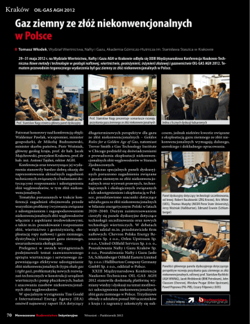Kraków OIL-GAS AGH 2012 Gaz ziemny ze złóż niekonwencjonalnych w Polsce ❚❚ Tomasz Włodek, Wydział Wiertnictwa, Nafty i Gazu, Akademia Górniczo-Hutnicza im. Stanisława Staszica w Krakowie 29–31 maja 2012 r. na Wydziale Wiertnictwa, Nafty i Gazu AGH w Krakowie odbyła się XXIII Międzynarodowa Konferencja Naukowo-Techniczna Nowe metody i technologie w geologii naftowej, wiertnictwie, geoinżynierii, inżynierii złożowej i gazownictwie OIL-GAS AGH 2012. Tematem przewodnim tegorocznego wydarzenia był gaz ziemny ze złóż niekonwencjonalnych w Polsce. 70 Prof. Stanisław Nagy otwiera główny panel dyskusyjny Prof. Stanisław Nagy prezentuje scenariusze rozwoju pozyskania gazu ziemnego ze złóż niekonwencjonalnych Patronat honorowy nad konferencją objęli: Waldemar Pawlak, wicepremier, minister gospodarki, dr Mikołaj Budzanowski, minister skarbu państwa, Piotr Woźniak, główny geolog kraju, prof. dr hab. Jacek Majchrowski, prezydent Krakowa, prof. dr hab. inż. Antoni Tajduś, rektor AGH. Konferencja oraz towarzyszące jej wydarzenia stanowiły bardzo dobrą okazję do zaprezentowania aktualnych zagadnień technicznych związanych z badaniami dotyczącymi rozpoznania i udostępnienia złóż węglowodorów, w tym złóż niekonwencjonalnych. Tematyka poruszanych w trakcie konferencji zagadnień obejmowała przede wszystkim problemy i wyzwania związane z udostępnianiem i zagospodarowaniem niekonwencjonalnych złóż węglowodorów włącznie z aspektami środowiskowymi, a także m.in. poszukiwanie i rozpoznanie złóż, wiertnictwo i geoinżynierię, eksploatację ropy naftowej i gazu ziemnego, dystrybucję i transport gazu ziemnego, uwarunkowania ekologiczne. Prelegenci w swoich wystąpieniach podejmowali temat zaawansowanego sprzętu wiertniczego i serwisowego zapewniającego efektywne udostępnianie złóż niekonwencjonalnych (typu shale gas i tight gas), problematykę nowych rozwiązań technicznych w konstrukcji urządzeń wiertniczych i pomp płuczkowych, badań i szacowania zasobów niekonwencjonalnych złóż węglowodorów. W specjalnym wystąpieniu Tim Gould z International Energy Agency (IEA) omówił najnowszy raport IEA dotyczący długoterminowych perspektyw dla gazu ze złóż niekonwencjonalnych – Golden Rules for a Golden Age of Gas, natomiast Trevor Smith z Gas Technology Institute w Chicago podzielił się doświadczeniami z prowadzenia eksploatacji niekonwencjonalnych złóż węglowodorów w Stanach Zjednoczonych. Podczas specjalnych paneli dyskusyjnych poruszono zagadnienia związane z gazem ziemnym ze złóż niekonwencjonalnych oraz wyzwań prawnych, technologicznych i ekologicznych związanych z ich udostępnieniem i eksploatacją w Polsce, przedstawiono szacunki dotyczące udziału gazu ze złóż niekonwencjonalnych w bilansie energetycznym Polski w latach 2020–2040. Dużym zainteresowaniem cieszyły się panele dyskusyjne dotyczące technologii szczelinowania oraz nowych technologii wiertniczych. W debatach wzięli udział m.in. przedstawiciele firm naftowych: Chevron Polska Energy Resources Sp. z o.o., Orlen Upstream Sp. z o.o., United Oilfield Services Sp. z o. o., Poszukiwania Nafty i Gazu Kraków Sp. z o.o., Poszukiwania Nafty i Gazu Jasło SA, Schlumberger Oilfield Eastern Limited Sp. z o.o. i Halliburton Company Germany GmbH Sp. z o.o., oddział w Polsce. XXIII Międzynarodowa Konferencja Naukowo-Techniczna OIL-GAS AGH 2012 stanowiła doskonałą platformę wymiany wiedzy i dyskusji na temat możliwości udostępnienia niekonwencjonalnych złóż gazu ziemnego w Polsce. Trzydniowe obrady z udziałem ponad 300 uczestników z kraju i z zagranicy zakończyły się suk- Nowoczesne Budownictwo Inżynieryjne Wrzesień – Październik 2012 Jedna z licznych dyskusji kuluarowych cesem, jednak niektóre kwestie związane z eksploatacją gazu ziemnego ze złóż niekonwencjonalnych wymagają dalszego, szerokiego i dokładnego opracowania. Panel dyskusyjny dotyczący technologii szczelinowania, od lewej: Robert Raczkowski (ZRG Krosno), Kris White (UOS), Thomas Murphy (MCOR Penn State University), Jerzy Woźniak (Halliburton), Edmund Eswein (Schlumberger) Paneliści głównego panelu dyskusyjnego dotyczącego perspektyw rozwoju pozyskania gazu ziemnego ze złóż niekonwencjonalnych, od lewej: prof. Stanisław Rychlicki (AGH WWNiG), Jacek Wróblewski (BNK Petroleum), John Claussen (Chevron), Wiesław Prugar (Orlen Upstream), Paweł Poprawa (PIG-PIB), Cezary Filipowicz (UOS) zobacz więcej