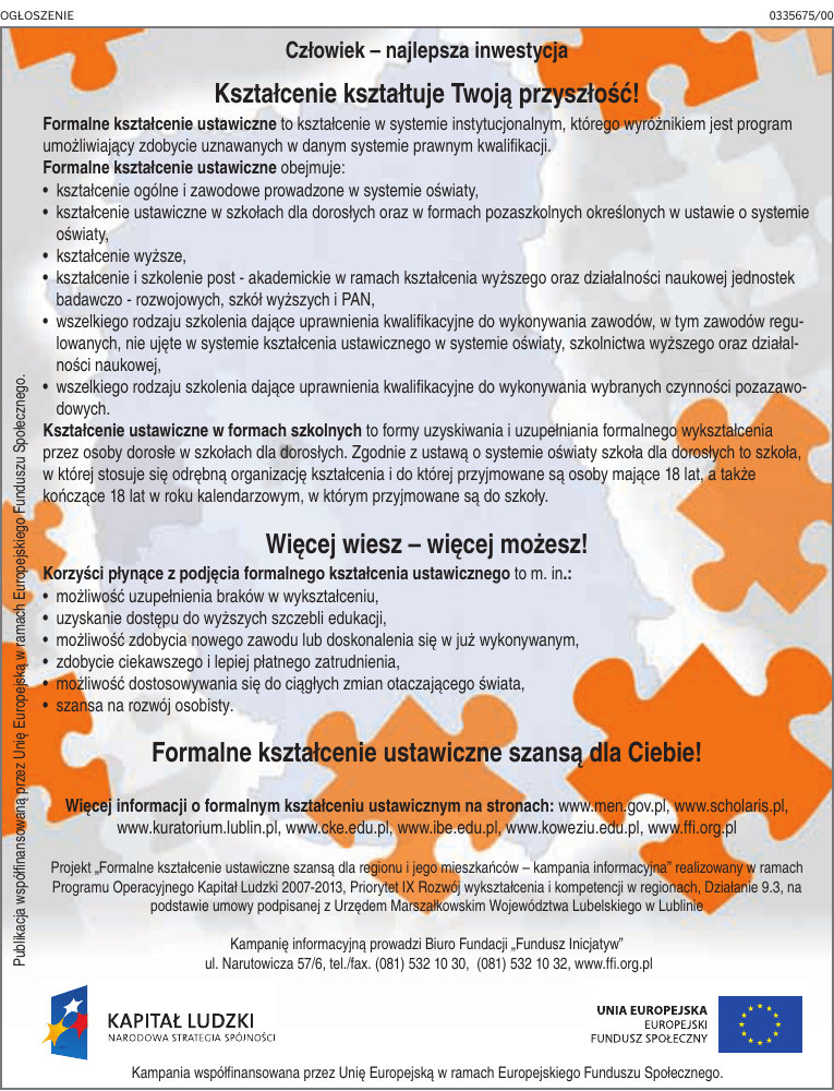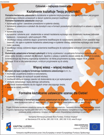 OGŁOSZENIE 0335675/00 Człowiek – najlepsza inwestycja Publikacja współfinansowaną przez Unię Europejską w ramach Europejskiego Funduszu Społecznego. Kształcenie kształtuje Twoją przyszłość! Formalne kształcenie ustawiczne to kształcenie w systemie instytucjonalnym, którego wyróżnikiem jest program umożliwiający zdobycie uznawanych w danym systemie prawnym kwalifikacji. Formalne kształcenie ustawiczne obejmuje: • kształcenie ogólne i zawodowe prowadzone w systemie oświaty, • kształcenie ustawiczne w szkołach dla dorosłych oraz w formach pozaszkolnych określonych w ustawie o systemie oświaty, • kształcenie wyższe, • kształcenie i szkolenie post - akademickie w ramach kształcenia wyższego oraz działalności naukowej jednostek badawczo - rozwojowych, szkół wyższych i PAN, • wszelkiego rodzaju szkolenia dające uprawnienia kwalifikacyjne do wykonywania zawodów, w tym zawodów regulowanych, nie ujęte w systemie kształcenia ustawicznego w systemie oświaty, szkolnictwa wyższego oraz działalności naukowej, • wszelkiego rodzaju szkolenia dające uprawnienia kwalifikacyjne do wykonywania wybranych czynności pozazawodowych. Kształcenie ustawiczne w formach szkolnych to formy uzyskiwania i uzupełniania formalnego wykształcenia przez osoby dorosłe w szkołach dla dorosłych. Zgodnie z ustawą o systemie oświaty szkoła dla dorosłych to szkoła, w której stosuje się odrębną organizację kształcenia i do której przyjmowane są osoby mające 18 lat, a także kończące 18 lat w roku kalendarzowym, w którym przyjmowane są do szkoły. Więcej wiesz – więcej możesz! Korzyści płynące z podjęcia formalnego kształcenia ustawicznego to m. in.: • możliwość uzupełnienia braków w wykształceniu, • uzyskanie dostępu do wyższych szczebli edukacji, • możliwość zdobycia nowego zawodu lub doskonalenia się w już wykonywanym, • zdobycie ciekawszego i lepiej płatnego zatrudnienia, • możliwość dostosowywania się do ciągłych zmian otaczającego świata, • szansa na rozwój osobisty. Formalne kształcenie ustawiczne szansą dla Ciebie! Więcej informacji o formalnym kształceniu ustawicznym na stronach: www.men.gov.pl, www.scholaris.pl, www.kuratorium.lublin.pl, www.cke.edu.pl, www.ibe.edu.pl, www.koweziu.edu.pl, www.ffi.org.pl Projekt „Formalne kształcenie ustawiczne szansą dla regionu i jego mieszkańców – kampania informacyjna” realizowany w ramach Programu Operacyjnego Kapitał Ludzki 2007-2013, Priorytet IX Rozwój wykształcenia i kompetencji w regionach, Działanie 9.3, na podstawie umowy podpisanej z Urzędem Marszałkowskim Województwa Lubelskiego w Lublinie Kampanię informacyjną prowadzi Biuro Fundacji „Fundusz Inicjatyw” ul. Narutowicza 57/6, tel./fax. (081) 532 10 30, (081) 532 10 32, www.ffi.org.pl Kampania współfinansowana przez Unię Europejską w ramach Europejskiego Funduszu Społecznego.