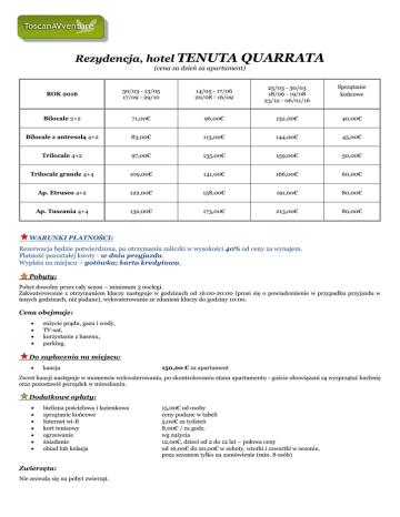 Rezydencja, hotel TENUTA QUARRATA (cena za dzień za apartament) ROK 2016 30/03 - 13/05 17/09 - 29/10 14/05 - 17/06 20/08 - 16/09 25/03 - 30/03 18/06 - 19/08 23/12 - 06/01/16 Sprzątanie końcowe Bilocale 2+2 71,00€ 96,00€ 132,00€ 40,00€ Bilocale z antresolą 4+2 83,00€ 113,00€ 144,00€ 45,00€ Trilocale 4+2 97,00€ 135,00€ 159,00€ 50,00€ Trilocale grande 4+4 109,00€ 141,00€ 166,00€ 60,00€ Ap. Etrusco 4+2 122,00€ 158,00€ 191,00€ 80,00€ Ap. Tuscania 4+4 132,00€ 173,00€ 213,00€ 80,00€ WARUNKI PŁATNOŚCI: Rezerwacja będzie potwierdzona, po otrzymaniu zaliczki w wysokości 40% od ceny za wynajem. Płatność pozostałej kwoty - w dniu przyjazdu. Wypłata na miejscu – gotówka; karta kredytowa. Pobyty: Pobyt dowolny przez cały sezon – minimum 3 noclegi. Zakwaterowanie z otrzymaniem kluczy następuje w godzinach od 16:00-20:00 (prosi się o powiadomienie w przypadku przyjazdu w innych godzinach, niż podane), wykwaterowanie ze zdaniem kluczy do godziny 10:00. Cena obejmuje: zużycie prądu, gazu i wody, TV-sat, korzystanie z basenu, parking. Do zapłacenia na miejscu: kaucja 150,00 € za apartament Zwrot kaucji następuje w momencie wykwaterowania, po skontrolowaniu stanu apartamentu - goście obowiązani są wysprzątać kuchnię oraz pozostawić porządek w mieszkaniu. Dodatkowe opłaty: bielizna pościelowa i łazienkowa sprzątanie końcowe Internet wi-fi kort tenisowy ogrzewanie śniadanie obiad lub kolacja Zwierzęta: Nie zezwala się na pobyt zwierząt. 15,00€ od osoby ceny podane w tabeli 5,00€ za tydzień 8,00€ / za godz. wg zużycia 12,00€, dzieci od 2 do 12 lat – połowa ceny od 16,00€ do 20,00€ w soboty, wtorki i czwartki w sezonie, poza sezonem tylko na zamówienie (min. 8 osób)