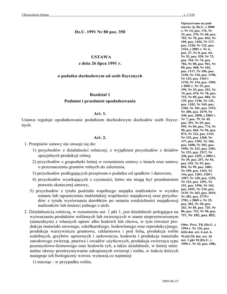 ©Kancelaria Sejmu s. 1/126 Dz.U. 1991 Nr 80 poz. 350 USTAWA z dnia 26 lipca 1991 r. o podatku dochodowym od osób fizycznych Rozdział 1 Podmiot i przedmiot opodatkowania Art. 1. Ustawa reguluje opodatkowanie podatkiem dochodowym dochodów osób fizycznych. Art. 2. 1. Przepisów ustawy nie stosuje się do: 1) przychodów z działalności rolniczej, z wyjątkiem przychodów z działów specjalnych produkcji rolnej, 2) przychodów z gospodarki leśnej w rozumieniu ustawy o lasach oraz ustawy o przeznaczeniu gruntów rolnych do zalesienia, 3) przychodów podlegających przepisom o podatku od spadków i darowizn, 4) przychodów wynikających z czynności, które nie mogą być przedmiotem prawnie skutecznej umowy, 5) przychodów z tytułu podziału wspólnego majątku małżonków w wyniku ustania lub ograniczenia małżeńskiej wspólności majątkowej oraz przychodów z tytułu wyrównania dorobków po ustaniu rozdzielności majątkowej małżonków lub śmierci jednego z nich. 2. Działalnością rolniczą, w rozumieniu ust. 1 pkt 1, jest działalność polegająca na wytwarzaniu produktów roślinnych lub zwierzęcych w stanie nieprzetworzonym (naturalnym) z własnych upraw albo hodowli lub chowu, w tym również produkcja materiału siewnego, szkółkarskiego, hodowlanego oraz reprodukcyjnego, produkcja warzywnicza gruntowa, szklarniowa i pod folią, produkcja roślin ozdobnych, grzybów uprawnych i sadownicza, hodowla i produkcja materiału zarodowego zwierząt, ptactwa i owadów użytkowych, produkcja zwierzęca typu przemysłowo-fermowego oraz hodowla ryb, a także działalność, w której minimalne okresy przetrzymywania zakupionych zwierząt i roślin, w trakcie których następuje ich biologiczny wzrost, wynoszą co najmniej: 1) miesiąc - w przypadku roślin, 2005-06-23 Opracowano na podstawie: tj. Dz.U. z 2000 r. Nr 14, poz. 176, Nr 22, poz. 270, Nr 60, poz. 703, Nr 70, poz. 816, Nr 104, poz. 1104, Nr 117, poz. 1228, Nr 122, poz. 1324, z 2001 r. Nr 4, poz. 27, Nr 8, poz. 64, Nr 52, poz. 539, Nr 73, poz. 764, Nr 74, poz. 784, Nr 88, poz. 961, Nr 89, poz. 968, Nr 102, poz. 1117, Nr 106, poz. 1150, Nr 110, poz. 1190, Nr 125, poz. 1363 i 1370, Nr 134, poz. 1509, z 2002 r. Nr 19, poz. 199, Nr 25, poz. 253, Nr 74, poz. 676, Nr 78, poz. 715, Nr 89, poz. 804, Nr 135, poz. 1146, Nr 141, poz. 1182, Nr 169, poz. 1384, Nr 181, poz. 1515, Nr 200, poz. 1679, Nr 240, poz. 2058, z 2003 r. Nr 7, poz. 79, Nr 45, poz. 391, Nr 65, poz. 595, Nr 84, poz. 774, Nr 90, poz. 844. Nr 96, poz. 874, Nr 122, poz. 1143, Nr 135, poz. 1268, Nr 137, poz. 1302, Nr 166, poz. 1608, Nr 202, poz. 1956, Nr 222, poz. 2201, Nr 223, poz. 2217, Nr 228, poz. 2255, z 2004 r. Nr 29, poz. 257, Nr 54, poz. 535, Nr 93, poz. 894, Nr 99, poz. 1001, Nr 109, poz. 1163, Nr 116, poz. 1203, 1205 i 1207, Nr 120, poz. 1252, Nr 123, poz. 1291, Nr 151, poz. 1596, Nr 162, poz. 1691, Nr 210, poz. 2135, Nr 263, poz. 2619, Nr 281, poz. 2779 i 2781, z 2005 r. Nr 25, poz. 202, Nr 30, poz. 262, Nr 85, poz. 725, Nr 86, poz. 732, Nr 90, poz. 757, Nr 102, poz. 852. Obw. Prez. TK (Dz.U. z 1994 r. Nr 126, poz. 626) dot. art. 6 ust. 6. Wykł.TK dot. art. 26 ust. 1 pkt 10 (Dz.U. z 1996 r. Nr 42, poz. 188). ©Kancelaria Sejmu s. 2/126 2) 16 dni - w przypadku wysokointensywnego tuczu specjalizowanego gęsi lub kaczek, 3) 6 tygodni - w przypadku pozostałego drobiu rzeźnego, 4) 2 miesiące - w przypadku pozostałych zwierząt - licząc od dnia nabycia. 3. Działami specjalnymi produkcji rolnej są: uprawy w szklarniach i ogrzewanych tunelach foliowych, uprawy grzybów i ich grzybni, uprawy roślin "in vitro", fermowa hodowla i chów drobiu rzeźnego i nieśnego, wylęgarnie drobiu, hodowla i chów zwierząt futerkowych i laboratoryjnych, hodowla dżdżownic, hodowla entomofagów, hodowla jedwabników, prowadzenie pasiek oraz hodowla i chów innych zwierząt poza gospodarstwem rolnym. 3a. Nie stanowią działów specjalnych produkcji rolnej uprawy, hodowla i chów zwierząt w rozmiarach nieprzekraczających wielkości określonych w załączniku nr 2 do ustawy, zwanym „załącznikiem nr 2”. 4. Ilekroć w ustawie jest mowa o gospodarstwie rolnym, oznacza to gospodarstwo rolne w rozumieniu przepisów ustawy o podatku rolnym. 5. (uchylony) Art. 3. 1. Osoby fizyczne, jeżeli mają miejsce zamieszkania na terytorium Rzeczypospolitej Polskiej, podlegają obowiązkowi podatkowemu od całości swoich dochodów bez względu na miejsce położenia źródeł przychodów (nieograniczony obowiązek podatkowy). 2. (uchylony) 2a. Osoby fizyczne, jeżeli nie mają na terytorium Rzeczypospolitej Polskiej miejsca zamieszkania, podlegają obowiązkowi podatkowemu tylko od dochodów z pracy wykonywanej na terytorium Rzeczypospolitej Polskiej na podstawie stosunku służbowego lub stosunku pracy, bez względu na miejsce wypłaty wynagrodzenia, oraz od innych dochodów osiąganych na terytorium Rzeczypospolitej Polskiej (ograniczony obowiązek podatkowy). 3. Od podatku dochodowego od dochodu uzyskanego ze źródeł przychodów położonych za granicą wolni są członkowie personelu przedstawicielstw dyplomatycznych i urzędów konsularnych oraz inne osoby korzystające z przywilejów i immunitetów dyplomatycznych lub konsularnych na podstawie umów lub powszechnie uznanych zwyczajów międzynarodowych, jak również członkowie ich rodzin pozostający z nimi we wspólnocie domowej, jeżeli nie są obywatelami polskimi i nie mają stałego pobytu na terytorium Rzeczypospolitej Polskiej. Art. 4a. Przepisy art. 3 ust. 1 i 2a stosuje się z uwzględnieniem umów w sprawie zapobieżenia podwójnemu opodatkowaniu, których stroną jest Rzeczpospolita Polska. Art. 5. Za terytorium Rzeczypospolitej Polskiej w rozumieniu ustawy uważa się również znajdującą się poza morzem terytorialnym wyłączną strefę ekonomiczną, w której Rzeczpospolita Polska na podstawie prawa wewnętrznego i zgodnie z prawem mię2005-06-23 ©Kancelaria Sejmu s. 3/126 dzynarodowym wykonuje prawa