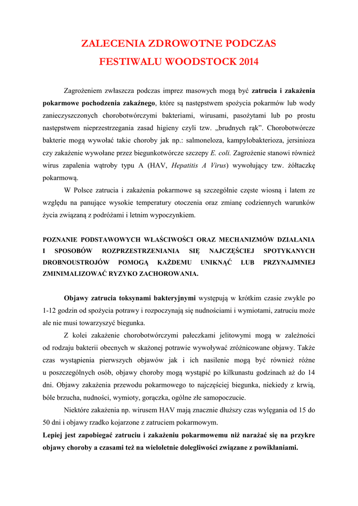zalecenia zdrowotne podczas festiwalu woodstock 2014