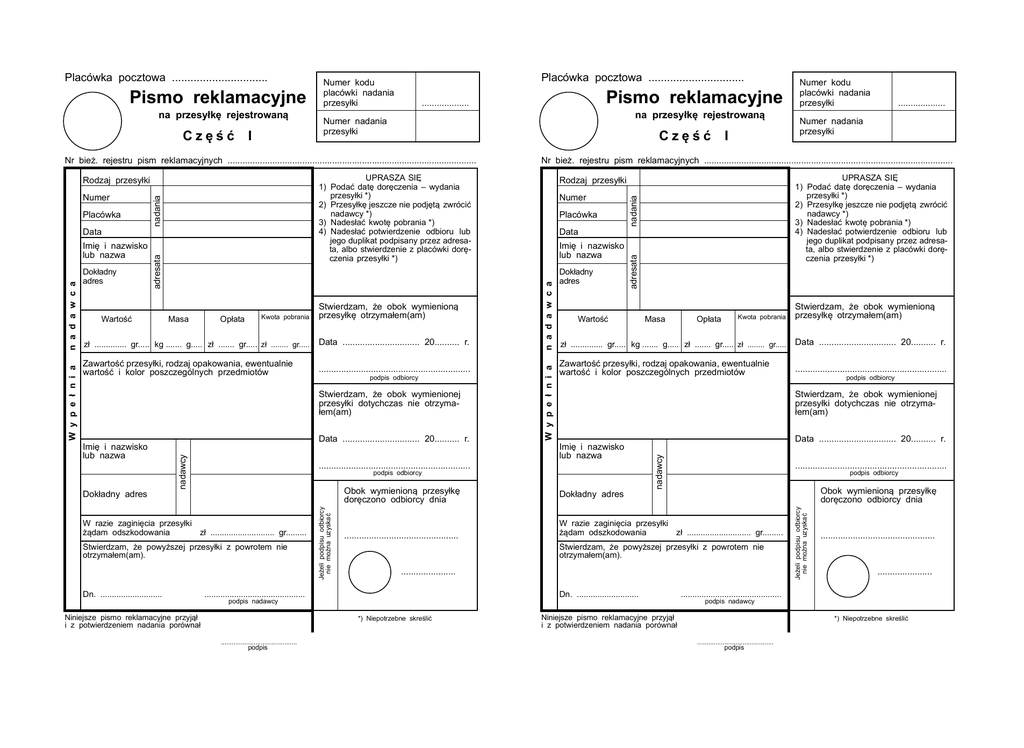 I na przesyłke˛ rejestrowana˛ Numer nadania przesyłki C z e˛ ś ć Nr bież. rejestru pism reklamacyjnych .................................................................................................... Wartość Masa Opłata Kwota pobrania Stwierdzam, że obok wymieniona˛ przesyłke˛ otrzymałem(am) zł .............. gr..... kg ....... g..... zł ....... gr..... zł ........ gr..... Data ............................... 20.......... r. Zawartość przesyłki, rodzaj opakowania, ewentualnie wartość i kolor poszczególnych przedmiotów ............................................................. podpis odbiorcy Stwierdzam, że obok wymienionej przesyłki dotychczas nie otrzymałem(am) Imie˛ i nazwisko lub nazwa Data ............................... 20.......... r. Placówka Data Imie˛ i nazwisko lub nazwa Dokładny adres Wartość Stwierdzam, że powyższej przesyłki z powrotem nie otrzymałem(am). Jeżeli podpisu odbiorcy nie można uzyskać W razie zaginie˛cia przesyłki ża˛dam odszkodowania zł ............................ gr......... .............................................. ............................................................. podpis odbiorcy Stwierdzam, że obok wymienionej przesyłki dotychczas nie otrzymałem(am) Imie˛ i nazwisko lub nazwa Data ............................... 20.......... r. ............................................................. podpis odbiorcy Obok wymieniona˛ przesyłke˛ dore˛czono odbiorcy dnia Dokładny adres W razie zaginie˛cia przesyłki ża˛dam odszkodowania zł ............................ gr......... Dn. ........................... *) Niepotrzebne skreślić Stwierdzam, że obok wymieniona˛ przesyłke˛ otrzymałem(am) Zawartość przesyłki, rodzaj opakowania, ewentualnie wartość i kolor poszczególnych przedmiotów ...................... podpis nadawcy .......................................... podpis Kwota pobrania Stwierdzam, że powyższej przesyłki z powrotem nie otrzymałem(am). ............................................ Niniejsze pismo reklamacyjne przyja˛ł i z potwierdzeniem nadania porównał Opłata Data ............................... 20.......... r. podpis odbiorcy Obok wymieniona˛ przesyłke˛ dore˛czono odbiorcy dnia Masa zł .............. gr..... kg ....... g..... zł ....... gr..... zł ........ gr..... ............................................................. Dokładny adres Dn. ........................... Numer n a d a w c a Dokładny adres nadawcy W y p e ł n i a n a d a w c a Imie˛ i nazwisko lub nazwa adresata Data Numer nadania przesyłki UPRASZA SIE˛ 1) Podać date˛ dore˛czenia – wydania przesyłki *) 2) Przesyłke˛ jeszcze nie podje˛ta˛ zwrócić nadawcy *) 3) Nadesłać kwote˛ pobrania *) 4) Nadesłać potwierdzenie odbioru lub jego duplikat podpisany przez adresata, albo stwierdzenie z placówki dore˛czenia przesyłki *) Rodzaj przesyłki W y p e ł n i a Placówka nadania Numer ................... Nr bież. rejestru pism reklamacyjnych .................................................................................................... UPRASZA SIE˛ 1) Podać date˛ dore˛czenia – wydania przesyłki *) 2) Przesyłke˛ jeszcze nie podje˛ta˛ zwrócić nadawcy *) 3) Nadesłać kwote˛ pobrania *) 4) Nadesłać potwierdzenie odbioru lub jego duplikat podpisany przez adresata, albo stwierdzenie z placówki dore˛czenia przesyłki *) Rodzaj przesyłki I Numer kodu placówki nadania przesyłki Jeżeli podpisu odbiorcy nie można uzyskać C z e˛ ś ć Pismo reklamacyjne ................... nadawcy na przesyłke˛ rejestrowana˛ nadania Pismo reklamacyjne Placówka pocztowa ............................... Numer kodu placówki nadania przesyłki adresata Placówka pocztowa ............................... .............................................. ...................... ............................................ podpis nadawcy Niniejsze pismo reklamacyjne przyja˛ł i z potwierdzeniem nadania porównał *) Niepotrzebne skreślić .......................................... podpis Część II Załatwienie pisma reklamacyjnego na przesyłki rejestrowane zapisywane pojedynczo lub zbiorowo oraz poszukiwanie przesyłki rejestrowanej, zapisywanej pojedynczo – drogą przemieszczania dnia pod numerem oddawczym dnia do: dnia do: 2 3 4 5 6 7 8 *) Słowa nieodpowiednie skreślić PP S.A. nr 92 wysłano dalej *) Zapisywana zbiorowo, w razie jej nadejścia wysłana dalej ekspedycją (wypełnić także rubr. 7 i 8) 9 nie nadeszła do miejsca przeznaczenia **) 1 Numer bieżący rejestru pism reklamacyjnych Nazwa placówki pocztowej, która załatwia pismo reklamacyjne dosłano adresatowi *) zwrócono nadawcy *) leży nie podjęta **) Reklamowana(ą) przesyłka(ę) doręczono (wydano) uprawnionemu do odbioru Uwagi 10 11 12 Podpis pracownika pocztowego i data załatwienia pisma reklamacyjnego 13 **) w danym wypadku w odnoś nej pozycji wstawić „1” Wydział Poligrafii CI Wrocław 2012