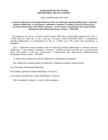 ZARZĄDZENIE NR 153/2016 BURMISTRZA MIASTA ŻARÓW z dnia 4 października 2016 roku w sprawie ogłoszenia otwartego konkursu ofert na realizację zadania publicznego w zakresie pomocy społecznej, w tym pomocy rodzinom i osobom w trudnej sytuacji życiowej oraz wyrównywania szans tych rodzin i osób pn.: „Utworzenie i wyposażenie oraz zapewnienie funkcjonowania Dziennego Domu „Senior – WIGOR”. Na podstawie art. 30 ust. 1 ustawy z dnia 8 marca 1990 roku o samorządzie gminnym (t.j. Dz. U. z 2016 roku poz. 446), art. 11 ust. 2 oraz art. 13 ustawy z dnia 24 kwietnia 2003 r. o działalności pożytku publicznego i o wolontariacie (t.j. Dz. U. z 2016r., poz. 239 z późn. zm.) zarządzam, co następuje: § 1. 1. Ogłaszam otwarty konkurs ofert na realizację zadania publicznego w zakresie pomocy społecznej, w tym pomocy rodzinom i osobom w trudnej sytuacji życiowej oraz wyrównywania szans tych rodzin i osób pn.: „Utworzenie i wyposażenie oraz zapewnienie funkcjonowania Dziennego Domu „Senior – WIGOR”. 2. Ogłoszenie o konkursie stanowi załącznik do niniejszego zarządzenia. § 2. Ogłoszenie zostaje podane do publicznej wiadomości poprzez umieszczenie: a) w Biuletynie Informacji Publicznej, b) na tablicy ogłoszeń Urzędu Miejskiego w Żarowie, c) na stronie internetowej Urzędu Miejskiego w Żarowie. § 3. Zarządzenie wchodzi w życie z dniem podjęcia. Uzasadnienie Zgodnie z art. 13 ustawy z dnia 24 kwietnia 2003r. o działalności pożytku publicznego i o wolontariacie (t.j. Dz. U. z 2016r., poz. 239 z późn zm.) organ administracji publicznej zamierzający zlecić realizację zadania publicznego organizacjom pozarządowym lub podmiotom wymienionym w art. 3 ust. 3, ogłasza otwarty konkurs ofert. W związku z powyższym uzasadnionym jest podjęcie niniejszego zarządzenia. Załącznik do Zarządzenia Nr 153/2016 Burmistrza Miasta Żarów z dnia 4 października 2016r. UTWORZENIE I WYPOSAŻENIE ORAZ DZIENNEGO DOMU „SENIOR – WIGOR” ZAPEWNIENIE FUNKCJONOWANIA Organizator: Burmistrz Miasta Żarów Na podstawie art. 25 ustawy z dnia 12 marca 2004 r. o pomocy społecznej (t.j. Dz. U. z 2016 r., poz. 930) i art. 13 ustawy z dnia 24 kwietnia 2003 roku o działalności pożytku publicznego i o wolontariacie (t.j. Dz. U. z 2016r., poz. 239), w związku z Uchwałą nr XIV/108/2015 Rady Miejskiej w Żarowie z dnia 19 listopada 2015 roku w sprawie rocznego programu współpracy Gminy Żarów z organizacjami pozarządowymi oraz podmiotami prowadzącymi działalność pożytku publicznego na 2016 rok, Burmistrz Miasta Żarów ogłasza otwarty konkurs ofert na realizację zadania publicznego w zakresie pomocy społecznej, w tym pomocy rodzinom i osobom w trudnej sytuacji życiowej oraz wyrównywania szans tych rodzin i osób pn.: „Utworzenie i wyposażenie oraz zapewnienie funkcjonowania Dziennego Domu „Senior – WIGOR”. I. Rodzaj zadania i wysokość środków publicznych przeznaczonych na realizację w 2016 roku: Utworzenie i wyposażenie oraz funkcjonowanie Dziennego Domu „Senior – WIGOR” w Żarowie – w kwocie 79 125 zł (słownie: siedemdziesiąt dziewięć tysięcy sto dwadzieścia pięć złotych), spełniającego niniejsze standardy: 1) lokalowe: Dzienny Dom „Senior – WIGOR” pozbawiony barier funkcjonalnych, tj. barier uniemożliwiających korzystanie z miejsc, obiektów budowlanych, budynków i lokali, mebli i sprzętów, uwzględniający: - 1 pomieszczenie ogólnodostępne wyposażone w stoły i krzesła, pełniące funkcję sali spotkań, jadalni, posiadające podłogi antypoślizgowe, - pomieszczenie kuchenne lub aneks kuchenny, wyposażony w sprzęty, urządzenia i naczynia do przygotowania i spożycia posiłku przygotowywanego przez seniorów, - 1 pomieszczenie klubowe z biblioteczką i prasą, wyposażone w sprzęt RTV, komputer z dostępem do Internetu, kanapy i fotele, - 1 pomieszczenie do utrzymania lub zwiększenia aktywności ruchowej lub kinezyterapii, wyposażone w podstawowy sprzęt dostosowany do potrzeb i sprawności seniorów (np. materace, leżanka, drabinki), - pomieszczenie do odpoczynku z min. 5 miejscami do leżenia, - pomieszczenie do terapii indywidualnej lub poradnictwa rozumianego jako szeroko pojęta praca socjalna, - pomieszczenia pełniące funkcję szatni dla seniorów i personelu, z indywidualnymi szafkami, - 1 łazienkę wyposażoną w dwie toalety (dla kobiet i mężczyzn), zapewniające odpowiednią przestrzeń manewrową oraz wyposażone w uchwyty przy toalecie, odpowiednio przystosowaną umywalkę i prysznic z krzesełkiem, uchwyty pod prysznicem, - wydzielone miejsce w łazience na pralkę, wyposażone w prasowalnicę i suszarkę na ubrania, - pokój pielęgniarski, - plac z ogrodem (koszty związane z urządzeniem placu nie są kwalifikowalne w ramach dotacji). Koszty adaptacji w/w pomieszczeń zgodnie z wytycznymi Programu „Senior – WIGOR”: 15.000 zł z przeznaczeniem na roboty malarskie, elektryczne, wykończeniowe, hydrauliczne, budowlano – malarskie z armaturą i montażem uchwytów w łazience. Koszty wyposażenia w/w pomieszczeń zgodnie z wytycznymi Programu „Senior – WIGOR” w łącznej wysokości 48 300 zł z przeznaczeniem na: - dywan antypoślizgowy – 2000 zł - 2 kuchenki elektryczne dwupalnikowe – 1200 zł - mały sprzęt agd: toster, opiekacz, mikrofalówka – 1000 zł - lodówka – 1500 zł - meble kuchenne, stolik + krzesła – 3500 zł - zastawa + sztućce – 1000 zł - wykładzina antypoślizgowa – 2000 zł - odkurzacz – 500 zł - radio CD – 500 zł - telewizor 40” – 2000 zł - stolik, przeszklone szafki na książki – 2000 zł - kanapa + fotele – 3000 zł - Lampki do czytania (2 szt.) – 600 zł - Komputer z oprogramowaniem (2 szt.) – 5000 zł - sprzęt Ugul – kabina do ćwiczeń – 2500 zł - kozetki regulowane (2 szt.) – 1000 zł - materace do ćwiczeń (2 szt.) – 500 zł - rower stacjonarny (2 szt.) – 800 zł - bieżnia – 1000 zł - ł