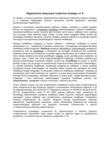 Wyjaśnienia dotyczące kryterium dostępu nr 8 W związku z licznymi pytaniami projektodawców dotyczącymi spełnienia kryterium dostępu nr 8 Instytucja Ogłaszająca Konkurs zamieszcza poniżej wyjaśnienie dotyczące przedmiotowego zagadnienia. Zgodnie z brzmieniem przedmiotowego kryterium dostępu „szkolenia w ramach projektu kończą się egzaminem i uzyskaniem certyfikatu potwierdzającego uzyskane kwalifikacje”. Uzyskanie kwalifikacji należy rozumieć jako formalny wynik oceny i walidacji, który uzyskuje się w sytuacji, kiedy właściwy organ uznaje, iż dana osoba osiągnęła efekty uczenia się spełniające określone standardy. Kryterium dostępu zostanie spełnione w przypadku szkoleń kończących się egzaminem potwierdzającym zdobyte kwalifikacje. Nadanie kwalifikacji następuje w wyniku walidacji i certyfikacji. Walidacja to proces sprawdzania, czy – niezależnie od sposobu uczenia się – kompetencje wymagane dla danej kwalifikacji zostały osiągnięte. Walidacja obejmuje identyfikację i dokumentację posiadanych kompetencji oraz ich weryfikację w odniesieniu do wymagań określonych dla kwalifikacji. Walidacja powinna być prowadzona w sposób trafny (weryfikowane są te efekty uczenia się, które zostały określone dla danej kwalifikacji) i rzetelny (wynik weryfikacji jest niezależny od miejsca, czasu, metod oraz osób przeprowadzających walidację). Wynikiem walidacji jest decyzja potwierdzająca posiadanie efektów uczenia się. Certyfikacja to proces, w wyniku którego uczący się otrzymuje od upoważnionej instytucji formalny dokument, stwierdzający, ze uzyskał określoną kwalifikację. Certyfikacja następuje po walidacji, w wyniku wydania pozytywnej decyzji stwierdzającej, że wszystkie efekty uczenia się wymagane dla danej kwalifikacji zostały osiągnięte. W przypadku niektórych kwalifikacji certyfikacja i walidacja są prowadzone przez różne podmioty (np. egzamin na prawo jazdy przeprowadza Wojewódzki Ośrodek Ruchu Drogowego, natomiast dokument, tj. prawo jazdy, wydaje starosta powiatu). Certyfikaty i inne dokumenty potwierdzające uzyskanie kwalifikacji powinny być rozpoznawalne i uznawane w danym środowisku, sektorze lub branży. Ocena efektów uczenia się oraz potwierdzenie kwalifikacji muszą zostać przeprowadzone przez uprawnioną do tego instytucję. Zgodnie z opracowaniem (stanowiącym załącznik nr 23 do zaktualizowanego dnia 28.08.2015 r. Regulaminu konkursu nr POWR.01.02.02-IP.23-04001/15) przygotowanym przez IZ PO WER poprzez właściwy organ uprawniony do formalnego potwierdzania uzyskania kwalifikacji należy rozumieć instytucje zapewniające odpowiedni proces walidacji oraz certyfikowania uzyskiwania kwalifikacji. Przykładami instytucji certyfikujących są: uczelnie, okręgowe komisje egzaminacyjne, instytucje szkoleniowe, stowarzyszenia zawodowe, organy administracji publicznej lub instytucje przeprowadzające egzaminy (np. językowe, finansowe, komputerowe) w oparciu o międzynarodowe standardy egzaminacyjne. Projektodawca posiadający uprawnienia do egzaminowania w zakresie zgodnym z realizowanymi szkoleniami może zostać uznany za właściwy organ do potwierdzania kwalifikacji, o ile spełnia warunki określone w załączniku nr 23.