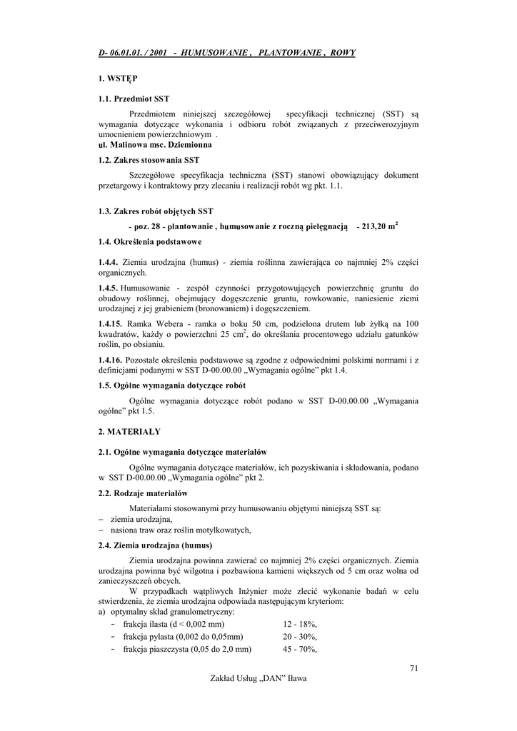 D- 06.01.01. / 2001 - HUMUSOWANIE , PLANTOWANIE , ROWY Przedmiotem niniejszej szczegółowej specyfikacji technicznej (SST) są wymagania dotyczące wykonania i odbioru robót związanych z przeciwerozyjnym umocnieniem powierzchniowym . Szczegółowe specyfikacja techniczna (SST) stanowi obowiązujący dokument przetargowy i kontraktowy przy zlecaniu i realizacji robót wg pkt. 1.1. $ ! % ! " * + # " , & # ' & % ( ) # " # Ziemia urodzajna (humus) - ziemia roślinna zawierająca co najmniej 2% części organicznych. * * Humusowanie - zespół czynności przygotowujących powierzchnię gruntu do obudowy roślinnej, obejmujący dogęszczenie gruntu, rowkowanie, naniesienie ziemi urodzajnej z jej grabieniem (bronowaniem) i dogęszczeniem. * - Ramka Webera - ramka o boku 50 cm, podzielona drutem lub żyłką na 100 kwadratów, każdy o powierzchni 25 cm2, do określania procentowego udziału gatunków roślin, po obsianiu. * - Pozostałe określenia podstawowe są zgodne z odpowiednimi polskimi normami i z definicjami podanymi w SST D-00.00.00 „Wymagania ogólne” pkt 1.4. * - . + ' ' & Ogólne wymagania dotyczące robót podano w SST D-00.00.00 „Wymagania ogólne” pkt 1.5. / + 0 ' 1 2 / 3 4 ' & 5 Ogólne wymagania dotyczące materiałów, ich pozyskiwania i składowania, podano w SST D-00.00.00 „Wymagania ogólne” pkt 2. 1 5 Materiałami stosowanymi przy humusowaniu objętymi niniejszą SST są: − ziemia urodzajna, − nasiona traw oraz roślin motylkowatych, * 6 ! 7 Ziemia urodzajna powinna zawierać co najmniej 2% części organicznych. Ziemia urodzajna powinna być wilgotna i pozbawiona kamieni większych od 5 cm oraz wolna od zanieczyszczeń obcych. W przypadkach wątpliwych Inżynier może zlecić wykonanie badań w celu stwierdzenia, że ziemia urodzajna odpowiada następującym kryteriom: a) optymalny skład granulometryczny: - frakcja ilasta (d < 0,002 mm) 12 - 18%, - frakcja pylasta (0,002 do 0,05mm) 20 - 30%, - frakcja piaszczysta (0,05 do 2,0 mm) 45 - 70%, 71 Zakład Usług „DAN” Iława > 20 mg/m2, > 30 mg/m2, ≥ 5,5. b) zawartość fosforu (P2O5) c) zawartość potasu (K2O) d) kwasowość pH - Wybór gatunków traw należy dostosować do rodzaju gleby i stopnia jej zawilgocenia. Zaleca się stosować mieszanki traw o drobnym, gęstym ukorzenieniu, spełniające wymagania PN-R-65023:1999 [9] i PN-B-12074:1998 [4]. 1 + ' ' & # Ogólne wymagania dotyczące sprzętu podano w SST D-00.00.00 „Wymagania ogólne” pkt 3. # Wykonawca przystępujący do wykonania umocnienia techniczno-biologicznego powinien wykazać się możliwością korzystania z następującego sprzętu: − równiarek, − ew. walców gładkich, żebrowanych lub ryflowanych, − ubijaków o ręcznym prowadzeniu, − wibratorów samobieżnych, − płyt ubijających, − ew. sprzętu do podwieszania i podciągania, * * 1 / + ' + 1 ' & # Ogólne wymagania dotyczące transportu podano w SST D-00.00.00 „Wymagania ogólne” pkt 4. * 5 # * Transport nasion traw , humusu Nasiona traw , humus można przewozić dowolnymi środkami transportu w warunkach zabezpieczających je przed zawilgoceniem. - - 4 + ' + / 2 0 1 + Ogólne zasady wykonania robót podano w SST D-00.00.00 „Wymagania ogólne” pkt 5. - # # Należy uzyskać podane poniżej wymiary geometryczne rowu i skarp, zgodne z PN-S-02204 [1]: - dla rowu przydrożnego w kształcie: a) trapezowym - szerokość dna co najmniej 0,40 m, nachylenie skarp od 1:1,5 do 1:1,3, głębokość od 0,30 m do 1,20 m liczona jako różnica poziomów dna i niższej krawędzi górnej rowu; b) trójkątnym - dno wyokrąglone łukiem kołowym o promieniu 0,50 m, nachylenie skarpy wewnętrznej 1:3, nachylenie skarpy zewnętrznej od 1:3 do 1:10, głębokość od 0,30 m do 1,50 m liczona jako różnica poziomów dna i niższej krawędzi górnej rowu; Największy spadek podłużny rowu nie powinien przekraczać: a) przy nieumocnionych skarpach i dnie - w gruntach piaszczystych - 1,5%, - w gruntach piaszczysto-gliniastych, pylastych - 2,0%, - w gruntach gliniastych i ilastych - 3,0%, 72 Zakład Usług „DAN” Iława - w gruntach skalistych - 10,0%; b) przy umocnionych skarpach i dnie - matą trawiastą - 2,0%, - darniną - 3,0%, - faszyną - 4,0%, - brukiem na sucho - 6,0%, - elementami betonowymi - 10,0%, - brukiem na podsypce cementowo-piaskowej - 15,0%. - Humusowanie powinno być wykonywane od górnej krawędzi skarpy do jej dolnej krawędzi. Warstwa ziemi urodzajnej powinna sięgać poza górną krawędź skarpy i poza podnóże skarpy nasypu od 15 do 25 cm . Grubość pokrycia ziemią urodzajną powinna wynosić od 10 do 15 cm po moletowaniu i zagęszczeniu, w zależności od gruntu występującego na powierzchni skarpy. W celu lepszego powiązania warstwy ziemi urodzajnej z gruntem, na powierzchni skarpy należy wykonywać rowki poziome lub pod kątem 30o do 45o o głębokości od 3 do 5 cm, w odstępach co 0,5 do 1,0 m. Ułożoną warstwę ziemi urodzajnej należy zagrabić (pobronować) i lekko zagęścić przez ubicie ręczne lub mechaniczne. Zakres humusowania ustalić z Inżynierem. - * & , # Proces umocnienia powierzchni poprzez obsianie nasionami traw i roślin motylkowatych polega na: a) wytworzeniu warstwy ziemi urodzajnej przez: - humusowanie (patrz pkt 5.2), lub, b) obsianiu warstwy ziemi urodzajnej kompozycjami nasion traw, roślin motylkowatych i bylin w ilości od 18 g/m2 do 30 g/m2, dobranych odpowiednio do warunków siedliskowych (rodzaju podłoża, wystawy oraz pochylenia skarp), W okresach posusznych należy systematycznie zraszać wodą obsiane powierzchnie. . . + + ' 1 + / / + 2 1 + , Ogólne zasady kontroli jakości robót podano w SST D-00.00.00 „Wymagania ogólne” pkt 6. . , ! Kontrola polega na ocenie wizualnej jakości wykonanych robót i ich zgodności z SST, oraz na sprawdzeniu daty ważności świadectwa wartości siewnej wysianej mieszanki nasion traw. Po wzejściu roślin, łączna powierzchnia nie porośniętych miejsc nie powinn