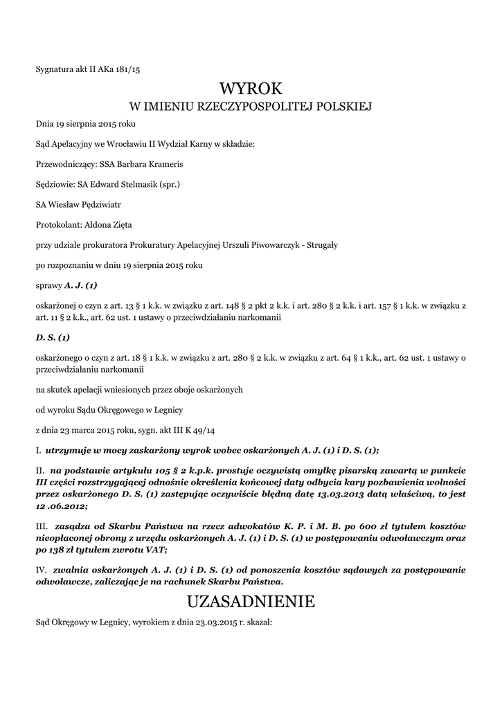 Sygnatura akt II AKa 181/15 WYROK W IMIENIU RZECZYPOSPOLITEJ POLSKIEJ Dnia 19 sierpnia 2015 roku Sąd Apelacyjny we Wrocławiu II Wydział Karny w składzie: Przewodniczący: SSA Barbara Krameris Sędziowie: SA Edward Stelmasik (spr.) SA Wiesław Pędziwiatr Protokolant: Aldona Zięta przy udziale prokuratora Prokuratury Apelacyjnej Urszuli Piwowarczyk - Strugały po rozpoznaniu w dniu 19 sierpnia 2015 roku sprawy A. J. (1) oskarżonej o czyn z art. 13 § 1 k.k. w związku z art. 148 § 2 pkt 2 k.k. i art. 280 § 2 k.k. i art. 157 § 1 k.k. w związku z art. 11 § 2 k.k., art. 62 ust. 1 ustawy o przeciwdziałaniu narkomanii D. S. (1) oskarżonego o czyn z art. 18 § 1 k.k. w związku z art. 280 § 2 k.k. w związku z art. 64 § 1 k.k., art. 62 ust. 1 ustawy o przeciwdziałaniu narkomanii na skutek apelacji wniesionych przez oboje oskarżonych od wyroku Sądu Okręgowego w Legnicy z dnia 23 marca 2015 roku, sygn. akt III K 49/14 I. utrzymuje w mocy zaskarżony wyrok wobec oskarżonych A. J. (1) i D. S. (1); II. na podstawie artykułu 105 § 2 k.p.k. prostuje oczywistą omyłkę pisarską zawartą w punkcie III części rozstrzygającej odnośnie określenia końcowej daty odbycia kary pozbawienia wolności przez oskarżonego D. S. (1) zastępując oczywiście błędną datę 13.03.2013 datą właściwą, to jest 12 .06.2012; III. zasądza od Skarbu Państwa na rzecz adwokatów K. P. i M. B. po 600 zł tytułem kosztów nieopłaconej obrony z urzędu oskarżonych A. J. (1) i D. S. (1) w postępowaniu odwoławczym oraz po 138 zł tytułem zwrotu VAT; IV. zwalnia oskarżonych A. J. (1) i D. S. (1) od ponoszenia kosztów sądowych za postępowanie odwoławcze, zaliczając je na rachunek Skarbu Państwa. UZASADNIENIE Sąd Okręgowy w Legnicy, wyrokiem z dnia 23.03.2015 r. skazał: 1) A. J. (1) : I. za czyn z art. 13 § 1 k.k. w zw. z art. 148 § 2 p. 2 k.k. w zw. z art. 280 § 2 k.k. i art. 157 § 1 k.k. w zw. z art. 11 § 2 k.k.: - na karę 13 lat pozbawienia wolności: - oraz orzekł względem niej nawiązkę na rzecz pokrzywdzonej, na podstawie art. 46 § 2 k.k. w kwocie 20.000 zł. II. za czyn z art. 62 ustawy 1 ustawy o przeciwdziałaniu narkomanii na 3 miesiące pozbawienia wolności; III. na podstawie art. 85 i 86 § 1 k.k. oraz art. 63 § 1 k.k. na karę łączną 13 lat pozbawienia wolności zaliczając na jej poczet okres tymczasowego aresztowania od 18 lipca 2013 r. do 23.03.2015 r.; 2) D. S. (1): I. za czyn z art. 18 § 1 k.k. w zw. z art. 280 § 2 k.k. w zw. z art. 64 § 1 k.k. na: - 8 lat pozbawienia wolności - oraz orzekł względem niego nawiązkę na rzecz pokrzywdzonej w kwocie 20.000 zł. II. za czyn z art. 62 ust. 1 ustawy o przeciwdziałaniu narkomanii na 6 miesięcy pozbawienia wolności; III. na podstawie art. 85, 86 § 1 i 63 § 1 k.k. wymierzył mu karę łączną 8 lat pozbawienia wolności zaliczając na jej poczet okresy tymczasowego aresztowania tego oskarżonego: - od 18.07.2013 r. – do 16.10.2013 r. - od 15.11.2013 r. – do 21.03.2014 r. - od 18.12.2014 r. – do 23.03.2015 r. (sygn. akt III K 49/14) Wyrok powyższy zaskarżyli obrońcy obojga oskarżonych. Obrończyni osk. A. J. (1) zaskarżyła wyrok w zakresie skazania tej oskarżonej za czyn z art. 13 § 1 k.k. w zw. z art. 148 § 2 p. 2 k.k. zarzucając: 1) przede wszystkim błąd w ustaleniach faktycznych polegający : a) na przyjęciu, że oskarżona zamierzała pozbawić życia pokrzywdzoną A. M., chociaż jej zamiarem było wyłącznie obrabowanie tej pokrzywdzonej b) względnie – nawet przy założeniu trafności ustalenia, iż oskarżona A. J. zamierzała pozbawić życia A.M., błędne przyjęcie, iż czyniła to z zamiarem bezpośrednim, gdy faktycznie można jej przypisać co najwyżej zamiar ewentualny w tym zakresie; 2) alternatywnie – zarzuciła, iż kara nawiązka wymierzone tej oskarżonej rażą surowością z uwagi na nieuwzględnienie w należytym stopniu charakteru relacji łączących ją z oskarżonym D. S. (1), w tym zwłaszcza stopnia emocjonalnego uzależnienia jej a także z powodu pozytywnej postawy tej oskarżonej w trakcie postępowania karnego (przyznanie się do winy). W konsekwencji, jak to wynika m.in. z analizy uzasadnienia apelacji, skarżąca ta domaga się zmiany zaskarżonego wyroku przez: - przyjęcie, iż A. J. (1) dopuściła się zarzuconej zbrodni z ewentualnym, a nie bezpośrednim, zamiarem zabójstwa pokrzywdzonej, - skazanie tej oskarżonej na karę z zastosowaniem instytucji z art. 60 k.k. Obrończyni osk. D. S. (1) także zaskarżyła wyrok w zakresie skazania tego sprawcy za czyn z art. 18 § 1 k.k. w zw. z art. 280 § 2 k.k. zarzucając: 1) błędne uznanie, iż dopuścił się on tego przestępstwa, 2) alternatywnie, że kara wymierzona oskarżonemu za ten czyn razi surowością. Wniosła w konsekwencji o zmianę tego wyroku przez: 1) uniewinnienie oskarżonego od czynu z art. 18 § 1 k.k. w zw. z art. 280 § 2 k.k.; 2) alternatywnie – o złagodzenie kary wymierzonej za to przestępstwo. Sąd Apelacyjny zważył co następuje. Na wstępie zasygnalizować należy, iż nie uwzględniono żadnej z wniesionych apelacji. Na uzasadnienie swego stanowiska przedstawia Sąd Odwoławczy następujące argumenty: I. Ocena zarzutów podniesionych przez obrończynię osk. A. J. (1). Jak to już wyżej zasygnalizowano, nie została uwzględniona żadna z apelacji a więc i apelacja obrończyni A. J.. Przypomnieć w tym miejscu należy, iż wymieniona oskarżona została skazana za dwa czyny a mianowicie: 1) usiłowanie zabójstwa A.M. (p. I wyroku), 2) posiadanie marihuany i amfetaminy (p.II). W apelacji zaskarżone zostało jedynie to pierwsze rozstrzygnięcie. Nie będzie wobec tego przedmiotem rozważań Sądu Apelacyjnego rozstrzygnięcie z p. II, zwłaszcza, że nie budzi ono merytorycznych zastrzeżeń. Sąd Apelacyjny nie widzi także podstaw do uwzględnienia zarzutów podniesionych co do rozstrzygania z p. I. Przed podaniem argumentów, uzasadniających t
