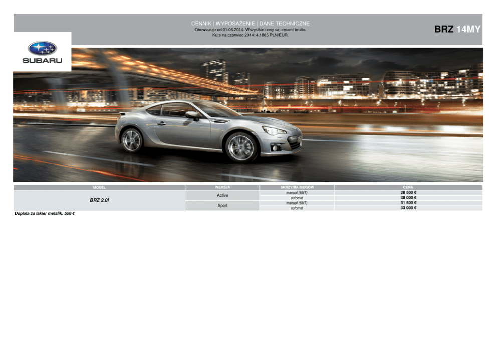 CENNIK | WYPOSAŻENIE | DANE TECHNICZNE BRZ 14MY Obowiązuje od 01.06.2014. Wszystkie ceny są cenami brutto. Kurs na czerwiec 2014: 4,1885 PLN/EUR. MODEL WERSJA Active BRZ 2.0i Sport Dopłata za lakier metalik: 550 € SKRZYNIA BIEGÓW CENA manual (6MT) automat manual (6MT) automat 28 500 € 30 000 € 31 500 € 33 000 € WYPOSAŻENIE -2- BRZ 2.0i Active Sport manual(6MT) automat manual(6MT) automat WYPOSAŻENIE WNĘTRZA dodatkowe gniazdo AUX i USB dla zewnętrznego odtwarzacza MP3 dźwignia hamulca ręcznego obszyta skórą dźwignia zmiany biegów obszyta skórą elektrycznie sterowane szyby przednie fotel kierowcy z regulacja wysokości kierownica obszyta skórą klimatyzacja automatyczna klimatyzacja manualna kolumna kierownicy regulowana w dwóch płaszczyznach komputer pokładowy konsola środkowa ze zintegrowanym schowkiem kontrolka poziomu paliwa lusterka w osłonach przeciwsłonecznych manetki zmiany biegów przy kierownicy obrotomierz oświetlenie przestrzeni bagażowej składane oparcia tylnych foteli skórzana tapicerka (częściowo) system audio z odtwarzaczem CD z 6 głośnikami system montażu fotelików dziecięcych ISOFIX dla 2 fotelików dziecięcych termometr zewnętrzny uruchamianie silnika za naciśnięciem przycisku Start/Stop wlew paliwa otwierany pilotem wnętrze w kolorze czarnym wnętrze w kolorze srebrnym zegar cyfrowy zestaw naprawczy kół wyposażenie seryjne wyposażenie niedostępne wyposażenie opcjonalne Subaru Import Polska sp. z o.o. podjęło wszelkie środki, aby zawarte w niniejszej specyfikacji informacje były dokładne i aktualne w chwili oddania do druku. W ramach polityki stałego ulepszania swoich produktów Subaru zastrzega sobie prawo do zmiany specyfikacji i wyposażenia opisanych i przedstawionych pojazdów bez uprzedzenia. O zmianach tych autoryzowani partnerzy Subaru będą powiadamiani w możliwie najkrótszym terminie. Niniejsza specyfikacja nie stanowi oferty sprzedaży w rozumieniu prawa. WYPOSAŻENIE -3- BRZ 2.0i Active Sport manual(6MT) automat manual(6MT) automat WYPOSAŻENIE ZEWNĘTRZNE klamki zewnętrzne w kolorze nadwozia lakier metalik/perłowy lusterka zewnętrzne podgrzewane lusterka zewnętrzne regulowane elektrycznie lusterka zewnętrzne składane elektrycznie lusterka zewnętrzne w kolorze nadwozia podgrzewanie szyby tylnej przyciemniane szyby reflektory ksenonowe przednie reflektory przeciwmgłowe reflektory przednie ze spryskiwaczami system klucza elektronicznego Keyless Access światła LED do jazdy dziennej tylny spojler w kolorze nadwozia wycieraczki szyby przedniej z regulowaną prędkością zamek centralny sterowany pilotem zderzaki w kolorze nadwozia BRZ 2.0i Active Sport manual(6MT) automat manual(6MT) automat Inteligentny System ratunkowy używając sygnału GPS przekazuje automatycznie w sytuacji awaryjnej informacje do stale funkcjonującego centrum monitoringu. Umożliwia to natychmiastowe zweryfikowanie zdarzenia i powiadomienie właściwych służb w celu szybkiej i sprawnej organizacji pomocy. kolanowa poduszka powietrzna kurtyny powietrzne (przód/tył) mechanizm różnicowy o zwiększonym tarciu typu Torsen napęd na tylne koła poduszki powietrzne kierowcy i pasażera (boczne) poduszki powietrzne kierowcy i pasażera (przednie) przednie hamulce tarczowe (wentylowane) system kontroli trakcji i stabilizacji toru jazdy (VSC) szkolenie w Szkole Jazdy Subaru Bezpłatne szkolenie dedykowane modelom z napędem na tylną oś. tempomat wspomaganie układu kierowniczego wzmocnienia boczne nadwozia TECHNIKA / BEZPIECZEŃSTWO 16-calowe felgi aluminiowe z oponami 205/55R16 17-calowe felgi aluminiowe z oponami 215/45R17 3-punktowe przednie pasy bezpieczeństwa z napinaczami ABS z funkcją EBD (elektroniczny rozdział sił hamowania) hamulce tarczowe tył immobilizer Inteligentny System Ratunkowy (ISR) wyposażenie seryjne wyposażenie niedostępne wyposażenie opcjonalne Subaru Import Polska sp. z o.o. podjęło wszelkie środki, aby zawarte w niniejszej specyfikacji informacje były dokładne i aktualne w chwili oddania do druku. W ramach polityki stałego ulepszania swoich produktów Subaru zastrzega sobie prawo do zmiany specyfikacji i wyposażenia opisanych i przedstawionych pojazdów bez uprzedzenia. O zmianach tych autoryzowani partnerzy Subaru będą powiadamiani w możliwie najkrótszym terminie. Niniejsza specyfikacja nie stanowi oferty sprzedaży w rozumieniu prawa. BRZ 2.0i DANE TECHNICZNE -4- Active manual(6MT) Sport automat manual(6MT) automat SILNIK typ i układ silnika wtrysk paliwa pojemność silnika moc silnika maksymalny moment obrotowy stopień sprężania norma emisji spalin średnica cylindra/skok cm3 kW (KM) / obr/min Nm/ obr/min mm 1998 147(200)/7000 205/6400-6600 12,5:1 Euro5 86,0/86,0 napęd napęd na tylne koła paliwa benzyna bezołowiowa 98 oktan silnik w układzie bokser, 4 cylindry, 16V, benzynowy bezpośredni, wielopunktowy 1998 1998 1998 147(200)/7000 147(200)/7000 147(200)/7000 205/6400-6600 205/6400-6600 205/6400-6600 12,5:1 12,5:1 12,5:1 Euro5 Euro5 Euro5 86,0/86,0 86,0/86,0 86,0/86,0 napęd na tylne koła (mechanizm napęd na tylne koła (mechanizm napęd na tylne koła różnicowy o zwiększonym tarciu typu różnicowy o zwiększonym tarciu typu Torsen) Torsen) benzyna bezołowiowa 98 oktan benzyna bezołowiowa 98 oktan benzyna bezołowiowa 98 oktan OSIĄGI prędkość maksymalna przyspieszenie (0-100 km/h) km/h s 230 7,6 210 8,2 226 7,6 210 8,2 l/100 km l/100 km l/100 km 9,0 5,7 6,9 9,4 5,5 6,9 10,4 6,4 7,8 9,6 5,7 7,1 g/km 159 159 181 164 mm mm mm mm mm mm mm l 4240 1775 1425 2570 1520 1540 130 50 4 2 1220 1670 10,8 205/55 R16 91V 6,5x16 0,27 4240 1775 1425 2570 1520 1540 130 50 4 2 1242 1700 10,8 205/55 R16 91V 6,5x16 0,27 4240 1775 1425 2570 1520 1540 130 50 4 2 1248 1670 10,8 215/45 R17 87V 7x17 0,28 4240 1775 1425 2570 1520 1540 130 50 4 2 1271 1700 10,8 215/45 R17 87V 7x17 0,27 ZUŻYCIE PALIWA cykl miejski cykl pozamiejski cykl mieszany EMISJA CO2 cykl mieszany WYMIAR