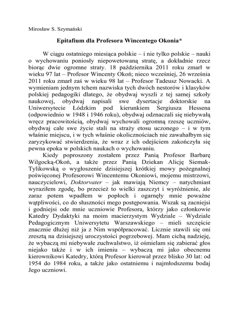 Mirosław S. Szymański Epitafium dla Profesora Wincentego Okonia* W ciągu ostatniego miesiąca polskie – i nie tylko polskie – nauki o wychowaniu poniosły niepowetowaną stratę, a dokładnie rzecz biorąc dwie ogromne straty. 18 października 2011 roku zmarł w wieku 97 lat – Profesor Wincenty Okoń; nieco wcześniej, 26 września 2011 roku zmarł zaś w wieku 98 lat – Profesor Tadeusz Nowacki. A wymieniam jednym tchem nazwiska tych dwóch nestorów i klasyków polskiej pedagogiki dlatego, że obydwaj wyszli z tej samej szkoły naukowej, obydwaj napisali swe dysertacje doktorskie na Uniwersytecie Łódzkim pod kierunkiem Sergiusza Hessena (odpowiednio w 1948 i 1946 roku), obydwaj odznaczali się niebywałą wręcz pracowitością, obydwaj wychowali ogromną rzeszę uczniów, obydwaj całe swe życie stali na straży etosu uczonego – i w tym właśnie miejscu, i w tych właśnie okolicznościach nie zawahałbym się zaryzykować stwierdzenia, że wraz z ich odejściem zakończyła się pewna epoka w polskich naukach o wychowaniu. Kiedy poproszony zostałem przez Panią Profesor Barbarę Wilgocką-Okoń, a także przez Panią Dziekan Alicję SiemakTylikowską o wygłoszenie dzisiejszej krótkiej mowy pożegnalnej poświęconej Profesorowi Wincentemu Okoniowi, mojemu mistrzowi, nauczycielowi, Doktorvater – jak mawiają Niemcy – natychmiast wyraziłem zgodę, bo przecież to wielki zaszczyt i wyróżnienie, ale zaraz potem wpadłem w popłoch i ogarnęły mnie poważne wątpliwości, co do słuszności mego postępowania. Wszak są zacniejsi i godniejsi ode mnie uczniowie Profesora, którzy jako członkowie Katedry Dydaktyki na moim macierzystym Wydziale – Wydziale Pedagogicznym Uniwersytetu Warszawskiego – mieli szczęście znacznie dłużej niż ja z Nim współpracować. Licznie stawili się oni zresztą na dzisiejszej uroczystości pogrzebowej. Mam cichą nadzieję, że wybaczą mi niebywałe zuchwalstwo, iż ośmielam się zabierać głos niejako także i w ich imieniu – wybaczą mi jako obecnemu kierownikowi Katedry, którą Profesor kierował przez blisko 30 lat: od 1954 do 1984 roku, a także jako ostatniemu i najmłodszemu bodaj Jego uczniowi. Wątpliwości dotyczyły też treści mego wystąpienia. O czymże tu bowiem mówić w tak szacownym gronie – i to w sytuacji, kiedy wszystko (lub prawie wszystko) to, co najważniejsze zostało napisane w pięknej księdze Jubileuszowej Profesora Wincentego Okonia (niezwykle starannie zredagowanej w 2009 roku przez Profesorów Andrzeja Bogaja i Henrykę Kwiatkowską, jego wybitnych uczniów zresztą) pod wielce wymownym tytułem Życie i dzieło z ideą wielostronności w tle; a wiele z tego, co ważne zostało dopowiedziane podczas sympatycznej uroczystości z okazji 95-lecia Profesora, która odbyła się 11 stycznia 2010 roku w Instytucie Badań Edukacyjnych (noszącym w swej historii różne nazwy), którym kierował On trzynaście lat: od 1961 do1974 roku. Można by oczywiście – jak w nekrologu sporządzonym przez Polską Akademię Nauk – drobiazgowo wymieniać kolejne funkcje, godności i zasługi Profesora: członek rzeczywisty Polskiej Akademii Nauk od 1973 roku, Przewodniczący Komitetu Nauk Pedagogicznych PAN w latach 1974-1984, dziekan Wydziału Pedagogicznego Uniwersytetu Warszawskiego w latach 1958-1960, Redaktor naczelny Kwartalnika Pedagogicznego w latach 1975-1984, Założyciel i członek Honorowy Polskiego Towarzystwa Pedagogicznego, członek wielu zagranicznych towarzystw i organizacji naukowych, ekspert UNESCO, doktor honoris causa polskich i zagranicznych uczelni itd., itp. Można to uczynić – tylko po co, skoro wszystkie te informacje znaleźć można bez trudu w kolejnych wydaniach nieocenionego Słownika pedagogicznego. Można by też oczywiście – jak w nekrologu sporządzonym przez Wydawnictwo Akademickie „Żak” – wymieniać główne dzieła Profesora, akcentując, że był głównym recenzentem monumentalnej, ośmiotomowej Encyklopedii Pedagogicznej XXI wieku. Można to uczynić – i znowu, tylko po co, skoro niechybnie wspomną o tym inni mówcy. A jeśli już o encyklopedii mowa, to znając poczucie humoru i autoironię Profesora sparafrazowałby On zapewne słowa Czesława Miłosza: o tak, nie cały zginę, zostanie po mnie / Wzmianka w czternastym tomie encyklopedii / w pobliżu setek Millerów i Mickey Mouse, sparafrazowałby te słowa, powiadając być może: o tak, nie cały zginę, zostanie po mnie / Wzmianka w dziewiętnastym tomie wielkiej encyklopedii PWN / w pobliżu innych okoniowatych i okoniokształtnych. O czymże więc tu mówić? Jeden tylko wątek poruszę, do czego zobowiązali mnie moi niemieccy koledzy, serdeczni przyjaciele Profesora od 30 z górą lat: Oskar Anweiler, Friedrich Busch, Jürgen Helmchen, Wolfgang Hörner, Wolfgang Mitter, Hein Retter, Dietmar Waterkamp, a także Sonja Steier. 21 października 2011 roku w imieniu ich wszystkich Friedrich Busch napisał do mnie między innymi te oto słowa: Właśnie przeczytałem wiadomość od ciebie i jest mi bardzo smutno. Zmarł wielki uczony, wspaniały przyjaciel, architekt niemiecko-polskiego pojednania. Jakkolwiek Wincenty osiągnął już podeszły wiek – w przyszłym roku ukończyłby 98 lat – to jego śmierć jest ogromną stratą dla nas wszystkich … Serdecznie pozdrawiamy Basię i prosimy o wyrażenie żalu całej rodzinie. Co niniejszym czynię – także i w imieniu całej społeczności akademickiej Wydziału Pedagogicznego Uniwersytetu Warszawskiego; a sądzę, że nie tylko. * * * Mowy pogrzebowe kończy się zazwyczaj jakimś pocieszeniem. Pozwólcie państwo, że będą to słowa największego bodaj poety greckiego czasów nowożytnych Konstandinosa Kawafisa Aleksandryjczyka (w tłumaczeniu Zygmunta Kubiaka): Czy naprawdę umarł Dokąd odszedł, gdzie zaginął mędrzec? Po dokonaniu cudów tak wielu i po tym, jak nauczanie jego zasłynęło wśród tylu narodów nagle ukrył s
