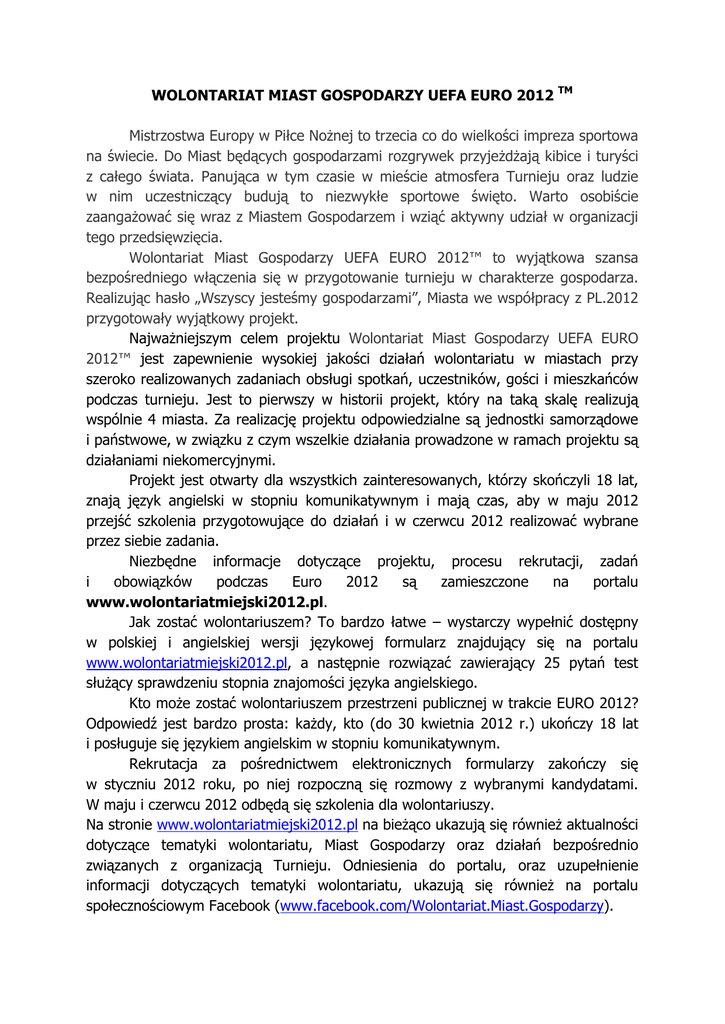 WOLONTARIAT MIAST GOSPODARZY UEFA EURO 2012 TM Mistrzostwa Europy w Piłce Nożnej to trzecia co do wielkości impreza sportowa na świecie. Do Miast będących gospodarzami rozgrywek przyjeżdżają kibice i turyści z całego świata. Panująca w tym czasie w mieście atmosfera Turnieju oraz ludzie w nim uczestniczący budują to niezwykłe sportowe święto. Warto osobiście zaangażować się wraz z Miastem Gospodarzem i wziąć aktywny udział w organizacji tego przedsięwzięcia. Wolontariat Miast Gospodarzy UEFA EURO 2012™ to wyjątkowa szansa bezpośredniego włączenia się w przygotowanie turnieju w charakterze gospodarza. Realizując hasło „Wszyscy jesteśmy gospodarzami”, Miasta we współpracy z PL.2012 przygotowały wyjątkowy projekt. Najważniejszym celem projektu Wolontariat Miast Gospodarzy UEFA EURO 2012™ jest zapewnienie wysokiej jakości działań wolontariatu w miastach przy szeroko realizowanych zadaniach obsługi spotkań, uczestników, gości i mieszkańców podczas turnieju. Jest to pierwszy w historii projekt, który na taką skalę realizują wspólnie 4 miasta. Za realizację projektu odpowiedzialne są jednostki samorządowe i państwowe, w związku z czym wszelkie działania prowadzone w ramach projektu są działaniami niekomercyjnymi. Projekt jest otwarty dla wszystkich zainteresowanych, którzy skończyli 18 lat, znają język angielski w stopniu komunikatywnym i mają czas, aby w maju 2012 przejść szkolenia przygotowujące do działań i w czerwcu 2012 realizować wybrane przez siebie zadania. Niezbędne informacje dotyczące projektu, procesu rekrutacji, zadań i obowiązków podczas Euro 2012 są zamieszczone na portalu www.wolontariatmiejski2012.pl. Jak zostać wolontariuszem? To bardzo łatwe – wystarczy wypełnić dostępny w polskiej i angielskiej wersji językowej formularz znajdujący się na portalu www.wolontariatmiejski2012.pl, a następnie rozwiązać zawierający 25 pytań test służący sprawdzeniu stopnia znajomości języka angielskiego. Kto może zostać wolontariuszem przestrzeni publicznej w trakcie EURO 2012? Odpowiedź jest bardzo prosta: każdy, kto (do 30 kwietnia 2012 r.) ukończy 18 lat i posługuje się językiem angielskim w stopniu komunikatywnym. Rekrutacja za pośrednictwem elektronicznych formularzy zakończy się w styczniu 2012 roku, po niej rozpoczną się rozmowy z wybranymi kandydatami. W maju i czerwcu 2012 odbędą się szkolenia dla wolontariuszy. Na stronie www.wolontariatmiejski2012.pl na bieżąco ukazują się również aktualności dotyczące tematyki wolontariatu, Miast Gospodarzy oraz działań bezpośrednio związanych z organizacją Turnieju. Odniesienia do portalu, oraz uzupełnienie informacji dotyczących tematyki wolontariatu, ukazują się również na portalu społecznościowym Facebook (www.facebook.com/Wolontariat.Miast.Gospodarzy). Jednolity program szkoleń w 4 Miastach Gospodarzach Wybrani w drodze rekrutacji wolontariusze w maju 2012 roku wezmą udział w trzydniowym programie szkoleń, którego zakres będzie uzależniony od roli, jaką będą oni pełnić w trakcie Turnieju. W ramach szkoleń podstawowych uzyskają wiedzę m.in. na temat turnieju Euro 2012 oraz z zakresu komunikacji interpersonalnej i międzykulturowej, pierwszej pomocy, czy bezpieczeństwa i bhp. Szkolenia dodatkowe pozwolą z kolei na uzyskanie wiedzy np. z zakresu topografii miasta, połączeń komunikacyjnych miejskich i międzymiastowych, umiejętności liderskich, reagowania w sytuacji kryzysowej oraz atrakcji turystycznych i kulturalno – rozrywkowych miasta i regionu. Zakres szkoleń będzie taki sam w każdym z 4 Miast Gospodarzy, co pozwoli na zachowanie jednolitego standardu obsługi świadczonej przez wolontariuszy w każdym z miast. Około 3000 wolontariuszy, którzy będą pracowali w trakcie Euro 2012 w Warszawie, Gdańsku, Poznaniu i Wrocławiu otrzyma jednolite w każdym mieście, specjalne stroje. Ułatwi to ich rozpoznawanie w przestrzeni miejskiej kibicom podróżującym w trakcie Euro 2012 pomiędzy poszczególnymi Miastami Gospodarzami. Oprócz tego wolontariusze otrzymają ubezpieczenie NNW, wyżywienie, nocleg, dostęp do zaplecza technicznego w centrum wolontariatu oraz będą mogli bezpłatnie korzystać z komunikacji miejskiej. Na zakończenie projektu każdy wolontariusz otrzyma także certyfikat. Na czym będzie polegała praca wolontariuszy Miast Gospodarzy UEFA EURO 2012? Do obowiązków ok. 3 tysięcy wolontariuszy będzie należało udzielanie informacji na temat Turnieju Euro 2012 i wydarzeń z nim związanych organizowanych w mieście, komunikacji miejskiej i międzymiastowej, pomocy medycznej, atrakcji turystycznych oraz kulturalno – rozrywkowych miasta i regionu. W Gdańsku będzie zaangażowanych łącznie około 600 wolontariuszy. Jakość obsługi i informacja – klucz do sukcesu imprezy O powodzeniu imprez masowych takich jak Euro 2012 decyduje nie tylko właściwe przygotowanie kraju od strony infrastrukturalnej. Doświadczenia organizatorów poprzednich turniejów UEFA EURO wskazują, że niezwykle ważne stadiony, drogi ekspresowe i autostrady, rozbudowane lotniska, czy dworce kolejowe, to nie jedyne elementy, które decydują o ostatecznym sukcesie imprezy.