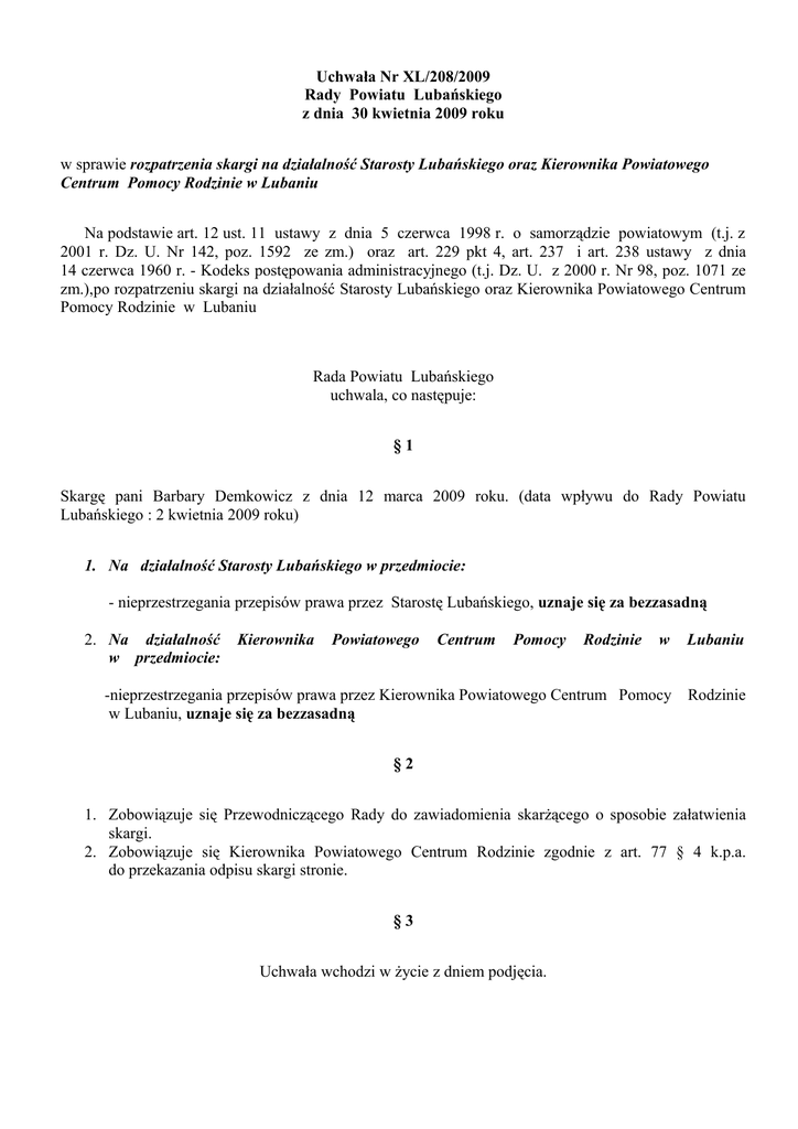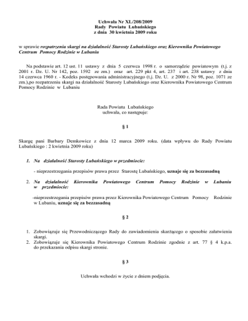 Uchwała Nr XL/208/2009 Rady Powiatu Lubańskiego z dnia 30 kwietnia 2009 roku w sprawie rozpatrzenia skargi na działalność Starosty Lubańskiego oraz Kierownika Powiatowego Centrum Pomocy Rodzinie w Lubaniu Na podstawie art. 12 ust. 11 ustawy z dnia 5 czerwca 1998 r. o samorządzie powiatowym (t.j. z 2001 r. Dz. U. Nr 142, poz. 1592 ze zm.) oraz art. 229 pkt 4, art. 237 i art. 238 ustawy z dnia 14 czerwca 1960 r. - Kodeks postępowania administracyjnego (t.j. Dz. U. z 2000 r. Nr 98, poz. 1071 ze zm.),po rozpatrzeniu skargi na działalność Starosty Lubańskiego oraz Kierownika Powiatowego Centrum Pomocy Rodzinie w Lubaniu Rada Powiatu Lubańskiego uchwala, co następuje: §1 Skargę pani Barbary Demkowicz z dnia 12 marca 2009 roku. (data wpływu do Rady Powiatu Lubańskiego : 2 kwietnia 2009 roku) 1. Na działalność Starosty Lubańskiego w przedmiocie: - nieprzestrzegania przepisów prawa przez Starostę Lubańskiego, uznaje się za bezzasadną 2. Na działalność w przedmiocie: Kierownika Powiatowego Centrum Pomocy Rodzinie w Lubaniu -nieprzestrzegania przepisów prawa przez Kierownika Powiatowego Centrum Pomocy w Lubaniu, uznaje się za bezzasadną Rodzinie §2 1. Zobowiązuje się Przewodniczącego Rady do zawiadomienia skarżącego o sposobie załatwienia skargi. 2. Zobowiązuje się Kierownika Powiatowego Centrum Rodzinie zgodnie z art. 77 § 4 k.p.a. do przekazania odpisu skargi stronie. §3 Uchwała wchodzi w życie z dniem podjęcia. UZASADNIENIE do uchwały Nr XL/208/2009 Rady Powiatu Lubańskiego z dnia 30 kwietnia 2009 roku w sprawie rozpatrzenia skargi na działalność Starosty Lubańskiego oraz Kierownika Powiatowego Centrum Pomocy Rodzinie w Lubaniu Komisja Rewizyjna na posiedzeniu w dniu 6 kwietnia 2009 roku: po zapoznaniu się z aktami skargi pani Barbary Demkowicz z dnia 12 marca 2009 roku (data wpływu do Biura Rady Powiatu: 2 kwietnia 2009 roku) - przy: 4 głosach „za” 0 głosach „przeciw” 0 głosach „wstrzymujących się” na działalność Starosty Lubańskiego w przedmiocie: - nieprzestrzegania przepisów prawa przez Starostę Lubańskiego, uznaje się za bezzasadną na działalność Kierownika Powiatowego Centrum Pomocy Rodzinie w Lubaniu w przedmiocie: - nieprzestrzegania przepisów prawa przez Kierownika Powiatowego Centrum Rodzinie w Lubaniu, uznaje się za bezzasadną. Pomocy Uzasadnienie: 1. Działalność Starosty Lubańskiego: Stan faktyczny W dniu 8 lipca 2008 roku (pismo z dnia 7 lipca 2008 roku) pani Barbara Demkowicz, matka pana Marcina Zgondek pełnoletniego syna, złożyła skargę do Starosty Lubańskiego na Kierownika Powiatowego Centrum Pomocy Rodzinie w Lubaniu (data wpływu do Rady Powiatu Lubańskiego 16 lipca 2008 roku) w związku z nieuprzejmym jej przyjęciem oraz nieprzestrzeganiem przepisów prawa. Pani Barbara Demkowicz pismem z dnia 12 marca 2009 roku zwróciła się do Wojewody Dolnośląskiego o przeprowadzenie czynności kontrolnych uzasadniając to brakiem uzyskania odpowiedzi na swoje pismo skierowane do Starosty Powiatu Lubańskiego w dniu 8 lipca 2008 roku ( data wpływu do Rady Powiatu Lubańskiego 16 lipca 2008 roku). Stan prawny. 1. Przepis art. 227 k.p.a stanowi, że przedmiotem skargi może być w szczególności zaniedbanie lub nienależyte wykonywanie zadań przez właściwe organy albo przez ich pracowników, naruszenie praworządności lub interesów skarżących, a także przewlekłe lub biurokratyczne załatwianie spraw. 2. Zgodnie z art. 229 k.p.a. skargi składa się do organów właściwych do ich rozpatrzenia. Oznacza to, że osoba wnosząca skargę winna ją skierować bezpośrednio do organu właściwego do jej rozpatrzenia, ustalonego według postanowień art. 229. Jeżeli natomiast skargę skierowano do organu niewłaściwego, wówczas organ ten powinien przekazać skargę organowi właściwemu zgodnie z art. 231. Wymaga podkreślenia, że artykuł ten jest samodzielną podstawą przekazania skargi organowi właściwemu. W związku z tym można przyjąć, że przekazanie skargi organowi właściwemu jest zwykłą czynnością techniczną. 3. Przepis art. 229 k.p.a. określa organy właściwe do rozpatrzenia skargi i jemu należy przyznać pierwszeństwo jako przepisowi szczególnemu ustawowemu. Przepis stanowi, że :Jeżeli przepisy szczególne nie określają innych organów właściwych do rozpatrywania skarg, jest organem właściwym do rozpatrzenia skargi dotyczącej zadań lub działalności: 1) rady gminy, rady powiatu i sejmiku województwa - wojewoda, a w zakresie spraw finansowych - regionalna izba obrachunkowa, 2) organów wykonawczych jednostek samorządu terytorialnego w sprawach należących do zadań zleconych z zakresu administracji rządowej - wojewoda, 3) wójta (burmistrza lub prezydenta miasta) i kierowników gminnych jednostek organizacyjnych, z wyjątkiem spraw określonych w pkt 2 - rada gminy, 4) zarządu powiatu oraz starosty, a także kierowników powiatowych służb, inspekcji, straży i innych jednostek organizacyjnych, z wyjątkiem określonych w pkt 2 - rada powiatu, 5) zarządu i marszałka województwa, z wyjątkiem spraw określonych w pkt 2 sejmik województwa, 6) wojewody w sprawach podlegających rozpatrzeniu według kodeksu - właściwy minister, a w innych sprawach - Prezes Rady Ministrów, 7) innego organu administracji rządowej, organu przedsiębiorstwa państwowego lub innej państwowej jednostki organizacyjnej - organ wyższego stopnia lub sprawujący bezpośredni nadzór, 8) ministra - Prezes Rady Ministrów, 9) organu centralnego i jego kierownika - organ, któremu podlega, Działalność Kierownika Powiatowego Centrum Pomocy Rodzinie w Lubaniu: Stan faktyczny W dniu 12 marca 2009 r. do Dolnośląskiego Urzędu Wojewódzkiego we Wrocławiu wpłynęła skarga złożona przez Panią Barbarę Demkowicz - matkę biologiczną Pana Marcina Zgondek pełnoletniego wychowanka Młodzieżowego Ośrodka Wychowawczego w Puławach między innymi na działalność 