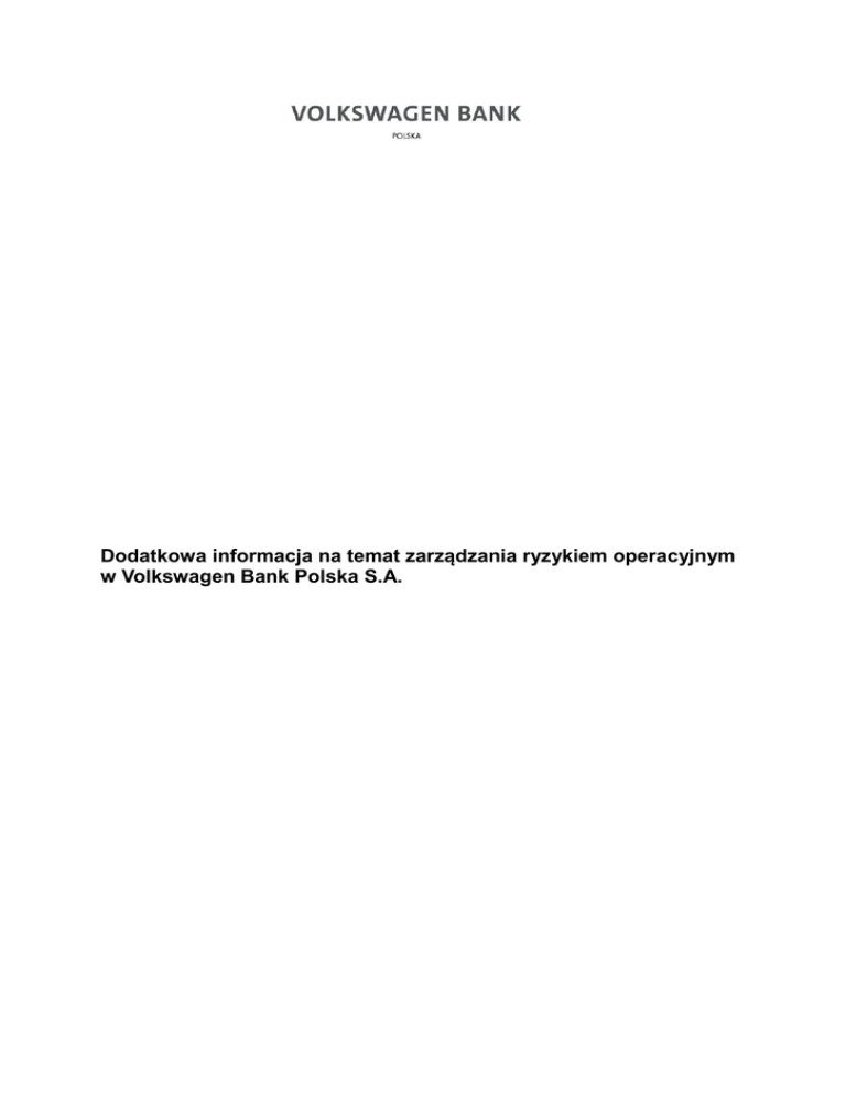 Dodatkowa informacja na temat zarządzania ryzykiem operacyjnym w Volkswagen Bank Polska S.A. W uzupełnieniu informacji na temat danych ilościowych i jakościowych Grupy Volkswagen Financial Services AG, Brunszwik, Niemcy dotyczących jej funduszy własnych, poniesionego ryzyka, procedur zarządzania ryzykiem oraz stosowanych metod minimalizacji ryzyka zgodnie z Uchwałą nr 385/2008 Komisji Nadzoru Finansowego z dnia 17 grudnia 2008 r. w sprawie szczegółowych zasad i sposobu ogłaszania przez banki informacji o charakterze jakościowym i ilościowym dotyczących adekwatności kapitałowej oraz zakresu informacji podlegających ogłaszaniu (Dz. Urz. KNF Nr 8, poz. 39 z późn. zm.) oraz z Rekomendacją M pkt. 17.3 Volkswagen Bank Polska S.A. niniejszym przedstawia informacje na temat zarządzania ryzykiem operacyjnym. Zgodnie ze Strategią Ryzyka w Volkswagen Bank Polska S.A. jednym z narzędzi zarządzania ryzykiem operacyjnym jest baza strat i incydentów. W 2013 roku Bank zarejestrował 53 zdarzenia operacyjne, w tym: 28 zdarzeń operacyjnych z niezrealizowaną stratą, 25 zdarzeń operacyjnych ze stratami bruttoi na łączną kwotę 1.533.128,81 PLN. Poniższa tabela prezentuje straty operacyjne Banku w podziale na kategorie zdarzeń zdefiniowane w Rekomendacji M: Kategorie zdarzeń Liczba zdarzeń Oszustwa wewnętrzne - Oszustwa zewnętrzne 23 Kwota strat brutto(PLN) 1 376 687,37 Zasady dotyczące zatrudnienia i bezpieczeństwo w miejscu pracy - - Klienci, produkty i praktyki operacyjne - - Szkody związane z aktywami rzeczowymi - - Zakłócenia działalności banku i awarie systemów - - Wykonanie transakcji, dostawa i zarządzanie procesami operacyjnymi 2 156 441,44 SUMA 25 1 533 128,81 Udział wartościowy strat operacyjnych podzielonych wg kategorii zdarzeń zdefiniowanych w Rekomendacji M w sumie zarejestrowanych strat operacyjnych przedstawia poniższy wykres: Udział strat operacyjnych 10,2% Oszustwa zewnętrzne 89,8% Wykonanie transakcji, dostawa i zarządzanie procesami operacyjnymi Głównym źródłem strat operacyjnych są oszustwa zewnętrzne (89,8%), które są związane z profilem działalności Banku - finansowanie zakupu pojazdów grupy Volkswagen. W celu minimalizowania ilości zdarzeń operacyjnych, Bank monitoruje i optymalizuje procesy, w tym prowadzi program zapobiegania nadużyciom kredytowym oraz przeprowadza szkolenia wewnętrzne. Do celów kalkulacji wymogów kapitałowych z tytułu ryzyka operacyjnego zgodnie z lokalnymi wymaganiami Bank stosuje metodę Podstawowego Wskaźnika. Wymogi kapitałowe na poziomie skonsolidowanym są liczone metodą standardową. Zarząd Volkswagen Bank Polska S.A. i Zgodnie z definicją z Rekomendacji M straty operacyjne brutto nie są pomniejszone o wartości odzyskane bezpośrednio oraz z tytułu mechanizmu transferu ryzyka. Straty te można podzielić na zrealizowane, tj. takie których skutki zostały ujęte (zgodnie z przyjętymi zasadami rachunkowości) w rachunku zysków i strat lub kapitałach własnych banku, jak i niezrealizowane, których maksymalna kwota jest oszacowana ale nie ujęta w rachunku zysków i strat lub kapitałach.