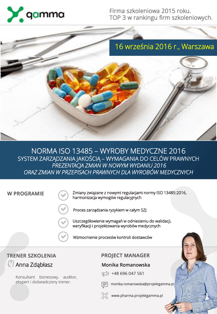 16 września 2016 r., Warszawa NORMA ISO 13485 – WYROBY MEDYCZNE 2016 SYSTEM ZARZĄDZANIA JAKOŚCIĄ – WYMAGANIA DO CELÓW PRAWNYCH PREZENTACJA ZMIAN W NOWYM WYDANIU 2016 ORAZ ZMIAN W PRZEPISACH PRAWNYCH DLA WYROBÓW MEDYCZNYCH Zmiany związane z nowymi regulacjami normy ISO 13485:2016, harmonizacja wymogów regulacyjnych Proces zarządzania ryzykiem w całym SZJ Uszczegółowienie wymagań w odniesieniu do walidacji, weryfikacji i projektowania wyrobów medycznych Wzmocnienie procesów kontroli dostawców Anna Zdąbłasz Konsultant biznesowy, auditor, ekspert i doświadczony trener. NORMA ISO 13485 – WYROBY MEDYCZNE 2016 SYSTEM ZARZĄDZANIA JAKOŚCIĄ – WYMAGANIA DO CELÓW PRAWNYCH PREZENTACJA ZMIAN W NOWYM WYDANIU 2016 ORAZ ZMIAN W PRZEPISACH PRAWNYCH DLA WYROBÓW MEDYCZNYCH Od roku 2010 jest prowadzona rewizja kluczowej normy dla branży wyrobów medycznych - ISO 13485 „Wyroby medyczne – Systemy zarządzania jakością – Wymagania do celów przepisów prawnych”. Przegląd normy jest wspólną pracą wielu środowisk: producentów, ekspertów, stowarzyszeń handlowych, środowisk akademickich i użytkowników na całym świecie. Obecnie nowe wydanie normy (edycja 2016) jest już dostępne. W połączeniu z oczekiwanymi zmianami przepisów prawnych dla wyrobów medycznych na rynku UE oraz ostatnio wprowadzonymi zmianami przepisów krajowych, istotna jest umiejętność właściwej interpretacji. Nowe wydanie ISO 13485 ma zastosowanie w łańcuchu dostaw i stara się objąć swoim zakresem cały cykl życia wyrobu medycznego. Szkolenie przybliża wprowadzone zmiany oraz umożliwia zapoznanie się z działaniami, które należy podjąć, aby skutecznie wdrożyć nowy standard. Warsztaty przeznaczone są dla wszystkich, którzy prowadzą działalność na rynku wyrobów medycznych, w tym do wytwórców, dystrybutorów, autoryzowanych przedstawicieli, personelu jednostek notyfikowanych: • Kadra kierownicza • Pełnomocnicy ds. systemów zarządzania jakością • Specjaliści i pracownicy działów jakości • Auditorzy wewnętrzni systemów zarządzania jakością • Osoby zainteresowane tematyką systemów zarządzania 2 NORMA ISO 13485 – WYROBY MEDYCZNE 2016 SYSTEM ZARZĄDZANIA JAKOŚCIĄ – WYMAGANIA DO CELÓW PRAWNYCH PREZENTACJA ZMIAN W NOWYM WYDANIU 2016 ORAZ ZMIAN W PRZEPISACH PRAWNYCH DLA WYROBÓW MEDYCZNYCH Szkolenie przybliża aktualne zmiany oraz umożliwia zapoznanie się z działaniami, które należy podjąć, aby skutecznie wdrożyć nowy standard oraz przygotować się na zasadnicze zmiany wymagań prawnych. Moduł 1. 3 Zmiany w normie EN ISO 13485:2016 • harmonizacja wymogów regulacyjnych • włączenie procesu zarządzania ryzykiem w całym SZJ, • uszczegółowienie w odniesieniu do i projektowania, • wzmocnienie procesów kontroli dostawców, • zwiększenie działań związanych z pozyskiwaniem informacji zwrotnych, • oprogramowanie dla systemu zarządzania jakością, produkcji i wyrobu medycznego. walidacji, wymagań weryfikacji Moduł 2: Projekt nowych rozporządzeń Moduł 3: Zmiany w Dokumentacji Technicznej wyrobów medycznych Moduł 4: Zmiany w systemie oceny zgodności wyrobów, zarówno wykonywanej samodzielnie przez wytwórcę, jak i z udziałem Jednostki Notyfikowanej Moduł 5: Zmiany w zakresie i identyfikowalności wyrobów Moduł 6: Zmiany dotyczące wytwórcy Moduł 7: Zmiany norm zharmonizowanych kwalifikacji identyfikacji personelu Anna Zdąbłasz Konsultant biznesowy, auditor, ekspert i doświadczony trener. Specjalista z zakresu technologii, kontroli i zapewnienia jakości oraz regulacji prawnych z obszaru przemysłu wyrobów medycznych, farmaceutycznego i spożywczego. Odpowiedzialna za wdrożenie z sukcesem ponad 50 wyrobów medycznych na rynkach: polskim, niemieckim, czeskim, słowackim. Auditor wiodący i ekspert największej polskiej Jednostki Notyfikowanej z zakresu wyrobów medycznych oraz auditor wiodący Jednostki Certyfikującej, o unikalnych kompetencjach w zakresie wyrobów klasy III, w tym pokrywanych lekami i z tkankami zwierzęcymi. Sprawny i doświadczony manager, włączając w to zarządzanie organizacją na zasadzie interim management. Profesjonalny i wiarygodny partner biznesowy. NORMA ISO 13485 – WYROBY MEDYCZNE 2016 SYSTEM ZARZĄDZANIA JAKOŚCIĄ – WYMAGANIA DO CELÓW PRAWNYCH PREZENTACJA ZMIAN W NOWYM WYDANIU 2016 ORAZ ZMIAN W PRZEPISACH PRAWNYCH DLA WYROBÓW MEDYCZNYCH Prosimy o wypełnienie i przesłanie formularza faksem na numer (22) 266 08 51 lub po zeskanowaniu, na adres e-mail: [email protected] - 800 zł do 6 września 900 zł po 6 września Monika Romanowska tel.: +48 696 047 561 [email protected] Zgłoszenia prosimy wysyłać na numer faksu: (22) 266 08 51 WYROBY MEDYCZNE 2016 4