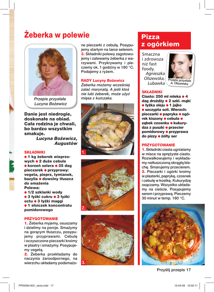 Żeberka w polewie ne pieczarki z cebulą. Posypujemy startym na tarce selerem. 3. Składniki polewy zagotowujemy i zalewamy żeberka z warzywami. Przykrywamy i pieczemy ok. 1 godziny w 180 °C. Podajemy z ryżem. Przepis przysłała Lucyna Bożewicz RADY Lucyny Bożewicz Żeberka możemy wcześniej zalać marynatą. A jeśli ktoś nie lubi żeberek, może użyć mięsa z kurczaka. Danie jest niedrogie, doskonałe na obiad. Cała rodzina je chwali, bo bardzo wszystkim smakuje. Lucyna Bożewicz, Augustów SKŁADNIKI ● 1 kg żeberek wieprzowych ● 2 duże cebule ● korzeń selera ● 35 dag pieczarek ● przyprawy: vegeta, pieprz, tymianek, bazylia ● dowolny tłuszcz do smażenia Polewa: ● 1/2 szklanki wody ● 3 łyżki cukru ● 3 łyżki octu ● 3 łyżki maggi ● 1 słoiczek koncentratu pomidorowego PRZYGOTOWANIE 1. Żeberka myjemy, osuszamy i dzielimy na porcje. Smażymy na gorącym tłuszczu, posypujemy przyprawami. Cebulę i oczyszczone pieczarki kroimy w plastry i smażymy. Posypujemy vegetą. 2. Żeberka przekładamy do naczynia żaroodpornego, na wierzchu układamy podsmażo- 1. Pizza z ogórkiem Smaczna i zdrowsza niż fast foody. Agnieszka Olszewska, Lubawka Przepis przysłała A. Olszewska SKŁADNIKI Ciasto: 250 ml mleka ● 4 dag drożdży ● 2 szkl. mąki ● łyżka oleju ● 1 jajko ● szczypta soli. Wierzch: pieczarki ● papryka ● ogórek kiszony ● cebula ● ząbek czosnku ● kukurydza z puszki ● przecier pomidorowy ● przyprawa do pizzy ● żółty ser PRZYGOTOWANIE 1. Składniki ciasta ugniatamy w misce na sprężyste ciasto. Rozwałkowujemy i wykładamy natłuszczoną okrągłą blachę. Smarujemy przecierem. 2. Pieczarki i ogórki kroimy w plasterki, paprykę, czosnek i cebulę w kostkę. Kukurydzę osączamy. Wszystko układamy na cieście. Posypujemy serem i przyprawą. Pieczemy 30 minut w temp. 180 °C. 2. 3. Przyślij przepis 17 PP0509s1621_tania.indd 17 15-04-09 10:32:11
