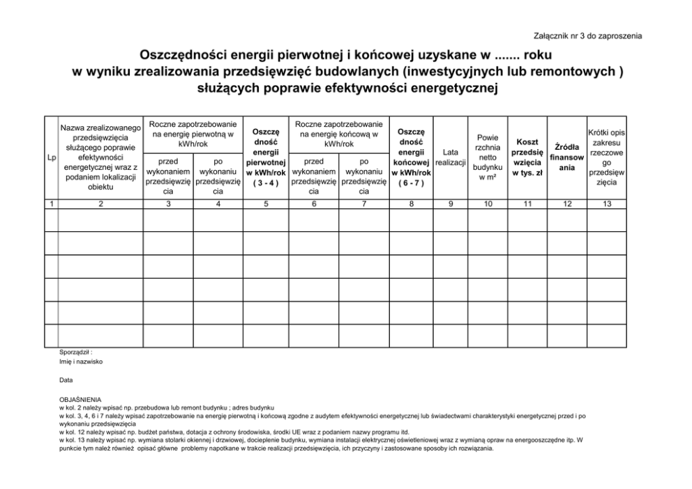 Załącznik nr 3 do zaproszenia Oszczędności energii pierwotnej i końcowej uzyskane w ....... roku w wyniku zrealizowania przedsięwzięć budowlanych (inwestycyjnych lub remontowych ) służących poprawie efektywności energetycznej Roczne zapotrzebowanie Nazwa zrealizowanego Roczne zapotrzebowanie Oszczę Oszczę na energię pierwotną w na energię końcową w Powie przedsięwzięcia dność dność kWh/rok kWh/rok służącego poprawie rzchnia energii energii Lata Lp efektywności netto przed po przed po pierwotnej końcowej realizacji energetycznej wraz z budynku wykonaniem wykonaniu w kWh/rok wykonaniem wykonaniu w kWh/rok podaniem lokalizacji w m² przedsięwzię przedsięwzię przedsięwzię przedsięwzię (3-4) (6-7) obiektu cia cia cia cia 1 2 3 4 5 6 7 8 9 10 Krótki opis Koszt zakresu Źródła przedsię rzeczowe finansow go wzięcia ania przedsięw w tys. zł zięcia 11 12 Sporządził : Imię i nazwisko Data OBJAŚNIENIA w kol. 2 należy wpisać np. przebudowa lub remont budynku ; adres budynku w kol. 3, 4, 6 i 7 należy wpisać zapotrzebowanie na energię pierwotną i końcową zgodne z audytem efektywności energetycznej lub świadectwami charakterystyki energetycznej przed i po wykonaniu przedsięwzięcia w kol. 12 należy wpisać np. budżet państwa, dotacja z ochrony środowiska, środki UE wraz z podaniem nazwy programu itd. w kol. 13 należy wpisać np. wymiana stolarki okiennej i drzwiowej, docieplenie budynku, wymiana instalacji elektrycznej oświetleniowej wraz z wymianą opraw na energooszczędne itp. W punkcie tym należ również opisać główne problemy napotkane w trakcie realizacji przedsięwzięcia, ich przyczyny i zastosowane sposoby ich rozwiązania. 13