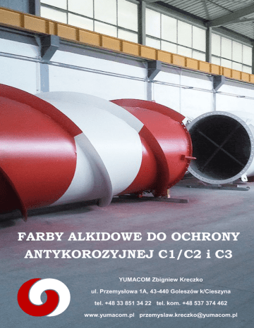 FARBY ALKIDOWE DO OCHRONY ANTYKOROZYJNEJ C1/C2 i C3 YUMACOM Zbigniew Kreczko ul. Przemysłowa 1A, 43-440 Goleszów k/Cieszyna tel. +48 33 851 34 22 tel. kom. +48 537 374 462 www.yumacom.pl [email protected] SYSTEM OCHRONY ANTYKOROZYJNEJ ALKIDCOR OPIS - System składa się z podkładu Minia Nova i powłoki nawierzchniowej Alkicoat lub gruntoemalii Alkicor HP. Produkty są jednoskładnikowymi farbami alkidowymi do ochrony antykorozyjnej w kategoriach C1-C3 stali zwykłej i ocynkowanej żeliwa i aluminium, takich jak: elementy architektury budowlanej i drogowej, konstrukcje, rurociągi, mosty i estakady, maszty, kominy, dachy, maszyny rolnicze i leśne, sprzęt budowlany, środki transportu, bramy i ogrodzenia, galanteria, itp. Odporność termiczna Minia Nova i Alkicor HP do 1300C. MINIA NOVA - Antykorozyjna szybkoschnąca alkidowa farba podkładowa, przeznaczona do gruntowania metalowych powierzchni, stanowi samodzielny podkład do długotrwałej ochrony czynnej (2 lata), a przede wszystkim część systemu ochrony antykorozyjnej ALKIDCOR wg. kategorii zabezpieczenia przed korozją C1/C2 i C3/L jako Primer pod powłoki nawierzchniowe Alkicoat Kolor. Uzyskana powłoka charakteryzuje się doskonałą przyczepnością do podłoża, elastycznością i stosowną do przeznaczenia twardością. Zalecamy stosować ją jako podkład także pod inne farby i emalie nawierzchniowe: ftalowe, ftalowe modyfikowane, chlorokauczukowe, poliwinylowe. Dostępna w podstawowych 11 kolorach. Na zamówienie w dowolnym kolorze RAL i NCS. ALKICOAT - Hydrofobowa półmatowa szybkoschnąca alkidowa farba nawierzchniowa o podwyższonej jakości na stal zwykłą i ocynkowaną. W systemie ochrony antykorozyjnej ALKIDCOR pełni rolę top coat w kategoriach ochrony przed rdzą C1/C2 i C3/L. Zalecana na podkład Minia Nova Kolor, najwygodniej w tym samym kolorze co primer. Uzyskana powłoka jest odporna na warunki pogodowe, elastyczna, o dobrej trwałości i odporności na wodę. Dostępna w szerokiej palecie kolorów. Alkicoat pełni samodzielną funkcję farby ogólnego stosowania na metal i drewno. Zalecana do renowacji starych pokryć malarskich dowolnego rodzaju. ALKICOR HP (High Performance) - służy do jednopowłokowej ochrony stali, ocynku i aluminium, łącząc w sobie podkład i top coat, 2 w 1. Należy do systemu ochrony antykorozyjnej ALKIDCOR wg kategorii zabezpieczenia przed rdzą C1/C2 i C3/L zgodnie z normą przedmiotową PN-EN ISO 12944 - zastępuje jednocześnie dwie farby, Minia Nova i Alkicoat. Charakter tiksotropowy pozwala na jednokrotne nałożenie do 270 mikronów powłoki, nie ściekającej z powierzchni pionowych. Powłoka szybko schnie, ma bardzo dobrą przyczepność do podłoża, twardość, elastyczność i odporność pogodę. Zalecana także do renowacji starych pokryć malarskich z niedoczyszczonymi dokładnie ogniskami korozji. Dla wygody klientów farba może być w dowolnym kolorze. Yuma®com PRODUCENT SPECJALISTYCZNYCH FARB I LAKIERÓW KATEGORIE KOROZYJNOŚCI C1/C2 Okres trwałości 2 - 5 lat 5 - 15 lat >15 lat Rodzaj farby Grubość (mikrony) Podkład Minia Nova 40 Farba nawierzchniowa Alkicoat 40 Gruntoemalia Alkicor HP 80 Podkład Minia Nova 80 Farba nawierzchniowa Alkicoat 40 Gruntoemalia Alkicor HP 120 Podkład Minia Nova 120 Farba nawierzchniowa Alkicoat 40 Gruntoemalia Alkicor HP 160 Rodzaj farby Grubość (mikrony) Podkład Minia Nova 80 Farba nawierzchniowa Alkicor 40 Gruntoemalia Alkicor HP 120 C3 Okres trwałości 2 - 5 lat Okres trwałości systemów lakierniczych KRÓTKI - L od 2 do 5 lat ŚREDNI - M od 5 do 15 lat DŁUGI - H ponad 15 lat Yuma®com PRODUCENT SPECJALISTYCZNYCH FARB I LAKIERÓW KLASY KOROZYJNOŚCI I PRZYGOTOWANIE POWIERZCHNI Siła korozji - Klasyfikacja warunków środowiskowych wg. DIN EN ISO 12944 - 2. Klasa korozyjności C1 znikoma C2 niska C3 umiarkowana Utrata grubości w pierwszym roku (μm) Przykładowe środowiska Stal W plenerze ≤1.3 — We wnętrzu Izolowane budynki ≤ 60% wilgotności względnej >1.3 - 25 Lekko zanieczyszczona atmosfera, suchy klimat, np. obszary wiejskie Nieizolowane budynki z tymczasową kondensacją, np. magazyny, sale gimnastyczne >25 - 50 M i P-atmosfera z umiarkowanym zanieczyszczeniem SO2 lub umiarkowany klimat przybrzeżny Pokoje z wysoką wzg. wilgotnością i drobnym zanieczyszczeniem, np. browary, pralnie, mleczarnie Stopnie przygotowania powierzchni według normy PN-EN ISO 8501-1. STOPNIE PRZYGOTOWANIA POWIERZCHNI NIE ZABEZPIECZONYCH POWŁOKAMI MALARSKIMI LUB PO CAŁKOWITYM ICH USUNIĘCIU W PRZYPADKU METOD STRUMIENIOWO-ŚCIERNYCH. Sa 3 Obróbka strumieniowo-ścierna do wizualnie czystej stali. Na oglądanej bez powiększenia powierzchni nie może być widoczny olej, smar, pył, zgorzelina walcownicza, rdza, powłoki malarskie czy obce zanieczyszczenia. Powierzchnia powinna mieć jednolitą, metaliczną barwę. Sa 2 ½ Bardzo dokładna obróbka strumieniowo-ścierna. Na oglądanej bez powiększenia powierzchni nie może być widoczny olej, smar, pył, zgorzelina walcownicza, rdza, powłoki malarskiej czy obce zanieczyszczenia. Mogą pozostać jedynie ślady zanieczyszczeń w postaci plamek w kształcie kropek lub pasków. Sa 2 Dokładna obróbka strumieniowo-ścierna. Na oglądanej bez powiększenia powierzchni nie może być widoczny olej, smar, pył, większe ślady zgorzeliny walcowniczej, rdzy, powłok malarskich czy obcych zanieczyszczeń. Wszelkie szczątkowe zanieczyszczenia powinny silnie przylegać. Sa 1 Lekka obróbka strumieniowo-ścierna. Na oglądanej bez powiększenia powierzchni nie może być widoczny olej, smar, pył, słabo przyczepna zgorzelina walcownicza, rdza, powłoki malarskie czy obce zanieczyszczenia. STOPNIE PRZYGOTOWANIA POWIERZCHNI NIE ZABEZPIECZONYCH POWŁOKAMI MALARSKIMI LUB PO CAŁKOWITYM USUNIĘCIU WCZEŚNIEJ NAŁOŻONYCH POWŁOK W PRZYPADKU METOD RĘCZNYCH. St 3 Bardziej gruntowne czyszczenie ręczne oraz czyszczenie z wykorzystaniem narzędzi z napędem mechanicznym. Wymagania taki