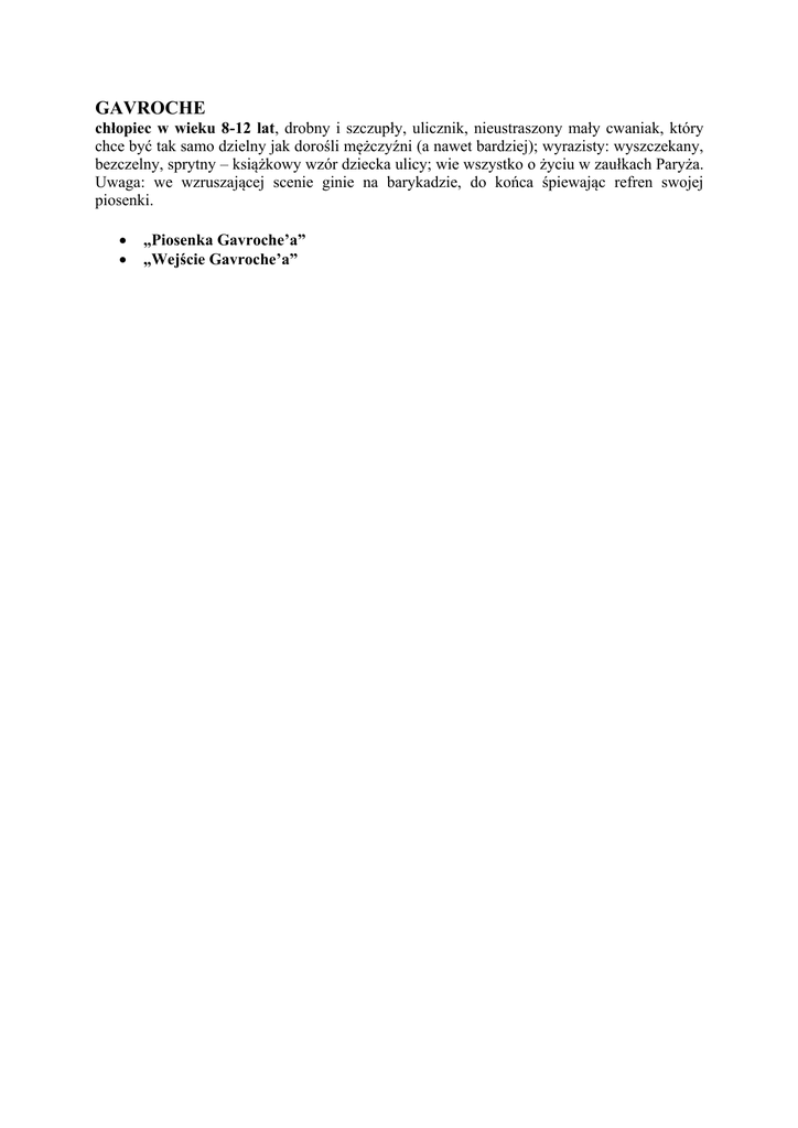GAVROCHE chłopiec w wieku 8-12 lat, drobny i szczupły, ulicznik, nieustraszony mały cwaniak, który chce być tak samo dzielny jak dorośli mężczyźni (a nawet bardziej); wyrazisty: wyszczekany, bezczelny, sprytny – książkowy wzór dziecka ulicy; wie wszystko o życiu w zaułkach Paryża. Uwaga: we wzruszającej scenie ginie na barykadzie, do końca śpiewając refren swojej piosenki. „Piosenka Gavroche’a” „Wejście Gavroche’a”