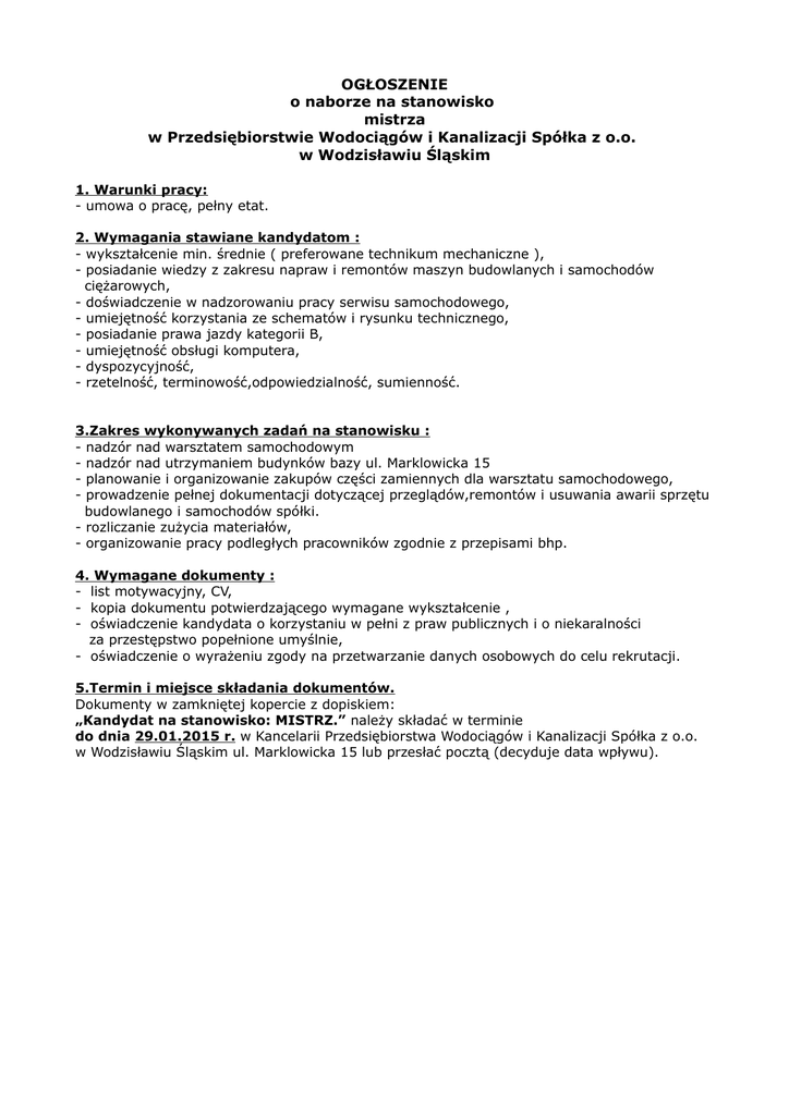 OGŁOSZENIE o naborze na stanowisko mistrza w Przedsiębiorstwie Wodociągów i Kanalizacji Spółka z o.o. w Wodzisławiu Śląskim 1. Warunki pracy: - umowa o pracę, pełny etat. 2. Wymagania stawiane kandydatom : - wykształcenie min. średnie ( preferowane technikum mechaniczne ), - posiadanie wiedzy z zakresu napraw i remontów maszyn budowlanych i samochodów ciężarowych, - doświadczenie w nadzorowaniu pracy serwisu samochodowego, - umiejętność korzystania ze schematów i rysunku technicznego, - posiadanie prawa jazdy kategorii B, - umiejętność obsługi komputera, - dyspozycyjność, - rzetelność, terminowość,odpowiedzialność, sumienność. 3.Zakres wykonywanych zadań na stanowisku : - nadzór nad warsztatem samochodowym - nadzór nad utrzymaniem budynków bazy ul. Marklowicka 15 - planowanie i organizowanie zakupów części zamiennych dla warsztatu samochodowego, - prowadzenie pełnej dokumentacji dotyczącej przeglądów,remontów i usuwania awarii sprzętu budowlanego i samochodów spółki. - rozliczanie zużycia materiałów, - organizowanie pracy podległych pracowników zgodnie z przepisami bhp. 4. Wymagane dokumenty : - list motywacyjny, CV, - kopia dokumentu potwierdzającego wymagane wykształcenie , - oświadczenie kandydata o korzystaniu w pełni z praw publicznych i o niekaralności za przestępstwo popełnione umyślnie, - oświadczenie o wyrażeniu zgody na przetwarzanie danych osobowych do celu rekrutacji. 5.Termin i miejsce składania dokumentów. Dokumenty w zamkniętej kopercie z dopiskiem: „Kandydat na stanowisko: MISTRZ.” należy składać w terminie do dnia 29.01.2015 r. w Kancelarii Przedsiębiorstwa Wodociągów i Kanalizacji Spółka z o.o. w Wodzisławiu Śląskim ul. Marklowicka 15 lub przesłać pocztą (decyduje data wpływu).