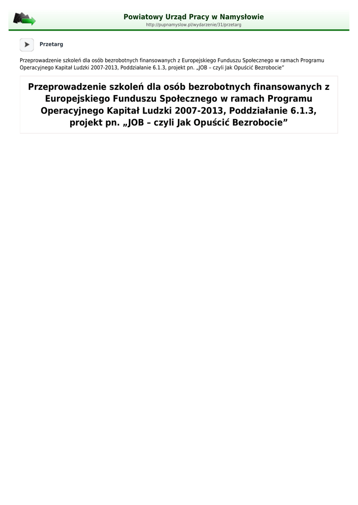 Powiatowy Urząd Pracy w Namysłowie http://pupnamyslow.pl/wydarzenie/31/przetarg Przetarg Przeprowadzenie szkoleń dla osób bezrobotnych finansowanych z Europejskiego Funduszu Społecznego w ramach Programu Operacyjnego Kapitał Ludzki 2007-2013, Poddziałanie 6.1.3, projekt pn. „JOB – czyli Jak Opuścić Bezrobocie” Przeprowadzenie szkoleń dla osób bezrobotnych finansowanych z Europejskiego Funduszu Społecznego w ramach Programu Operacyjnego Kapitał Ludzki 2007-2013, Poddziałanie 6.1.3, projekt pn. „JOB – czyli Jak Opuścić Bezrobocie”