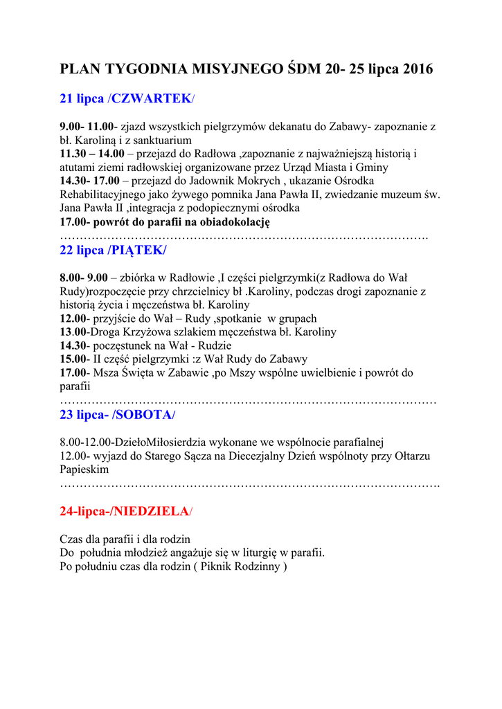 PLAN TYGODNIA MISYJNEGO ŚDM 20- 25 lipca 2016 21 lipca /CZWARTEK/ 9.00- 11.00- zjazd wszystkich pielgrzymów dekanatu do Zabawy- zapoznanie z bł. Karoliną i z sanktuarium 11.30 – 14.00 – przejazd do Radłowa ,zapoznanie z najważniejszą historią i atutami ziemi radłowskiej organizowane przez Urząd Miasta i Gminy 14.30- 17.00 – przejazd do Jadownik Mokrych , ukazanie Ośrodka Rehabilitacyjnego jako żywego pomnika Jana Pawła II, zwiedzanie muzeum św. Jana Pawła II ,integracja z podopiecznymi ośrodka 17.00- powrót do parafii na obiadokolację …………………………………………………………………………………. 22 lipca /PIĄTEK/ 8.00- 9.00 – zbiórka w Radłowie ,I części pielgrzymki(z Radłowa do Wał Rudy)rozpoczęcie przy chrzcielnicy bł .Karoliny, podczas drogi zapoznanie z historią życia i męczeństwa bł. Karoliny 12.00- przyjście do Wał – Rudy ,spotkanie w grupach 13.00-Droga Krzyżowa szlakiem męczeństwa bł. Karoliny 14.30- poczęstunek na Wał - Rudzie 15.00- II część pielgrzymki :z Wał Rudy do Zabawy 17.00- Msza Święta w Zabawie ,po Mszy wspólne uwielbienie i powrót do parafii …………………………………………………………………………………… 23 lipca- /SOBOTA/ 8.00-12.00-DziełoMiłosierdzia wykonane we wspólnocie parafialnej 12.00- wyjazd do Starego Sącza na Diecezjalny Dzień wspólnoty przy Ołtarzu Papieskim ……………………………………………………………………………………. 24-lipca-/NIEDZIELA/ Czas dla parafii i dla rodzin Do południa młodzież angażuje się w liturgię w parafii. Po południu czas dla rodzin ( Piknik Rodzinny )