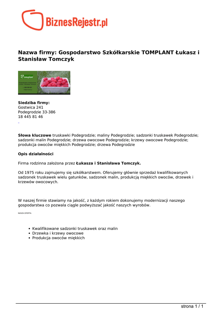 Nazwa firmy: Gospodarstwo Szkółkarskie TOMPLANT Łukasz i Stanisław Tomczyk Siedziba firmy: Gostwica 241 Podegrodzie 33-386 18 445 81 46 Słowa kluczowe truskawki Podegrodzie; maliny Podegrodzie; sadzonki truskawek Podegrodzie; sadzonki malin Podegrodzie; drzewa owocowe Podegrodzie; krzewy owocowe Podegrodzie; produkcja owoców miękkich Podegrodzie; drzewa Podegrodzie Opis działalności Firma rodzinna założona przez Łukasza i Stanisława Tomczyk. Od 1975 roku zajmujemy się szkółkarstwem. Oferujemy głównie sprzedaż kwalifikowanych sadzonek truskawek wielu gatunków, sadzonek malin, produkcją miękkich owoców, drzewek i krzewów owocowych. W naszej firmie stawiamy na jakość, z każdym rokiem dokonujemy modernizacji naszego gospodarstwa co pozwala ciągle podwyższać jakość naszych wyrobów. NASZA OFERTA: Kwalifikowane sadzonki truskawek oraz malin Drzewka i krzewy owocowe Produkcja owoców miękkich strona 1 / 1 Powered by TCPDF (www.tcpdf.org)