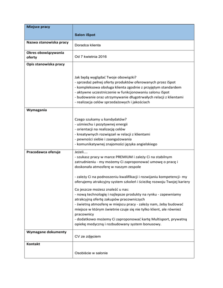 Miejsce pracy Salon iSpot Nazwa stanowiska pracy Okres obowiązywania oferty Doradca klienta Od 7 kwietnia 2016 Opis stanowiska pracy Jak będą wyglądać Twoje obowiązki? - sprzedaż pełnej oferty produktów oferowanych przez iSpot - kompleksowa obsługa klienta zgodnie z przyjętym standardem - aktywne uczestniczenie w funkcjonowaniu salonu iSpot - budowanie oraz utrzymywanie długotrwałych relacji z klientami - realizacja celów sprzedażowych i jakościach Wymagania Czego szukamy u kandydatów? - uśmiechu i pozytywnej energii - orientacji na realizację celów - kreatywnych rozwiązań w relacji z klientami - pewności siebie i zaangażowania - komunikatywnej znajomości języka angielskiego Pracodawca oferuje Jeżeli…. - szukasz pracy w marce PREMIUM i zależy Ci na stabilnym zatrudnieniu - my możemy Ci zaproponować umowę o pracę i doskonała atmosferę w naszym zespole - zależy Ci na podnoszeniu kwalifikacji i rozwijaniu kompetencji- my oferujemy atrakcyjny system szkoleń i ścieżkę rozwoju Twojej kariery Co jeszcze możesz znaleźć u nas: - nową technologię i najlepsze produkty na rynku - zapewniamy atrakcyjną ofertę zakupów pracowniczych - świetną atmosferę w miejscu pracy - zależy nam, żeby budować miejsce w którym świetnie czuje się nie tylko klient, ale również pracownicy - dodatkowo możemy Ci zaproponować kartę Multisport, prywatną opiekę medyczną i rozbudowany system bonusowy. Wymagane dokumenty CV ze zdjęciem Kontakt Osobiście w salonie