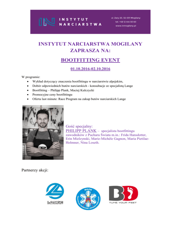INSTYTUT NARCIARSTWA MOGILANY ZAPRASZA NA: BOOTFITTING EVENT 01.10.2016-02.10.2016 W programie: Wykład dotyczący znaczenia bootfittingu w narciarstwie alpejskim, Dobór odpowiednich butów narciarskich - konsultacje ze specjalistą Lange Bootfitting – Philipp Plank, Maciej Kulczycki Promocyjne ceny bootfittingu Oferta last minute: Race Program na zakup butów narciarskich Lange Gość specjalny: PHILIPP PLANK – specjalista bootfittingu zawodników z Pucharu Świata m.in.: Frida Hansdotter, Erin Mielzynski, Marie-Michèle Gagnon, Maria PietilaeHolmner, Nina Loseth. Partnerzy akcji: PROGRAM: 01.10.2016 sobota 10.00-11.30 Znaczenie bootfittingu w narciarstwie alpejskim – Philipp Plank, wykład otwarty 12.00-18.00 Bootfitting (obowiązują wcześniejsze zapisy)* Indywidualne konsultacje ze specjalistą Lange 02.10.2016 niedziela 9.00-18.00 Bootfitting (obowiązują wcześniejsze zapisy)* Indywidualne konsultacje ze specjalistą Lange Rejestracja uczestników: Rejestracja na wydarzenie online: http://www.inmogilany.pl/kalendarzZapisy.php?id=230 Konieczna wcześniejsza rejestracja na bootfitting: 605 269 700, 601 486 800