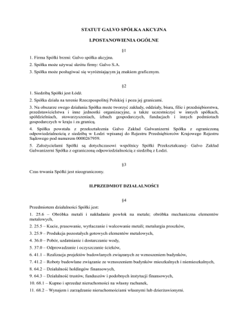 STATUT GALVO SPÓŁKA AKCYJNA I.POSTANOWIENIA OGÓLNE §1 1. Firma Spółki brzmi: Galvo spółka akcyjna. 2. Spółka może używać skrótu firmy: Galvo S.A. 3. Spółka może posługiwać się wyróżniającym ją znakiem graficznym. §2 1. Siedzibą Spółki jest Łódź. 2. Spółka działa na terenie Rzeczpospolitej Polskiej i poza jej granicami. 3. Na obszarze swego działania Spółka może tworzyć zakłady, oddziały, biura, filie i przedsiębiorstwa, przedstawicielstwa i inne jednostki organizacyjne, a także uczestniczyć w innych spółkach, spółdzielniach, stowarzyszeniach, izbach gospodarczych, fundacjach i innych podmiotach gospodarczych w kraju i za granicą. 4. Spółka powstała z przekształcenia Galvo Zakład Galwanizerni Spółka z ograniczoną odpowiedzialnością z siedzibą w Łodzi wpisanej do Rejestru Przedsiębiorców Krajowego Rejestru Sądowego pod numerem 0000267959. 5. Założycielami Spółki są dotychczasowi wspólnicy Spółki Przekształcanej- Galvo Zakład Galwanizerni Spółka z ograniczoną odpowiedzialnością z siedzibą z Łodzi. §3 Czas trwania Spółki jest nieograniczony. II.PRZEDMIOT DZIAŁALNOŚCI §4 Przedmiotem działalności Spółki jest: 1. 25.6 – Obróbka metali i nakładanie powłok na metale; obróbka mechaniczna elementów metalowych, 2. 25.5 – Kucie, prasowanie, wytłaczanie i walcowanie metali; metalurgia proszków, 3. 25.9 – Produkcja pozostałych gotowych elementów metalowych, 4. 36.0 – Pobór, uzdatnianie i dostarczanie wody, 5. 37.0 – Odprowadzanie i oczyszczanie ścieków, 6. 41.1 – Realizacja projektów budowlanych związanych ze wznoszeniem budynków, 7. 41.2 – Roboty budowlane związanie ze wznoszeniem budynków mieszkalnych i niemieszkalnych, 8. 64.2 – Działalność holdingów finansowych, 9. 64.3 – Działalność trustów, funduszów i podobnych instytucji finansowych, 10. 68.1 – Kupno i sprzedaż nieruchomości na własny rachunek, 11. 68.2 – Wynajem i zarządzanie nieruchomościami własnymi lub dzierżawionymi. 2. W przypadku przedmiotu działalności Spółki, dla którego prowadzenia wymagane jest uzyskanie stosownych zezwoleń lub koncesji, Spółka podejmie działalność w tym zakresie po uzyskaniu wymaganych prawem koncesji i zezwoleń. III. KAPITAŁ SPÓŁKI §5 1. Majątek Galvo Zakład Galwanizerni Spółka z ograniczoną odpowiedzialnością z siedzibą w Łodzi na skutek przekształcenia stał się majątkiem Spółki. 2. Kapitał zakładowy Spółki wynosi 400.000,00 zł (słownie: czterysta tysięcy złotych) i dzieli się na 4 000 000 (cztery miliony) akcji o wartości nominalnej 0,10 zł (słownie: dziesięć groszy) każda akcja, w tym: a) 2 500 000 (słownie: dwa miliony pięćset tysięcy) akcji imiennych uprzywilejowanych co do głosu (na każdą akcję przypadają dwa głosy) serii A, b) 1 500 000 (słownie: milion pięćset tysięcy) akcji zwykłych na okaziciela serii B. 3. Akcje są równe i niepodzielne. 4. Akcje serii A Spółki o wartości nominalnej 0,01 zł (jeden grosz) każda akcja, zostały objęte przez wspólników spółki przekształcanej- Galvo Zakład Galwanizerni Spółka z ograniczoną odpowiedzialnością z siedzibą w Łodzi, w następujący sposób: - 23 000 000 (dwadzieścia trzy miliony) akcji serii A o łącznej wartości 230 000,00 (dwieście trzydzieści tysięcy) złotych zostało objętych przez Sylwię Karim, - 2 000 000 (dwa miliony) akcji serii A o łącznej wartości 20.000,00 (dwadzieścia tysięcy) złotych zostało objętych przez Ryszarda Szczepaniaka. 5. Akcje serii B zostały pokryte w całości wkładem pieniężnym przed zarejestrowaniem podwyższenia kapitału zakładowego. §6 1. Akcje są zbywalne. 2.Przyznanie prawa głosu zastawnikowi lub użytkownikowi akcji jest niedopuszczalne. §7 1.Akcje mogą być umarzane wyłącznie za zgodą akcjonariusza, którego umorzenie dotyczy, w drodze ich nabycia przez Spółkę. 2. Umorzenie akcji wymaga uchwały Walnego Zgromadzenia. Uchwała powinna określać w szczególności podstawę prawną umorzenia, ilość i rodzaj akcji ulegających umorzeniu, wysokość wynagrodzenia przysługującego akcjonariuszowi akcji umorzonych, termin zapłaty wynagrodzenia za umarzane akcje oraz sposób obniżenia kapitału zakładowego. 3. Umorzenie akcji następuje poprzez obniżenie kapitału zakładowego Spółki. §8 1. Kapitał zakładowy może być podwyższany lub obniżany na mocy uchwały lub uchwał Walnego Zgromadzenia. 2. Podwyższenie kapitału zakładowego może nastąpić w drodze emisji nowych akcji imiennych lub na okaziciela. Kapitał zakładowy może być podwyższony również przez przeniesienie do niego z kapitału zapasowego lub funduszu rezerwowego środków określonych uchwałą Walnego Zgromadzenia. 3. Obniżenie kapitału zakładowego może nastąpić przez zmniejszenie nominalnej wartości akcji lub przez umorzenie części akcji. 4. Spółka może emitować obligacje, w tym obligacje zamienne na akcje. §9 wykreślony IV. ORGANY SPÓŁKI §10 Organami Spółki są: 1) Walne Zgromadzenie, 2) Rada Nadzorcza, 3) Zarząd. Walne Zgromadzenie §11 1. Walne Zgromadzenie może być zwyczajne lub nadzwyczajne. 2. Zwyczajne Walne Zgromadzenie powinno odbyć się nie później niż w sześć miesięcy po upływie każdego roku obrotowego. 3. Nadzwyczajne Walne Zgromadzenie może być zwołane przez Zarząd, Radę Nadzorczą lub akcjonariuszy przedstawiających przynajmniej połowę kapitału zakładowego lub połowę głosów w Spółce. Akcjonariusz lub akcjonariusze reprezentujący co najmniej 5% kapitału zakładowego mogą żądać zwołania Nadzwyczajnego Walnego Zgromadzenia i umieszczenia określonych spraw w porządku obrad. 4. Do kompetencji Walnego Zgromadzenia należy podejmowanie uchwał dotyczących: 1) rozpatrywania i zatwierdzania sprawozdania Zarządu z działalności Spółki oraz sprawozdania finansowego za ubiegły rok obrotowy, 2) podziału zysków lub pokrycia stra