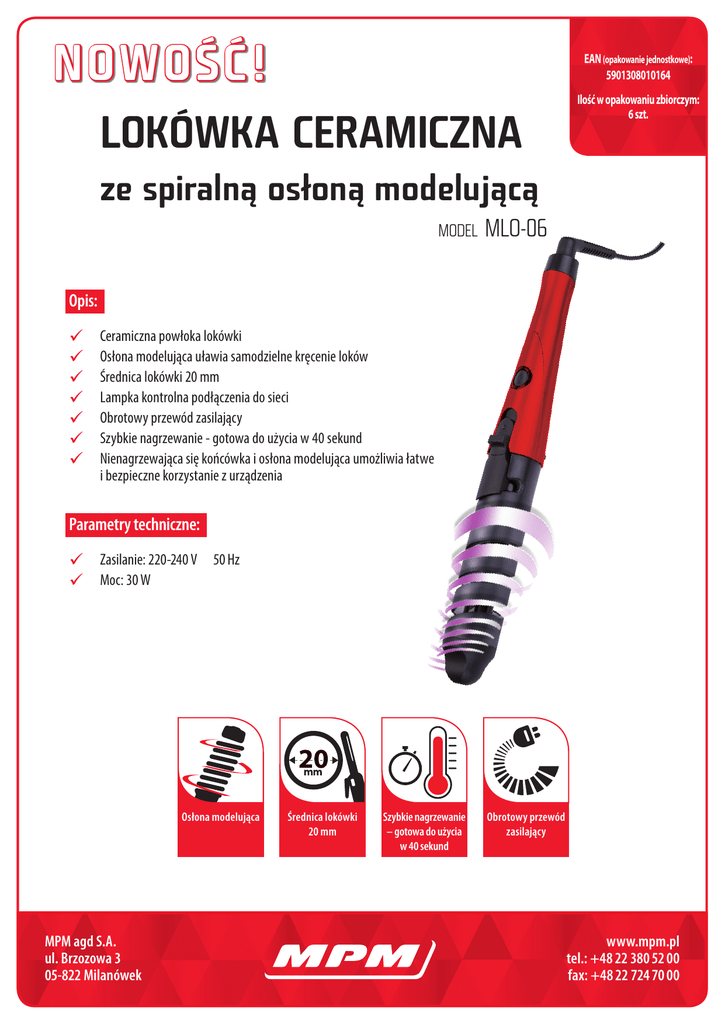 NOWOŚĆ! EAN (opakowanie jednostkowe): 5901308010164 LOKÓWKA CERAMICZNA Ilość w opakowaniu zbiorczym: 6 szt. ze spiralną osłoną modelującą model MLO-06 Opis: 99 99 99 99 99 99 99 Ceramiczna powłoka lokówki Osłona modelująca uławia samodzielne kręcenie loków Średnica lokówki 20 mm Lampka kontrolna podłączenia do sieci Obrotowy przewód zasilający Szybkie nagrzewanie - gotowa do użycia w 40 sekund Nienagrzewająca się końcówka i osłona modelująca umożliwia łatwe i bezpieczne korzystanie z urządzenia Parametry techniczne: 99 Zasilanie: 220-240 V 50 Hz 99 Moc: 30 W Osłona modelująca MPM agd S.A. ul. Brzozowa 3 05-822 Milanówek Średnica lokówki 20 mm Szybkie nagrzewanie – gotowa do użycia w 40 sekund Obrotowy przewód zasilający www.mpm.pl tel.: +48 22 380 52 00 fax: +48 22 724 70 00