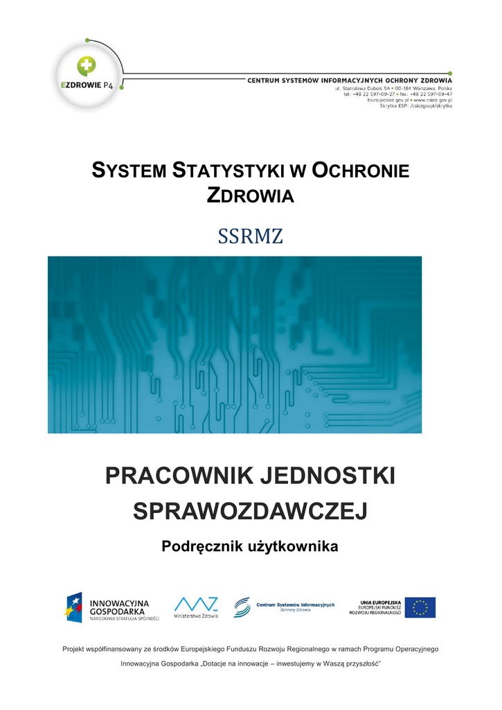 SYSTEM STATYSTYKI W OCHRONIE ZDROWIA SSRMZ PRACOWNIK JEDNOSTKI SPRAWOZDAWCZEJ Podręcznik użytkownika Projekt współfinansowany ze środków Europejskiego Funduszu Rozwoju Regionalnego w ramach Programu Operacyjnego Innowacyjna Gospodarka „Dotacje na innowacje – inwestujemy w Waszą przyszłość” Wprowadzenie 2 PRACOWNIK JEDNOSTKI SPRAWOZDAWCZEJ SYSTEM STATYSTYKI W OCHRONIE ZDROWIA - SSRMZ Wersja systemu 2.0 Wydanie I Warszawa 2015 Egzemplarz bezpłatny Dokument przygotowany dla Centrum Systemów Informacyjnych Ochrony Zdrowia w ramach projektu Elektroniczna Platforma Gromadzenia,Analizy i Udostępniania Zasobów Cyfrowych o Zdarzeniach Medycznych CSIOZ posiadające autorskie prawa majątkowe do dokumentu zezwala na nieograniczone (pod względem czasu i terytorium), nieodpłatne korzystanie z niego. Uprawnienie obejmuje w szczególności możliwość zmiany formatu zapisu dokumentu oraz możliwość jego wyświetlania, kopiowania, drukowania, tłumaczenia – zarówno w całości, jak i w części. Strona 2 z 71 Wprowadzenie 3 Spis treści 1. WPROWADZENIE ....................................................................................... 5 1.1. Wstęp ................................................................................................................................... 5 1.2. System Statystyki w Ochronie Zdrowia ............................................................................ 5 1.3. System Statystyki Resortowej Ministra Zdrowia ............................................................. 6 1.4. Czego można dowiedzieć się z podręcznika? ................................................................ 6 1.5. Jak uzyskać dostęp do aplikacji/portalu?......................................................................... 6 1.6. Wykaz terminów i skrótów użytych w podręczniku ......................................................... 7 2. INFORMACJE PODSTAWOWE ................................................................. 9 2.1. Budowa systemu ................................................................................................................ 9 2.2. Zastosowane ikony ........................................................................................................... 11 2.3. Wyszukiwanie i sortowanie.............................................................................................. 12 3. PIERWSZE KROKI .................................................................................... 16 3.1. Rejestracja użytkownika .................................................................................................. 16 3.2. Logowanie użytkownika ................................................................................................... 25 3.3. Przypomnienie hasła ........................................................................................................ 28 3.4. Zmiana danych ................................................................................................................. 29 3.5. Aktualizacja danych ankiety ............................................................................................ 30 4. KOMUNIKATY ............................................................................................ 32 4.1. Skrzynka ............................................................................................................................ 32 4.2. Konfiguracja ...................................................................................................................... 33 5. WIADOMOŚCI ........................................................................................... 35 5.1. Wyślij .................................................................................................................................. 35 5.2. Odebrane ........................................................................................................................... 36 5.3. Wysłane ............................................................................................................................. 37 6. WYGASZANIE SESJI ........................................................................................ 39 7. SPRAWOZDANIA TYPU MZ ..................................................................... 40 7.1. Sprawozdania MZ jednostki ............................................................................................ 42 7.1.1. Sprawozdania MZ oczekujące na uzupełnienie. ............................................. 42 7.1.2. Sprawozdania MZ oczekujące na weryfikację. ............................................... 50 7.1.3. Sprawozdania MZ zwrócone do korekty. ......................................................... 50 Strona 3 z 71 Wprowadzenie 4 7.1.4. Sprawozdania MZ zaakceptowane. ................................................................. 51 7.1.5. Sprawozdania MZ wszystkie. ............................................................................ 52 8. SPRAWOZDANIA JEDNORAZOWE ........................................................ 53 8.1. Sprawozdania jednorazowe jednostki ............................................................................ 55 8.1.1. Sprawozdania jednorazowe oczekujące na uzupełnienie. ............................ 55 8.1.2. Sprawozdania jednorazowe oczekujące na weryfikację. ............................... 63 8.1.3. Sprawozdania jednorazowe zwrócone do korekty. ......................................... 64 8.1.4. Sprawozdania jednorazowe zaakceptowane. ................................................. 65 8.1.5. Sprawozdania jednorazowe wszystkie. ........................................................... 66 9. SPIS RYSUNKÓW I TABEL ...................................................................... 67 10. NOTATKI ..................................................................................................... 70 Strona 4 z 71 Wprowadzenie 5 1. Wprowadzenie 1.1. Wstęp Celem Projektu P4 jest u