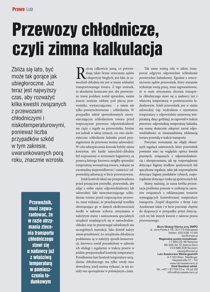 Prawo Lutz Przewozy chłodnicze, czyli zimna kalkulacja Zbliża się lato, być może tak gorące jak ubiegłoroczne. Już teraz jest najwyższy czas, aby rozważyć kilka kwestii związanych z przewozami chłodniczymi i niskotemperaturowymi, ponieważ liczba przypadków szkód w tym zakresie, uwarunkowanych porą roku, znacznie wzrosła. 58 Przewoźnik, musi zagwarantować, że w razie otrzymania zlecenia transportu chłodniczego stawi się u nadawcy już z właściwą temperaturą w pomieszczeniu ładunkowym R zeczą całkowicie jasną, co potwierdzają także liczne orzeczenia sądów i ekspertyzy biegłych, jest fakt, że samochód-chłodnia nie jest w stanie schłodzić transportowanego towaru. Z tego wniosek, że absolutnie konieczne jest, aby przewożony towar poddany został uprzednio, zanim jeszcze zostanie oddany pod pieczę przewoźnika, wystarczającemu – a zatem nie tylko powierzchownemu – schłodzeniu. W przypadku szkód spowodowanych niewystarczającym schłodzeniem towaru przed rozpoczęciem przewozu odpowiedzialność nie ciąży z reguły na przewoźniku. Istotne jest jednak w takiej sytuacji, czy owo niedostateczne schłodzenie ładunku przed przystąpieniem do przewozu można udowodnić. W celu zabezpieczenia dowodu byłoby zatem korzystne, aby każdy samochód-chłodnia był wyposażony w termometr bagnetowy, za pomocą którego kierowca mógłby sprawdzić temperaturę wewnętrzną towaru, wskazać na ewentualną nieprawidłowość i zamieścić odpowiednią adnotację w liście przewozowym. Jeżeli kontroli takiej nie przeprowadzono przed przejęciem przesyłki, przewoźnik, aby zdjąć z siebie ciężar odpowiedzialności lub udowodnić fakt niewystarczającego schłodzenia towaru przed rozpoczęciem przewozu, musi wykazać, że przedsięwziął wszelkie obowiązujące go w danych okolicznościach środki w zakresie wyboru, utrzymania w należytym stanie i zastosowania specjalnych urządzeń znajdujących się w samochodziechłodni oraz że przestrzegał udzielonych mu szczególnych instrukcji. Jako dowód należy zatem przedstawić, że: urządzenia chłodnicze poddawane są w należyty sposób konserwacji, kierowca został przeszkolony w zakresie ich obsługi i regularnie w trakcie przerw w jeździe przeprowadzał kontrolę temperatury. Przedłożenie kart kontroli temperatury urządzenia chłodniczego ma tylko wtedy moc dowodową, jeżeli można wykazać, że nie zostały one sporządzone w późniejszym czasie. Tak samo ważną rolę w takim transporcie odgrywa odpowiednie schłodzenie powierzchni ładunkowej. Zgodnie z orzecznictwem sądów przewoźnik, który starannie wykonuje swoją pracę, musi zagwarantować, że w razie otrzymania zlecenia transportu chłodniczego stawi się u nadawcy już z właściwą temperaturą w pomieszczeniu ładunkowym. Jeżeli przewoźnik jest w stanie udowodnić (np. wydrukiem z rejestratora temperatury z odpowiednio ustawioną temperaturą, datą i godziną), że zapewnił w trakcie przewozu odpowiednią temperaturę ładunku, ma szansę skutecznie odeprzeć zarzut odpowiedzialności za nieuzasadnioną reklamacją towaru powstałą w trakcie transportu Powyższe rozważania nie objęły obszernych regulacji ustawowych, które przewoźnik powinien mieć na względzie oprócz kwestii prawnych, związanych z odpowiedzialnością i ubezpieczeniem, jak np. rozporządzenie dotyczące higieny środków spożywczych lub specyficzne regulacje, takie jak rozporządzenie dotyczące higieny produktów rybnych, rozporządzenie dotyczące rynku jaj spożywczych itd. Mamy nadzieję, że nasza krótka prezentacja problemu pomoże w uniknięciu zarzutów związanych z reklamacjami towarów wymagających kontrolowanej temperatury transportu. Zespół ekspertów z firmy Lutz Assekuranz także i w lecie pozostaje chętnie do dyspozycji w przypadku pytań dotyczących tej lub innych kwestii z zakresu prawa przewozowego. Biuro Obsługi Klienta przy ZMPD al. Jana Pawła II 78, 00-175 Warszawa Telefon: (22) 536 10 84 [email protected] Regionalne punkty kontaktowe: 17 860 32 48 Rzeszów 68 328 34 72 Zielona Góra 723 688 208 Szczecin [email protected] Lutz Assekuranz MaklergesmbH A-1120 Wien, Meidlinger Hauptstraße 51 – 53 www.lutz-assekuranz.pl Dział likwidacji szkód: Tel.:+43 1 8175573 w. 16 lub 29 [email protected]