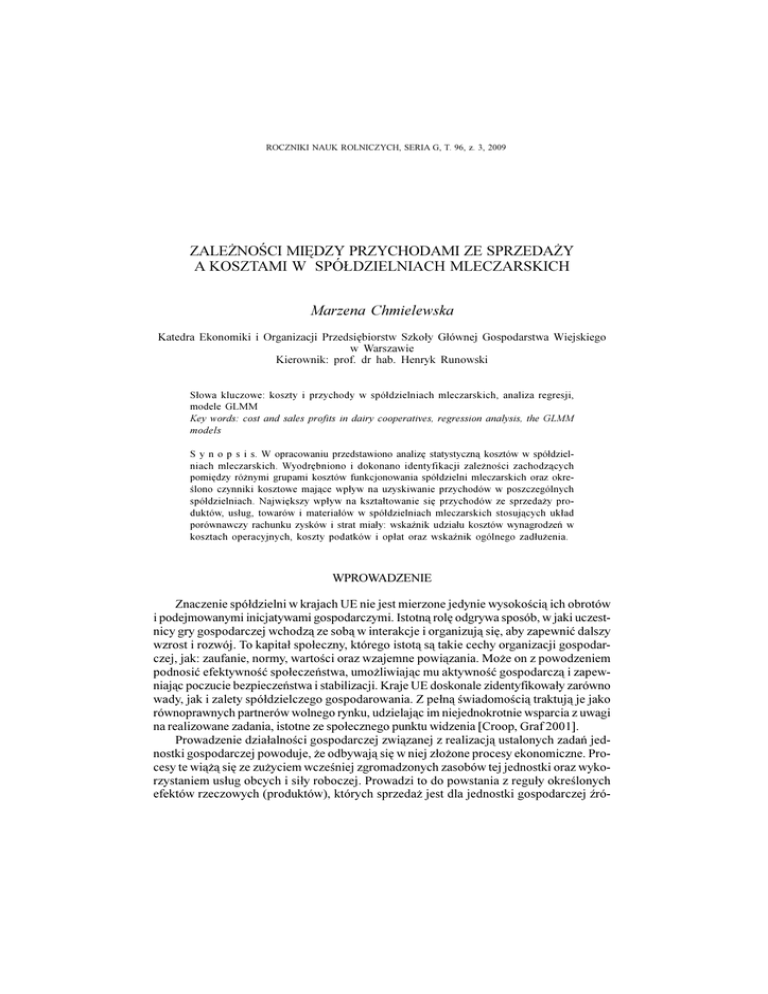 ROCZNIKI NAUK ROLNICZYCH, SERIA G, T. 96, z. 2009 ZALE¯NOCI MIÊDZY PRZYCHODAMI ZE SPRZEDA¯Y A KOSZTAMI W3,SPÓ£DZIELNIACH .... 121 ZALE¯NOCI MIÊDZY PRZYCHODAMI ZE SPRZEDA¯Y A KOSZTAMI W SPÓ£DZIELNIACH MLECZARSKICH Marzena Chmielewska Katedra Ekonomiki i Organizacji Przedsiêbiorstw Szko³y G³ównej Gospodarstwa Wiejskiego w Warszawie Kierownik: prof. dr hab. Henryk Runowski S³owa kluczowe: koszty i przychody w spó³dzielniach mleczarskich, analiza regresji, modele GLMM Key words: cost and sales profits in dairy cooperatives, regression analysis, the GLMM models S y n o p s i s. W opracowaniu przedstawiono analizê statystyczn¹ kosztów w spó³dzielniach mleczarskich. Wyodrêbniono i dokonano identyfikacji zale¿noci zachodz¹cych pomiêdzy ró¿nymi grupami kosztów funkcjonowania spó³dzielni mleczarskich oraz okrelono czynniki kosztowe maj¹ce wp³yw na uzyskiwanie przychodów w poszczególnych spó³dzielniach. Najwiêkszy wp³yw na kszta³towanie siê przychodów ze sprzeda¿y produktów, us³ug, towarów i materia³ów w spó³dzielniach mleczarskich stosuj¹cych uk³ad porównawczy rachunku zysków i strat mia³y: wskanik udzia³u kosztów wynagrodzeñ w kosztach operacyjnych, koszty podatków i op³at oraz wskanik ogólnego zad³u¿enia. WPROWADZENIE Znaczenie spó³dzielni w krajach UE nie jest mierzone jedynie wysokoci¹ ich obrotów i podejmowanymi inicjatywami gospodarczymi. Istotn¹ rolê odgrywa sposób, w jaki uczestnicy gry gospodarczej wchodz¹ ze sob¹ w interakcje i organizuj¹ siê, aby zapewniæ dalszy wzrost i rozwój. To kapita³ spo³eczny, którego istot¹ s¹ takie cechy organizacji gospodarczej, jak: zaufanie, normy, wartoci oraz wzajemne powi¹zania. Mo¿e on z powodzeniem podnosiæ efektywnoæ spo³eczeñstwa, umo¿liwiaj¹c mu aktywnoæ gospodarcz¹ i zapewniaj¹c poczucie bezpieczeñstwa i stabilizacji. Kraje UE doskonale zidentyfikowa³y zarówno wady, jak i zalety spó³dzielczego gospodarowania. Z pe³n¹ wiadomoci¹ traktuj¹ je jako równoprawnych partnerów wolnego rynku, udzielaj¹c im niejednokrotnie wsparcia z uwagi na realizowane zadania, istotne ze spo³ecznego punktu widzenia [Croop, Graf 2001]. Prowadzenie dzia³alnoci gospodarczej zwi¹zanej z realizacj¹ ustalonych zadañ jednostki gospodarczej powoduje, ¿e odbywaj¹ siê w niej z³o¿one procesy ekonomiczne. Procesy te wi¹¿¹ siê ze zu¿yciem wczeniej zgromadzonych zasobów tej jednostki oraz wykorzystaniem us³ug obcych i si³y roboczej. Prowadzi to do powstania z regu³y okrelonych efektów rzeczowych (produktów), których sprzeda¿ jest dla jednostki gospodarczej ró- 122 M. CHMIELEWSKA d³em rodków pieniê¿nych. rodki te s¹ niezbêdne do kontynuowania dzia³alnoci i rozwoju [Naumiuk 1995]. Dzia³alnoæ gospodarcza powoduje z jednej strony powstawanie kosztów, z drugiej za przychodów i wyników finansowych. METODYKA BADAÑ Analizê statystyczn¹ przeprowadzono na podstawie danych ród³owych obejmuj¹cych wybrane parametry opisuj¹ce kondycjê finansow¹ 66 spó³dzielni mleczarskich w ca³ej Polsce. Dla ka¿dej mleczarni by³y to 4 zestawy danych odpowiednio dla lat 2003-2006. W zestawach danych wystêpuj¹ w poszczególnych zmiennych braki danych, które oznaczaj¹, i¿ spó³dzielnia prowadzi rachunek zysków i strat w jednym z uk³adów: porównawczym lub kalkulacyjnym1. We wszystkich rocznych zestawach danych dotycz¹cych wszystkich spó³dzielni mleczarskich przyjêto wspóln¹ konwencjê nazewnictwa, która by³a konsekwencj¹ postawionych celów badawczych. Poszczególne zmienne oznaczono nastêpuj¹cymi symbolami: y1 przychody ze sprzeda¿y produktów, us³ug, towarów i materia³ów [z³], x1 koszty operacyjne (koszty rodzajowe = koszty kalkulacyjne) [z³], x2 wartoæ sprzedanych towarów i materia³ów [z³], x3 koszt wytworzenia sprzedanych produktów [z³], x4 koszty sprzeda¿y [z³], x5 koszty ogólnego zarz¹du [z³], x6 amortyzacja [z³], x7 zu¿ycie materia³ów i energii [z³], x8 us³ugi obce [z³], x9 podatki i op³aty [z³], x10 wynagrodzenia [z³], x11 ubezpieczenia spo³eczne i inne wiadczenia [z³], x12 pozosta³e koszty rodzajowe [z³], x13 wskanik kosztoch³onnoci przychodów [krotnoæ], x14 udzia³ amortyzacji w kosztach operacyjnych [%], x15 udzia³ wynagrodzeñ w kosztach operacyjnych [%], x16 udzia³ zu¿ycia materia³ów w kosztach operacyjnych [%], x17 udzia³ kosztów sprzeda¿y w kosztach operacyjnych [%], x18 udzia³ kosztów zarz¹du w kosztach operacyjnych [%], x19 wskanik rentownoci sprzeda¿y [%], x20 wskanik rentownoci maj¹tku [%], x21 wskanik rentownoci funduszu w³asnego [%], x22 wskanik dwigni finansowej [%], x23 wskanik p³ynnoci bie¿¹cej [%], x24 wskanik p³ynnoci szybkiej [krotnoæ], x25 wskanik p³ynnoci natychmiastowej [krotnoæ], x26 wskanik ogólnego zad³u¿enia [%]. Celem badañ jest wyodrêbnienie i identyfikacja zale¿noci zachodz¹cych pomiêdzy ró¿nymi grupami kosztów funkcjonowania spó³dzielni mleczarskich oraz okrelenie czynników kosztowych maj¹cych wp³yw na uzyskiwanie przychodów ze sprzeda¿y w poszczególnych spó³dzielniach. 1 W zbiorowoci wyst¹pi³y dwie grupy spó³dzielni mleczarskich w zale¿noci od stosowanego uk³adu rachunku zysków i strat (kalkulacyjny lub porównawczy). Je¿eli okrelona spó³dzielnia stosowa³a dany wariant rachunku zysków i strat to pozycje z innego wariantu traktowane by³y jako braki danych. ZALE¯NOCI MIÊDZY PRZYCHODAMI ZE SPRZEDA¯Y A KOSZTAMI W SPÓ£DZIELNIACH .... 123 W pierwszym etapie badañ obliczono wartoci podstawowych statystyk opisowych: redniej arytmetycznej oraz odchylenia standardowego dla zmiennej zale¿nej i niezale¿nych. Ponadto, dla ka¿dej ze zmiennych wykonano histogram oraz krzyw¹ liczebnoci w celu oceny dopasowania rozk³adu zmiennej do rozk³adu normalnego. Drugi etap badañ obejmowa³ ocenê wp³ywu wartoci zmiennych niezale¿nych x1 x26, czyli wybranych parametrów na zmienn¹ zale¿n¹ y1. Przeprowadzono j¹ w oparciu o modele re
