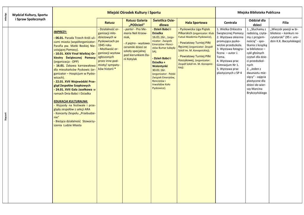 miesiąc Miejski Ośrodek Kultury i Sportu Wydział Kultury, Sportu i Spraw Społecznych Ratusz IMPREZY: Styczeń - 06.01. Parada Trzech Króli ulicami miasta (współorganizator: Parafia pw. Matki Boskiej Nieustającej Pomocy). - 10.01. XXIV Finał Wielkiej Orkiestry Świątecznej Pomocy (organizacja - OPP) - 16.01. Zabawa karnawałowa dla mieszkańców Pyskowic (organizator – Hospicjum w Pyskowicach). - 22.01. XVII Wojewódzki Przegląd Zespołów Szopkowych - 24.01. XVII Gala Jasełkowa w ramach Dnia Babci i Dziadka EDUKACJA KULTURALNA: - Wyjazdy na festiwale i przeglądy zespołów z sekcji ARA - Koncerty Zespołu „Przebudzenie” - Bieżąca działalność Stowarzyszenia Ludzie Miasta - Działalność organizacji młodzieżowych w Pyskowicach po 1945 roku - Możliwość organizacji wystaw zgłoszonych przez inne podmioty/ sympatyków historii * Ratusz Galeria „PODcień” Świetlica Osiedlowa - parter - Pro Memoria Neli Krzewniak, - Dzień Babci i Dziadka 16.01.16r., (orga- Miejska Biblioteka Publiczna Hala Sportowa Centrala - Pyskowicka Liga Piątek 1. Wielka Orkiestra Piłkarskich (organizator: Klub Świątecznej Pomocy Futsal Akademia Pyskowice), 2. Wystawa okienna nizator: Związek promująca pysko- II piętro - wystawa Emerytów i Renci- - Powiatowy Turniej Piłki wickie przedszkola. ceramiki dzieci ze stów Bumar Łabędy Ręcznej (organizator: Zespół 3. Wystawa fotograSzkół im. M. Konopnickiej), szkoły specjalnej SA). ficzna – autor J. pod kierunkiem Da- Powiatowy Turniej Piłki Toma. - Dzień Babci i rii Kotylak Koszykowej, (organizator: 4. Wystawa prac Dziadka + Zespół Szkół im. M. Konopnic- Gimnazjum Nr 1. Walentynki kiej). 5. Wystawa prac 30.01.16r. plastycznych z SP 4 (organizator: Polski Związek Emerytów, Rencistów i Inwalidów Koło Pyskowice). Oddział dla dzieci 1. „Słuchamy z radością, czytamy z przyjemnością” - spotkania z książką w bibliotece – cykl głośnych czytań dla dzieci przedszkolnych 2. „Jeden z dwunastu miesięcy” - zajęcia plastyczne dla dzieci do wierszy Marcina Brykczyńskiego Filia „Wieczór poezji w bibliotece – konkurs recytatorski” (95 r. urodzin K.K. Baczyńskiego) miesiąc Miejski Ośrodek Kultury i Sportu Wydział Kultury, Sportu i Spraw Społecznych Ratusz - Działalność organizacji mło• wycieczki jednodniowe, dzieżowych w • wyjazdy do kina, teatru i na Pyskowicach po lodowisko 1945 roku - Możliwość or- Rozgrywki Piłkarskie Liturgicz- EDUKACJA KULTURALNA ganizacji wystaw nej Służby Ołtarza w Hali Wido- - Wyjazdy na festiwale i przezgłoszonych wiskowo-Sportowej (współorga- glądy zespołów z sekcji ARA - Warsztaty taneczne (wyjazdo- przez inne podnizator: Parafia Nawrócenia Św. Pawła Apostoła), we i stacjonarne) dla zespołu mioty/ sympatyParadox TT Alacarte ków historii * - Koncerty Zespołu „Przebudzenie” - Bieżąca działalność Stowarzyszenia Ludzie Miasta Luty - Ferie w mieście: IMPREZY - Jubileusz Młodzieżowego Teatru Carpe Diem - 15.02 – 28.02. Ferie Zimowe Ratusz Galeria „PODcień” - II piętro - „Jedwab malowany”- wystawa jedwabiu Agaty Okrzesik Świetlica Osiedlowa - Spotkanie karnawałowe 06.02.16r. (organizator: Związek Emerytów i Rencistów Bumar Łabędy SA). Miejska Biblioteka Publiczna Hala Sportowa Centrala - Turniej Piłki Siatkowej 1. Wystawa walendziewcząt, (organizator: Gim- tynkowa. nazjum Nr 1), 2. Wystawa fotograficzna – autor J. No- Turniej Piłki Siatkowej chłopców, (organizator: Gim- wak. nazjum Nr 1), - Pyskowicka Liga Piątek Piłkarskich (organizator: Klub Futsal Akademia Pyskowice), - Rozgrywki Piłkarskie Liturgicznej Służby Ołtarza w Hali Widowiskowo-Sportowej (organizator: Parafia Nawrócenia Św. Pawła Apostoła) Oddział dla dzieci Filia „Biblioferie” „Czytam, bawię się i gram – w bibliotece ferie spędzam” 1. Nastrojowe lampiony”- zajęcia plastyczne. 2. „Zima w krainie lodu”- zajęcia czytelniczo- plastyczne. 3. „Od kropki do obrazka” - kreatywne zabawy antystresowe 4. „Dzień śnieżnej bitwy” - zmagania planszowe i komputerowe 5. „Jak być dżentelmenem w sieci” - zajęcia czytelniczo - rysunkowe 6. „Poniedziałek pod wesołym bałwankiem” zabawy kreatywne 7. „Zimowy przegląd sportowy” - konkurs wiedzy o sportach zimowych, zabawy rysunkowe 8. „Akademia projektowania „Brył” zabawy kreatywne 9. „Aby język giętki powiedział wszystko co pomyśli głowa” - potyczki z językiem polskim – konkurs z okazji dnia Języka Ojczystego 10. Konkurs logopedyczny 11. Spotkania filatelistyczne dla dzieci miesiąc Miejski Ośrodek Kultury i Sportu Wydział Kultury, Sportu i Spraw Społecznych - Miejski Konkurs Recytatorski Ratusz IMPREZY: - „Dzień Kobiet” – spektakl teatralny w wykonaniu Młodzieżowego Teatru Carpe Diem - Piłkarskie Mistrzostwa Litur- Przenikanie” - premiera spekgicznej Służby Ołtarza w Hali taklu Teatru Tańca Alacarte Widowiskowo-Sportowej (współorganizator: Duszpasterstwo - Jubileusz Zespołu Szkół SpeLiturgicznej Służby Ołtarza Diecezji cjalnych (organizator: ZSS) (współorganizator: Gimnazjum Nr 1), Gliwickiej i Radio Plus), - Konkurs Wiedzy o Śląsku dla gimnazjalistów (współorganizator: Zespół Szkół im. M. Konopnickiej) - Turniej Skata Sportowego w Dzierżnie - Turniej Szachowy w Szkole Podstawowej Nr 6 (współorganizator: Szkoła Podstawowa Nr 6). Marzec - Konkurs historyczny z okazji 1050-lecia Chrztu Polski (współorganizator: Zespół Szkół, Gimnazjum Nr 1, Zespół Szkół im. M. Konopnickiej, Parafia pw. Św. Mikołaja) - Oddziaływanie prasy i wydawnictw lokalnych na poziom wiedzy o naszym mieście - Możliwość organizacji wystaw zgłoszonych EDUKACJA KULTURALNA: przez inne pod- Wyjazdy na festiwale i prze- mioty/ sympatyglądy zespołów z sekcji ARA ków historii * - Występy Teatru Tańca Alacarte ze spektaklem „Przenikanie” - Koncerty Zespołu „Przebudzenie” - Bieżąca działalność Stowarzys
