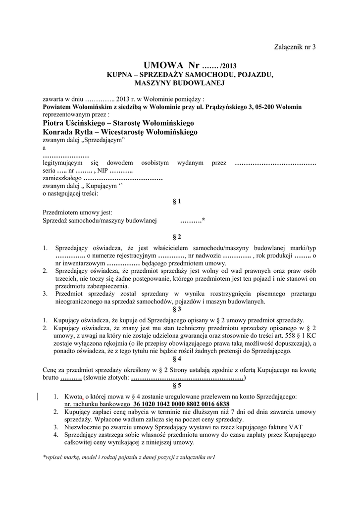 Załącznik nr 3 UMOWA Nr ……. /2013 KUPNA – SPRZEDAŻY SAMOCHODU, POJAZDU, MASZYNY BUDOWLANEJ zawarta w dniu ………….. 2013 r. w Wołominie pomiędzy : Powiatem Wołomińskim z siedzibą w Wołominie przy ul. Prądzyńskiego 3, 05-200 Wołomin reprezentowanym przez : Piotra Uścińskiego – Starostę Wołomińskiego Konrada Rytla – Wicestarostę Wołomińskiego zwanym dalej „Sprzedającym” a ………………… legitymującym się dowodem osobistym seria ….. nr …….. , NIP ……….. zamieszkałego ……………………………… zwanym dalej „ Kupującym ‘’ o następującej treści: wydanym przez ………………………………. §1 Przedmiotem umowy jest: Sprzedaż samochodu/maszyny budowlanej ……….* §2 1. 2. 3. Sprzedający oświadcza, że jest właścicielem samochodu/maszyny budowlanej marki/typ ………….. o numerze rejestracyjnym …………, nr nadwozia …………. , rok produkcji …….. o nr inwentarzowym …………… będącego przedmiotem umowy. Sprzedający oświadcza, że przedmiot sprzedaży jest wolny od wad prawnych oraz praw osób trzecich, nie toczy się żadne postępowanie, którego przedmiotem jest ten pojazd i nie stanowi on przedmiotu zabezpieczenia. Przedmiot sprzedaży został sprzedany w wyniku rozstrzygnięcia pisemnego przetargu nieograniczonego na sprzedaż samochodów, pojazdów i maszyn budowlanych. §3 1. Kupujący oświadcza, że kupuje od Sprzedającego opisany w § 2 umowy przedmiot sprzedaży. 2. Kupujący oświadcza, że znany jest mu stan techniczny przedmiotu sprzedaży opisanego w § 2 umowy, z uwagi na który nie zostaje udzielona gwarancja oraz stosownie do treści art. 558 § 1 KC zostaje wyłączona rękojmia (o ile przepisy obowiązującego prawa taką możliwość dopuszczają), a ponadto oświadcza, że z tego tytułu nie będzie rościł żadnych pretensji do Sprzedającego. §4 Cenę za przedmiot sprzedaży określony w § 2 Strony ustalają zgodnie z ofertą Kupującego na kwotę brutto ………. (słownie złotych: ……………………………………………) §5 1. Kwota, o której mowa w § 4 zostanie uregulowane przelewem na konto Sprzedającego: nr. rachunku bankowego 36 1020 1042 0000 8802 0016 6838 2. Kupujący zapłaci cenę nabycia w terminie nie dłuższym niż 7 dni od dnia zawarcia umowy sprzedaży. Wpłacone wadium zalicza się na poczet ceny sprzedaży. 3. Niezwłocznie po zwarciu umowy Sprzedający wystawi na rzecz kupującego fakturę VAT 4. Sprzedający zastrzega sobie własność przedmiotu umowy do czasu zapłaty przez Kupującego całkowitej ceny wynikającej z niniejszej umowy. *wpisać markę, model i rodzaj pojazdu z danej pozycji z załącznika nr1 §6 1. Wydanie przedmiotu umowy Kupującemu w miejscu wskazanym przez Sprzedającego nastąpi po wpływie środków pieniężnych na rachunku bankowym Sprzedającego. 2. Sprzedający wyraża gotowość do wydania w każdym następnym dniu roboczym, przedmiotu sprzedaży Kupującemu, po spełnieniu warunku opisanego w ust 1 a Kupujący zobowiązuje się do jego odbioru w terminie nie dłuższym niż 7 dni od dnia spełnienia tego warunku. §7 1. Sprzedającemu przysługuje prawo do odstąpienia od umowy w przypadku wystąpienia któregokolwiek z poniższych zdarzeń:. a) Kupujący nie zapłacił ceny lub nie odebrał przedmiotu umowy w terminie wskazanym przez Sprzedającego; b) Wystąpi istotna zmiana okoliczności powodująca, że wykonanie umowy nie leży w interesie publicznym, czego nie można było przewidzieć w chwili zawarcia umowy. 2. Odstąpienie od umowy może nastąpić w terminie 30 dni od powzięcia wiadomości o zaistnieniu okoliczności uzasadniającej odstąpienie. Ponadto w przypadku o którym mowa w ust. 1 lit a). powyżej Sprzedający zatrzyma wpłacone wadium. §8 Strony nie ponoszą odpowiedzialności za nie wykonanie umowy spowodowane siłą wyższą, za którą uważa się zdarzenie, które w chwili podpisania umowy nie mogło być przez strony przewidziane i zostało spowodowane przez okoliczności od nich niezależne (np. pożar, powódź, inne klęski żywiołowe i zdarzenia). §9 Wszelkie koszty związane z zawarciem niniejszej umowy obciążają Kupującego. §10 Wszelkie zmiany umowy wymagają formy pisemnej, pod rygorem nieważności. § 11 W sprawach nie uregulowanych niniejszą umową zastosowanie mają obowiązujące w tym zakresie przepisy kodeksu cywilnego. § 12 1. Umowę sporządzono w dwóch jednobrzmiących egzemplarzach po jednym dla każdej ze stron. 2. Wszelkie spory powstałe w związku z zawarciem lub wykonaniem niniejszej umowy będą rozstrzygane przez sąd powszechny właściwy dla siedziby Sprzedającego. SPRZEDAJĄCY : KUPUJĄCY : .......................................... .......................................