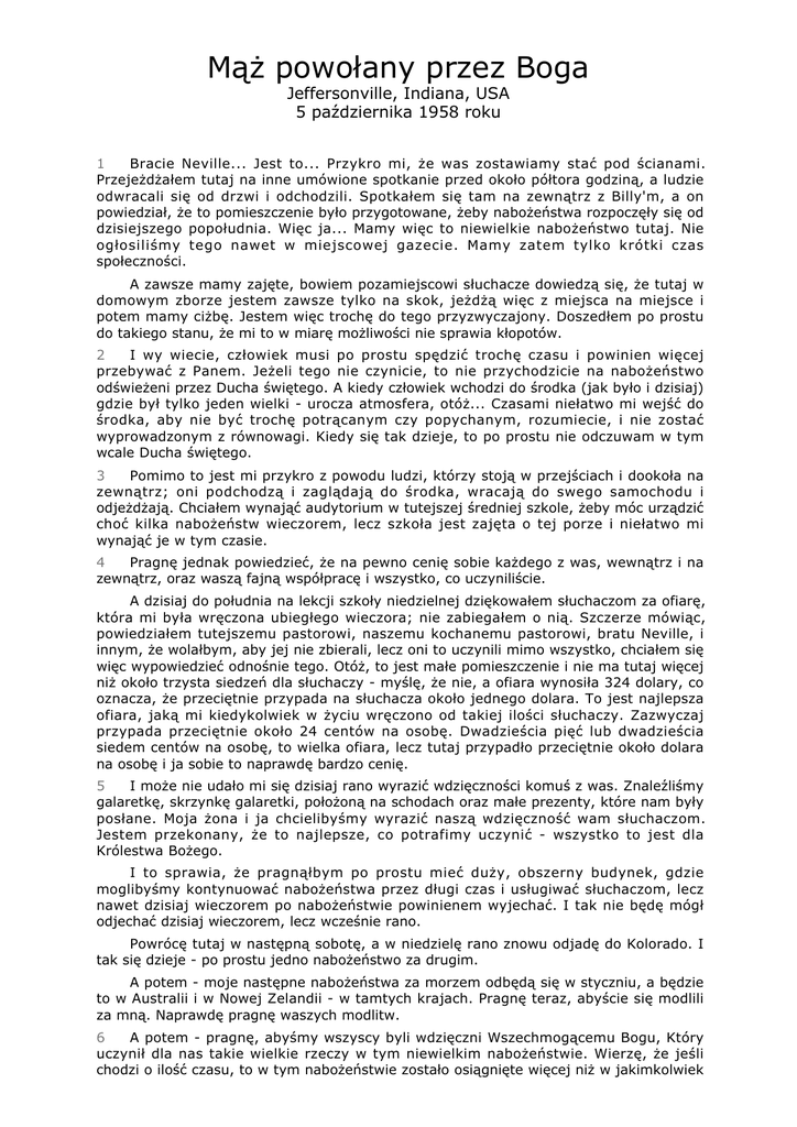 Mąż powołany przez Boga Jeffersonville, Indiana, USA 5 października 1958 roku 1 Bracie Neville... Jest to... Przykro mi, że was zostawiamy stać pod ścianami. Przejeżdżałem tutaj na inne umówione spotkanie przed około półtora godziną, a ludzie odwracali się od drzwi i odchodzili. Spotkałem się tam na zewnątrz z Billy'm, a on powiedział, że to pomieszczenie było przygotowane, żeby nabożeństwa rozpoczęły się od dzisiejszego popołudnia. Więc ja... Mamy więc to niewielkie nabożeństwo tutaj. Nie ogłosiliśmy tego nawet w miejscowej gazecie. Mamy zatem tylko krótki czas społeczności. A zawsze mamy zajęte, bowiem pozamiejscowi słuchacze dowiedzą się, że tutaj w domowym zborze jestem zawsze tylko na skok, jeżdżą więc z miejsca na miejsce i potem mamy ciżbę. Jestem więc trochę do tego przyzwyczajony. Doszedłem po prostu do takiego stanu, że mi to w miarę możliwości nie sprawia kłopotów. 2 I wy wiecie, człowiek musi po prostu spędzić trochę czasu i powinien więcej przebywać z Panem. Jeżeli tego nie czynicie, to nie przychodzicie na nabożeństwo odświeżeni przez Ducha świętego. A kiedy człowiek wchodzi do środka (jak było i dzisiaj) gdzie był tylko jeden wielki - urocza atmosfera, otóż... Czasami niełatwo mi wejść do środka, aby nie być trochę potrącanym czy popychanym, rozumiecie, i nie zostać wyprowadzonym z równowagi. Kiedy się tak dzieje, to po prostu nie odczuwam w tym wcale Ducha świętego. 3 Pomimo to jest mi przykro z powodu ludzi, którzy stoją w przejściach i dookoła na zewnątrz; oni podchodzą i zaglądają do środka, wracają do swego samochodu i odjeżdżają. Chciałem wynająć audytorium w tutejszej średniej szkole, żeby móc urządzić choć kilka nabożeństw wieczorem, lecz szkoła jest zajęta o tej porze i niełatwo mi wynająć je w tym czasie. 4 Pragnę jednak powiedzieć, że na pewno cenię sobie każdego z was, wewnątrz i na zewnątrz, oraz waszą fajną współpracę i wszystko, co uczyniliście. A dzisiaj do południa na lekcji szkoły niedzielnej dziękowałem słuchaczom za ofiarę, która mi była wręczona ubiegłego wieczora; nie zabiegałem o nią. Szczerze mówiąc, powiedziałem tutejszemu pastorowi, naszemu kochanemu pastorowi, bratu Neville, i innym, że wolałbym, aby jej nie zbierali, lecz oni to uczynili mimo wszystko, chciałem się więc wypowiedzieć odnośnie tego. Otóż, to jest małe pomieszczenie i nie ma tutaj więcej niż około trzysta siedzeń dla słuchaczy - myślę, że nie, a ofiara wynosiła 324 dolary, co oznacza, że przeciętnie przypada na słuchacza około jednego dolara. To jest najlepsza ofiara, jaką mi kiedykolwiek w życiu wręczono od takiej ilości słuchaczy. Zazwyczaj przypada przeciętnie około 24 centów na osobę. Dwadzieścia pięć lub dwadzieścia siedem centów na osobę, to wielka ofiara, lecz tutaj przypadło przeciętnie około dolara na osobę i ja sobie to naprawdę bardzo cenię. 5 I może nie udało mi się dzisiaj rano wyrazić wdzięczności komuś z was. Znaleźliśmy galaretkę, skrzynkę galaretki, położoną na schodach oraz małe prezenty, które nam były posłane. Moja żona i ja chcielibyśmy wyrazić naszą wdzięczność wam słuchaczom. Jestem przekonany, że to najlepsze, co potrafimy uczynić - wszystko to jest dla Królestwa Bożego. I to sprawia, że pragnąłbym po prostu mieć duży, obszerny budynek, gdzie moglibyśmy kontynuować nabożeństwa przez długi czas i usługiwać słuchaczom, lecz nawet dzisiaj wieczorem po nabożeństwie powinienem wyjechać. I tak nie będę mógł odjechać dzisiaj wieczorem, lecz wcześnie rano. Powrócę tutaj w następną sobotę, a w niedzielę rano znowu odjadę do Kolorado. I tak się dzieje - po prostu jedno nabożeństwo za drugim. A potem - moje następne nabożeństwa za morzem odbędą się w styczniu, a będzie to w Australii i w Nowej Zelandii - w tamtych krajach. Pragnę teraz, abyście się modlili za mną. Naprawdę pragnę waszych modlitw. 6 A potem - pragnę, abyśmy wszyscy byli wdzięczni Wszechmogącemu Bogu, Który uczynił dla nas takie wielkie rzeczy w tym niewielkim nabożeństwie. Wierzę, że jeśli chodzi o ilość czasu, to w tym nabożeństwie zostało osiągnięte więcej niż w jakimkolwiek Mąż powołany przez Boga 2 innym nabożeństwie, na którym usługiwałem kiedykolwiek w moim życiu w tej kaplicy. Wydaje się, że Pan otworzył po prostu swoje błogosławieństwa. Myślałem sobie, że może w ciągu tego nabożeństwa - na podstawie wizji, którą miałem, że moja usługa zostanie zmieniona na lepszą i wspanialszą usługę. Otóż, to się właśnie stanie z taką pewnością, jak wy, słuchacze, słyszeliście tych innych trzech kaznodziejów głoszących - czy tych dwóch innych. Ta usługa będzie po prostu taka jak ta, tylko większa. Lecz pierwszego wieczora - ja po prostu wezwałem słuchaczy tutaj do ołtarza i przeszło to wprost do rozeznawania. Drugiego wieczora wziąłem ich do innego pomieszczenia; znowu to przeszło wprost do rozeznawania. A ostatnie dwa wieczory przyprowadziliśmy ich tutaj na podium; wprost do rozeznawania. 7 Lecz tylko by uczynić krótkie sprawozdanie o tych sprawach: ślepy kaznodzieja otrzymał swój wzrok na podium. A dwie dziewczynki, które ubiegłego wieczora siedziały na wózkach inwalidzkich zdjęte chorobami, których nikt nie zna (żaden lekarz), ich stopy były nabrzmiałe a odpadały im palce i nic nie można było dla nich uczynić. I właśnie kiedy Duch święty udzielał namaszczenia podszedłem tam i przekląłem tą chorobę w Imieniu Pana Jezusa i one wstały z tych wózków inwalidzkich, a dzisiaj rano chodziły tutaj dookoła w kaplicy, jak każde inne dziecko i podeszły tutaj, i zostały ochrzczone chrześcijańskim chrztem wprost tutaj w tym baptysterium dzisiaj rano. 8 Kiedy miałem przed chwilą kilka minut czasu do studiowania, a było tam kilku moich przyjaciół