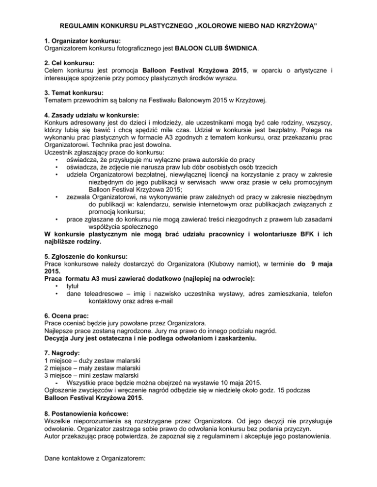 REGULAMIN KONKURSU PLASTYCZNEGO „KOLOROWE NIEBO NAD KRZYŻOWĄ” 1. Organizator konkursu: Organizatorem konkursu fotograficznego jest BALOON CLUB ŚWIDNICA. 2. Cel konkursu: Celem konkursu jest promocja Balloon Festival Krzyżowa 2015, w oparciu o artystyczne i interesujące spojrzenie przy pomocy plastycznych środków wyrazu. 3. Temat konkursu: Tematem przewodnim są balony na Festiwalu Balonowym 2015 w Krzyżowej. 4. Zasady udziału w konkursie: Konkurs adresowany jest do dzieci i młodzieży, ale uczestnikami mogą być całe rodziny, wszyscy, którzy lubią się bawić i chcą spędzić mile czas. Udział w konkursie jest bezpłatny. Polega na wykonaniu prac plastycznych w formacie A3 zgodnych z tematem konkursu, oraz przekazaniu prac Organizatorowi. Technika prac jest dowolna. Uczestnik zgłaszający prace do konkursu: • oświadcza, że przysługuje mu wyłączne prawa autorskie do pracy • oświadcza, że zdjęcie nie narusza praw lub dóbr osobistych osób trzecich • udziela Organizatorowi bezpłatnej, niewyłącznej licencji na korzystanie z pracy w zakresie niezbędnym do jego publikacji w serwisach www oraz prasie w celu promocyjnym Balloon Festival Krzyżowa 2015; • zezwala Organizatorowi, na wykonywanie praw zależnych od pracy w zakresie niezbędnym do publikacji w: kalendarzu, serwisie internetowym oraz publikacjach związanych z promocją konkursu; • prace zgłaszane do konkursu nie mogą zawierać treści niezgodnych z prawem lub zasadami współżycia społecznego W konkursie plastycznym nie mogą brać udziału pracownicy i wolontariusze BFK i ich najbliższe rodziny. 5. Zgłoszenie do konkursu: Prace konkursowe należy dostarczyć do Organizatora (Klubowy namiot), w terminie do 9 maja 2015. Praca formatu A3 musi zawierać dodatkowo (najlepiej na odwrocie): • tytuł • dane teleadresowe – imię i nazwisko uczestnika wystawy, adres zamieszkania, telefon kontaktowy oraz adres e-mail 6. Ocena prac: Prace oceniać będzie jury powołane przez Organizatora. Najlepsze prace zostaną nagrodzone. Jury ma prawo do innego podziału nagród. Decyzja Jury jest ostateczna i nie podlega odwołaniom i zaskarżeniu. 7. Nagrody: 1 miejsce – duży zestaw malarski 2 miejsce – mały zestaw malarski 3 miejsce – mini zestaw malarski ⁃ Wszystkie prace będzie można obejrzeć na wystawie 10 maja 2015. Ogłoszenie zwycięzców i wręczenie nagród odbędzie się w niedzielę około godz. 15 podczas Balloon Festival Krzyżowa 2015. 8. Postanowienia końcowe: Wszelkie nieporozumienia są rozstrzygane przez Organizatora. Od jego decyzji nie przysługuje odwołanie. Organizator zastrzega sobie prawo do odwołania konkursu bez podania przyczyn. Autor przekazując pracę potwierdza, że zapoznał się z regulaminem i akceptuje jego postanowienia. Dane kontaktowe z Organizatorem: Świdnicki Klub Balonowy ul. Łukasińskiego 7 58-100 Świdnica [email protected]