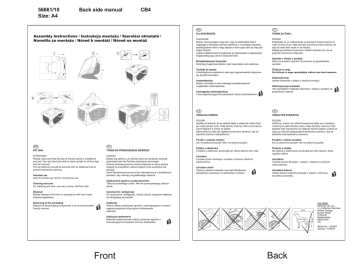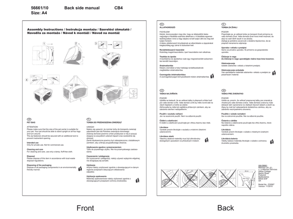56661/10 Size: A4 Back side manual CB4 HU Assembly Instructions / Instrukcja montażu / Szerelési útmutató / Navodila za montažo / Návod k montáži / Návod na montáž 1 2 3 SI ÁLLATHORDOZÓ TORBA ZA ŽIVALI FIGYELEM! Kérjük, bizonyosodjon meg róla, hogy az állatszállító táska nagysága a házállata számára alkalmas e. A házállata egyenes testhelyzetben mind a négy talpára rá kell tudjon állni és meg kell tudjon fordulni. A táska véletlenszerű kinyitásának az elkerülésére a zippzárakat kiegészítőleg egy zárral is biztosítani kell. POZOR! Prepričajte se, je velikost torbe za transport živali primerna za vašo domačo žival. Vaša domača žival mora imeti možnost, da stoji na vseh štirih tacah in se obrača. Zadrge je potrebno zavarovati z dodatno ključavnico, da se prepreči nenamerno odpiranje. Rendeltetésszerű használat Kizárólag magánhasználatra. Ipari használatra nem alkalmas. Tisztítás és ápolás A tisztításhoz és ápoláshoz csak egy megnedvesített szöszmentes kendőt használjon. Ártalmatlanítás Kérjük a terméket a helyi hatósági rendelkezéseknek megfelelően ártalmatlanítsa. Csomagolás ártalmatlanítása A csomagolóanyagot környezetbarát módon ártalmatlanítsa. Uporaba v skladu s predpisi Samo za privatno uporabo. Ni primerno za gospodarsko uporabo. Čiščenje in nega Za čiščenje in nego uporabljajte vlažno krpo brez kosemov. Odstranjevanje Izdelek odstranite v skladu z lokalnimi predpisi. Odstranjevanje embalaže Vse uporabljene materiale odstranite v skladu s predpisi za posamezen material. 4 CZ GB PL PET BAG TORBA DO PRZENOSZENIA ZWIERZĄT ATTENTION! Please make sure that the size of the pet carrier is suitable for your pet. Your pet should be able to stand upright on all four legs and turn around. The zip fasteners should be secured with an additional lock to prevent inadvertent opening. UWAGA! Należy się upewnić, że rozmiar torby do transportu zwierząt odpowiedni jest dla Państwa zwierzęcia domowego. Zwierzę domowe powinno umieć przebywać w niej w pozycji stojącej na wszystkich czterech łapach oraz swobodnie się obracać. Zamki błyskawiczne powinny być zabezpieczone z dodatkowym zamkiem, aby uniknąć przypadkowego otwarcia. Intended use Only for private use. Not for commercial use. Cleaning and care For cleaning and care, use only a damp, fluff-free cloth. Użytkowanie zgodne z przeznaczeniem Tylko do prywatnego użytku. Nie ma przemysłowego zastosowania. Disposal Please dispose of this item in accordance with local waste disposal regulations. Czyszczenie i pielęgnacja Do czyszczenia i pielęgnacji, należy używać wyłącznie wilgotnej, nie strzępiącej się szmatki. Disposing of the packaging Dispose of all packaging components in an environmentally friendly manner. Utylizacja Artykuł należy zutylizować zgodnie z obowiązującymi w danym regionie przepisami dotyczącymi składowania odpadów. SK TAŠKA NA ZVÍŘATA TAŠKA PRE ZVIERATKO POZOR! Ujistěte se laskavě, že se velikost tašky k přepravě zvířete hodí pro vaše domácí zvíře. Vaše domácí zvíře by mělo rovně stát na všech tlapkách a mohlo se otáčet. Zdrhovadla by měla být zajištěna přídavným zámkem, aby se zabránilo otevření nedopatřením. POZOR! Uistite sa, prosím, že veľkosť prepravnej tašky pre zvieratá je vhodná pre vaše domáce zviera. Vaše domáce zviera by malo dokázať stáť vzpriamene na všetkých štyroch labách a otočiť sa. Zipsy by mali byť zabezpečené dodatočnou zámkou, aby sa zabránilo neúmyselnému otvoreniu. Použití v souladu nařízení Jen na soukromé použití. Není na odborné použití. Použitie v súlade nariadení Iba na súkromné použitie. Nie na odborné použitie. Čištění a ošetřování K čistění a ošetřování používejte jen vlhkou tkaninu bez nitek. Čistenie a údržba Na čistenie a ošetrovanie používajte iba vlhkú tkaninu, ktorá nepúšťa vlákna. Likvidace Výrobek prosím likvidujte v souladu s místními úředními ustanoveními. Likvidace obalů Všechny obalové materiály musí být zlikvidovány ekologickým způsobem na příslušných místech. Likvidácia Výrobok prosím likvidujte v súlade s miestnymi úradnými ustanoveniami. Likvidácia balenia Všetky baliace materiály likvidujte v súlade s ochranou životného prostredia. 28 cm Max. 8 kg 24 cm Utylizacja opakowania Materiały opakowaniowe należy utylizować zgodnie z obowiązującymi przepisami ochrony środowiska. IAN 56661 Milomex Ltd. c / o Milomex Services Hilltop Cottage Barton Road Pulloxhill Bedfordshire MK45 5HP UK Model No.: Z30567 Version: 11/2010 Front Back