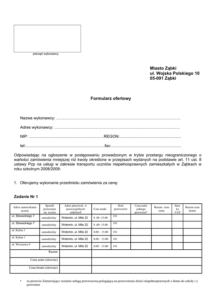 pieczęć wykonawcy Miasto Ząbki ul. Wojska Polskiego 10 05-091 Ząbki Formularz ofertowy Nazwa wykonawcy: ………………………………………………………………………………… Adres wykonawcy: …………………………………………………………………………………. NIP: ...................................................................REGON:....................................................... tel:.......................................................................fax:............................................................... Odpowiadając na ogłoszenie w postępowaniu prowadzonym w trybie przetargu nieograniczonego o wartości zamówienia mniejszej niż kwoty określone w przepisach wydanych na podstawie art. 11 ust. 8 ustawy Pzp na usługi w zakresie transportu uczniów niepełnosprawnych zamieszkałych w Ząbkach w roku szkolnym 2008/2009: 1. Oferujemy wykonanie przedmiotu zamówienia za cenę: Zadanie Nr 1 Adres zamieszkania ucznia ul. Słowackiego 7 ul. Słowackiego 7 ul. Rybna 1 ul. Rybna 1 ul. Wrzosowa 4 Sposób poruszania się ucznia Adres placówek w poszczególnych zadaniach Czas nauki Ilość przewozów Cena netto jednego przewozu* Razem cena netto Staw ka VAT Razem cena brutto 181 samodzielny Wołomin, ul. Miła 22 8 .00 -15.00 samodzielny Wołomin, ul. Miła 22 8 .00- 15.00 samodzielny Wołomin, ul. Miła 22 8.00 – 15.00 181 samodzielny Wołomin, ul. Miła 22 8.00 – 15.00 181 samodzielny Wołomin, ul. Miła 22 8.00 – 15.00 181 181 Razem Cena netto (słownie) Cena brutto (słownie) • za przewóz Zamawiający rozumie usługę przewozową polegającą na przewożeniu dzieci niepełnosprawnych z domu do szkoły i z powrotem Zadanie Nr 2 Adres zamieszkania ucznia ul. Brukowa 8 Sposób poruszania się ucznia Samodzielny ul. Piłsudskiego 5 m. 14 samodzielny ul. Jesienna 8 samodzielny ul. Powstańców 15D m. 411 ul. Piłsudskiego 5A m. 3 samodzielny samodzielny Adres placówek w poszczególnych zadaniach Warszawa, ul. Kordeckiego 54 Warszawa, ul. Kordeckiego 54 Warszawa, ul. Kordeckiego 54 Warszawa, ul. Weterynaryjna 3 Warszawa, ul. Weterynaryjna 3 Czas nauki 8.00 -15.00 8 .00- 15.00 Ilość przewozów Cena netto jednego przewozu* Razem cena netto Staw ka VAT Razem cena brutto 181 181 8.00 – 15.00 181 8.00 – 15.00 181 8.00 – 15.00 181 Razem Cena netto (słownie) Cena brutto (słownie) * za przewóz Zamawiający rozumie usługę przewozową polegającą na przewożeniu dzieci niepełnosprawnych z domu do szkoły i z powrotem Zadanie Nr 3 Adres zamieszkania ucznia Sposób poruszania się ucznia ul. Warszawska 27 samodzielny ul. Sikorskiego 52 samodzielny ul. 11 Listopada 75 samodzielny ul. I Brygady 7 samodzielny ul. Górnośląska 44 wózek Adres placówek w poszczególnych zadaniach Warszawa, ul. Elektoralna 12/14 Warszawa, ul. Elektoralna 12/14 Warszawa, ul. Elektoralna 12/14 Warszawa, ul. Elektoralna 12/14 Warszawa, ul. Białobrzeska 44 Czas nauki 8.00 – 15.00 8.00 – 15.00 Ilość przewozów Cena netto jednego przewozu* Razem cena netto Staw ka VAT Razem cena brutto 181 181 8.00 – 15.00 181 8 .00- 15.00 181 8 .00- 15.00 181 Razem Cena netto (słownie) Cena brutto (słownie) * za przewóz Zamawiający rozumie usługę przewozową polegającą na przewożeniu dzieci niepełnosprawnych z domu do szkoły i z powrotem Zadanie Nr 4 Adres zamieszkania ucznia Sposób poruszania się ucznia ul. Wysockiego 29 samodzielny ul. Chłopickiego 38 samodzielny ul. Szwoleżerów 91D m. 3 ul. Piłsudskiego 111/22 ul. Szwoleżerów 126 m. 11 kule samodzielny samodzielny Adres placówek w poszczególnych zadaniach Warszawa, Plac Trzech Krzyży Warszawa, ul. Koźmińska 7 Warszawa, ul. Drewniana 8 Warszawa, ul. Koźmińska 7 Warszawa, ul. Głogowa 2 B Czas nauki 8.00 – 15.00 8.00 – 15.00 Ilość przewozów Cena netto jednego przewozu* Razem cena netto Staw ka VAT Razem cena brutto 181 181 8.00- 15.00 181 8.00 – 15.00 181 8.30.-16.00 181 Razem Cena netto (słownie) Cena brutto (słownie) • za przewóz Zamawiający rozumie usługę przewozową polegającą na przewożeniu dzieci niepełnosprawnych z domu do szkoły i z powrotem Zadanie Nr 5 Adres zamieszkania ucznia Sposób poruszania się ucznia ul. Chełmińskiego 3A samodzielny Na wózku ul. Łąkowa 39 ul. Wyzwolenia 59 A Na wózku ul. Gen. Maczka 16 Na wózku Adres placówek w poszczególnych zadaniach Warszawa, ul. Wrzeciono 10 Warszawa, ul. Zgrupowania AK Kampinos Warszawa, ul. Felińskiego 15 Ząbki, ul. Batorego 11 Czas nauki Środa-czwartek 9.00 – 14.00 Ilość przewozów Cena netto jednego przewozu* Razem cena netto Staw ka VAT Razem cena brutto 83 181 8.30 – 16.00 8.00- 15.00 181 Raz w tygodniu 44 Razem Cena netto (słownie) Cena brutto (słownie) * za przewóz Zamawiający rozumie usługę przewozową polegającą na przewożeniu dzieci niepełnosprawnych z domu do szkoły i z powrotem 2. Zobowiązujemy się do realizacji przedmiotu zamówienia w terminie od 01.09.2008 r. do 30.06.2009 r. 3. Potwierdzamy termin płatności do 30 dni od daty złożenia faktury VAT. 4. Oświadczamy, że zapoznaliśmy się ze SIWZ i nie wnosimy do niego żadnych zastrzeżeń. 5. Oświadczamy, że zapoznaliśmy się z wzorem umowy i nie wnosimy do niej żadnych zastrzeżeń. 6. Oświadczamy, że uważamy się, za związanych ofertą przez kolejnych 30 dni od daty złożenia niniejszej oferty. 7. W przypadku przyznania nam zamówienia zobowiązujemy się do zawarcia pisemnej umowy na realizację przedmiotu zamówienia w terminie i miejscu wskazanym przez zamawiającego. 8. Do niniejszej oferty załączamy: 1) ............................................................................................................................................... 2) ............................................................................................................................................... 3) ...........................................................................
