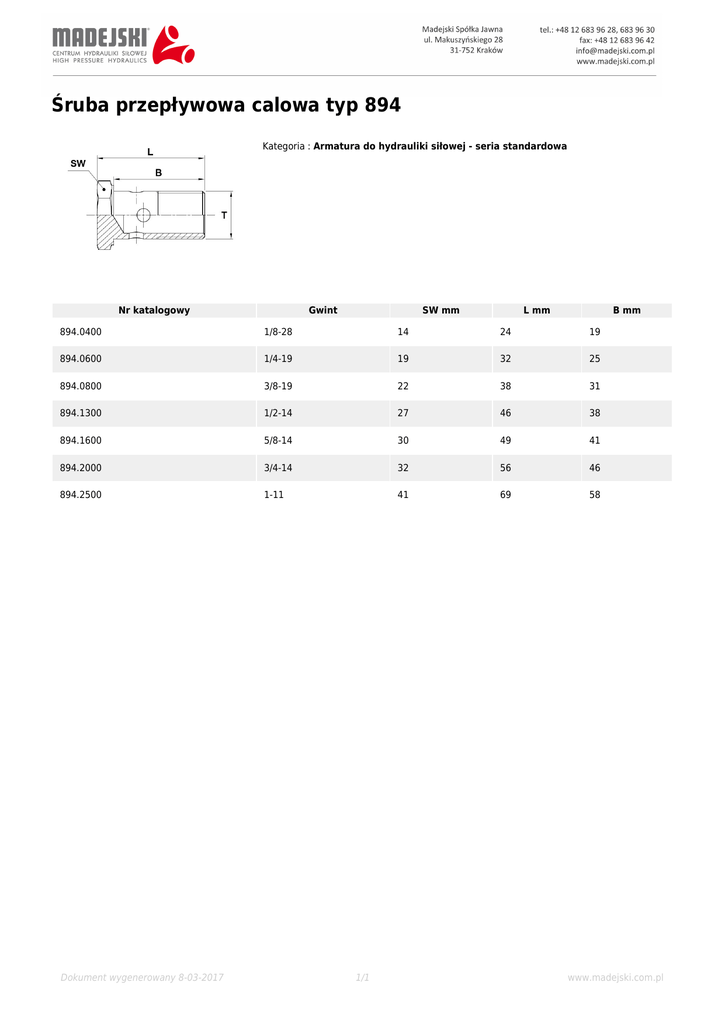 Śruba przepływowa calowa typ 894 Kategoria : Armatura do hydrauliki siłowej - seria standardowa Nr katalogowy Gwint SW mm L mm B mm 894.0400 1/8-28 14 24 19 894.0600 1/4-19 19 32 25 894.0800 3/8-19 22 38 31 894.1300 1/2-14 27 46 38 894.1600 5/8-14 30 49 41 894.2000 3/4-14 32 56 46 894.2500 1-11 41 69 58 Dokument wygenerowany 8-03-2017 1/1 www.madejski.com.pl