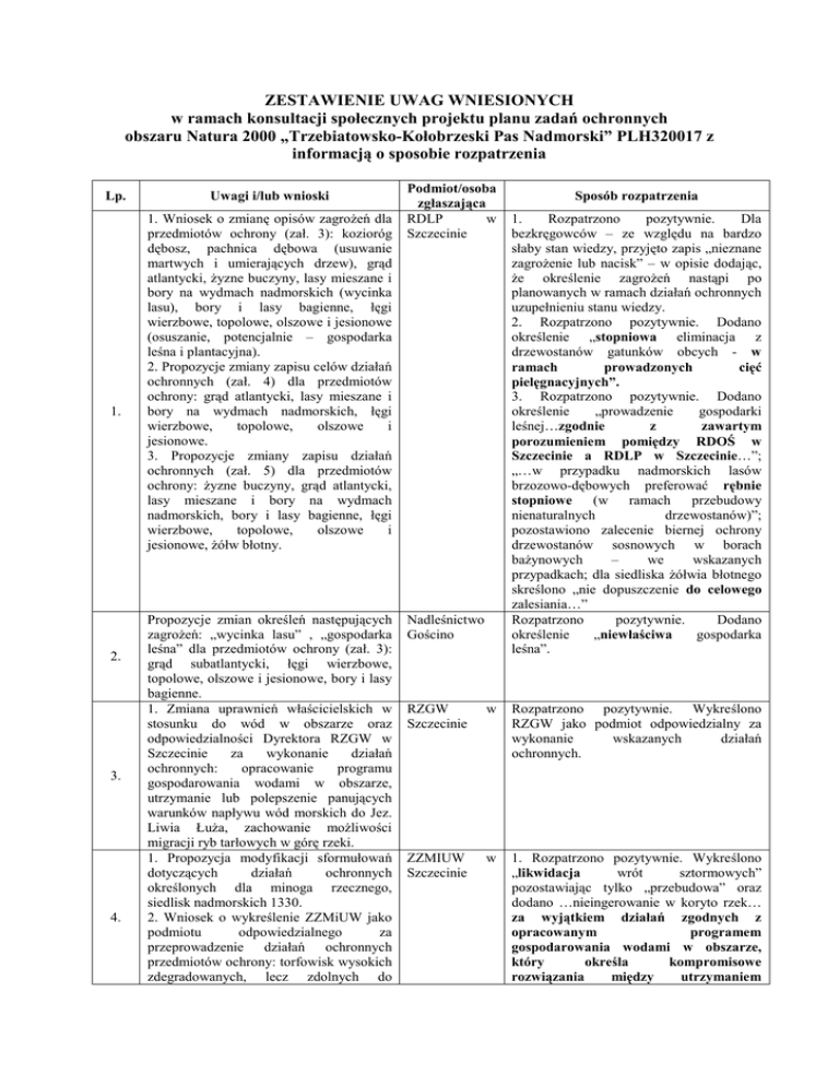 ZESTAWIENIE UWAG WNIESIONYCH w ramach konsultacji społecznych projektu planu zadań ochronnych obszaru Natura 2000 „Trzebiatowsko-Kołobrzeski Pas Nadmorski” PLH320017 z informacją o sposobie rozpatrzenia Lp. 1. 2. 3. 4. Uwagi i/lub wnioski 1. Wniosek o zmianę opisów zagrożeń dla przedmiotów ochrony (zał. 3): kozioróg dębosz, pachnica dębowa (usuwanie martwych i umierających drzew), grąd atlantycki, żyzne buczyny, lasy mieszane i bory na wydmach nadmorskich (wycinka lasu), bory i lasy bagienne, łęgi wierzbowe, topolowe, olszowe i jesionowe (osuszanie, potencjalnie – gospodarka leśna i plantacyjna). 2. Propozycje zmiany zapisu celów działań ochronnych (zał. 4) dla przedmiotów ochrony: grąd atlantycki, lasy mieszane i bory na wydmach nadmorskich, łęgi wierzbowe, topolowe, olszowe i jesionowe. 3. Propozycje zmiany zapisu działań ochronnych (zał. 5) dla przedmiotów ochrony: żyzne buczyny, grąd atlantycki, lasy mieszane i bory na wydmach nadmorskich, bory i lasy bagienne, łęgi wierzbowe, topolowe, olszowe i jesionowe, żółw błotny. Propozycje zmian określeń następujących zagrożeń: „wycinka lasu” , „gospodarka leśna” dla przedmiotów ochrony (zał. 3): grąd subatlantycki, łęgi wierzbowe, topolowe, olszowe i jesionowe, bory i lasy bagienne. 1. Zmiana uprawnień właścicielskich w stosunku do wód w obszarze oraz odpowiedzialności Dyrektora RZGW w Szczecinie za wykonanie działań ochronnych: opracowanie programu gospodarowania wodami w obszarze, utrzymanie lub polepszenie panujących warunków napływu wód morskich do Jez. Liwia Łuża, zachowanie możliwości migracji ryb tarłowych w górę rzeki. 1. Propozycja modyfikacji sformułowań dotyczących działań ochronnych określonych dla minoga rzecznego, siedlisk nadmorskich 1330. 2. Wniosek o wykreślenie ZZMiUW jako podmiotu odpowiedzialnego za przeprowadzenie działań ochronnych przedmiotów ochrony: torfowisk wysokich zdegradowanych, lecz zdolnych do Podmiot/osoba zgłaszająca RDLP w Szczecinie Nadleśnictwo Gościno Sposób rozpatrzenia 1. Rozpatrzono pozytywnie. Dla bezkręgowców – ze względu na bardzo słaby stan wiedzy, przyjęto zapis „nieznane zagrożenie lub nacisk” – w opisie dodając, że określenie zagrożeń nastąpi po planowanych w ramach działań ochronnych uzupełnieniu stanu wiedzy. 2. Rozpatrzono pozytywnie. Dodano określenie „stopniowa eliminacja z drzewostanów gatunków obcych - w ramach prowadzonych cięć pielęgnacyjnych”. 3. Rozpatrzono pozytywnie. Dodano określenie „prowadzenie gospodarki leśnej…zgodnie z zawartym porozumieniem pomiędzy RDOŚ w Szczecinie a RDLP w Szczecinie…”; „…w przypadku nadmorskich lasów brzozowo-dębowych preferować rębnie stopniowe (w ramach przebudowy nienaturalnych drzewostanów)”; pozostawiono zalecenie biernej ochrony drzewostanów sosnowych w borach bażynowych – we wskazanych przypadkach; dla siedliska żółwia błotnego skreślono „nie dopuszczenie do celowego zalesiania…” Rozpatrzono pozytywnie. Dodano określenie „niewłaściwa gospodarka leśna”. RZGW Szczecinie w Rozpatrzono pozytywnie. Wykreślono RZGW jako podmiot odpowiedzialny za wykonanie wskazanych działań ochronnych. ZZMIUW Szczecinie w 1. Rozpatrzono pozytywnie. Wykreślono „likwidacja wrót sztormowych” pozostawiając tylko „przebudowa” oraz dodano …nieingerowanie w koryto rzek… za wyjątkiem działań zgodnych z opracowanym programem gospodarowania wodami w obszarze, który określa kompromisowe rozwiązania między utrzymaniem naturalnej i stymulowanej regeneracji oraz borów i lasów bagiennych. 1. Zastrzeżenia w stosunku do działań ochronnych i granic siedliska Lasy mieszane i bory na wydmach nadmorskich. 2. Wniosek o nie wprowadzanie 100 m strefy ochronnej jeziora Resko Przymorskie na obszarze części miejscowości Rogowo od Mrzeżyna do granicy porty w Dźwirzynie, nie zalesianie działki nr 378 obr. Mrzeżyno, umożliwienie uprawiania sportów wodnych oraz budowy infrastruktury sportowo-rekreacyjnej na obszarze jez. Resko oraz na Starej Redze, budowy lądowiska dla hydroplanów na jez. Resko. 3. Zastrzeżenia do wskazań do studiów uwarunkowań i kierunków zagospodarowania przestrzennego oraz do planów miejscowych. 5. Burmistrz Trzebiatowa właściwych warunków wodnych koniecznych dla użytkowania rolniczego terenu, a zachowaniem wartości przyrodniczych siedlisk gatunków.” 2. Rozpatrzono pozytywnie. Wykreślono ZZMiUW jako podmiot odpowiedzialny za wykonanie wskazanych działań ochronnych. 1. Dla stanowiska siedliska 2180 między Rogowem Mrzeżynem dodano zapis „uzupełnienie stanu wiedzy: weryfikacja granic siedliska między Rogowem a Mrzeżynem, z uwzględnieniem stopnia antropogenicznych przekształceń fitocenoz boru bażynowego” – dopiero po jego realizacji może nastąpić zmiana w kartowaniu siedliska na tym stanowisku. 2. Częściowo rozpatrzono pozytywnie. Zrezygnowano z wyznaczenie strefy buforowej 100 m, ale pozostawiono wskazanie do ograniczenia zabudowy i rozwoju infrastruktury wokół jezior przymorskich i estuariów – w zależności od ustaleń eksperckich i sporządzanych ocen oddziaływania na Obszary Natura 2000. Zrezygnowano z zalesienia działki nr 378 obr. Mrzeżyno, ze względu na zapisy w już istniejącym palnie przestrzennego zagospodarowania (niestety). Jest to duża strata dla środowiska – martwi podejście organów gminy - nie widzą potrzeby naprawy stanu po ustąpieniu jednostki wojskowej, tylko starają się wykorzystać takie tereny dla korzyści ekonomicznych. Dawna, wylesiona strzelnica narusza spójności nadmorskich borów sosnowych na mierzei jeziora, a planowana tam zabudowa zwiększy poziom antropopresji. Niepokój budzi także niezrozumienie wartości i walorów unikatowego siedliska, jakim jest jezioro Resko Przymorskie wraz z bytującymi tam chronionymi i zagrożonymi gatunkami zwierząt – m.in. wieloma gatunkami ptaków