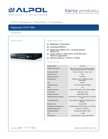 CCTV / Analogowe / Rejestratory / 16 kanałowe Rejestrator DVR 1680 Producent: Zdjęcie produktu Najważniejsze cechy Rejestrator 16 kanałowy Kompresja MPEG-4 Rejestracja 400kl/s w D1, na każdą kamerę 25kl/s w D1 Liczba dysków 4 HDD SATA, DVD-RW (lub 5 HDD bez nagrywarki) Macierz dyskowa 1x DVR-5 ( 4 HDD) Dane techniczne Wejścia Wideo Obsługa, Sterowanie Protokoły RS-485 Detekcja Ruchu Wejścia Alarmowe Wyszukiwanie POS Interfejs Sieciowy USB Protokoły Sieciowe Archiwizacja Aplikacje Sieciowe Obsługa Dysków Twardych Tryby Nagrywania Wejścia Audio Rozdzielczość Nagrywania Prędkość Nagrywania Kompresja Wideo VGA Format Kopii 16 kanały Mysz, pilot, klawisze na panelu przednim, zdalna klawiatura DCK-100, DCK-500A Pelco-D, Pelco-P , D-max, inne TAK 16 NO/NC Detekcja ruchu , zadziałanie wejść alarmowych RS-232 2x RJ-45 [10/100/1000 MB) Tak TCP/IP, UDP, SMTP, NTP, DHCP, DDNS USB, Sieć , DVD GOSSAMER, CMS Dyski SATA 4 x HDD + DVD lub 5 x HDD bez DVD Harmonogram, Alarmowy, Detekcja Ruchu, Ręczny 16 wejść RCA CIF(360*288), 2CIF(720*288), D1 (720*576) 400kl/s (D1 720x576) Rozszerzony MPEG-4 ASP 1 x VGA Klip video [exe), obrazy stałe [JPEG)