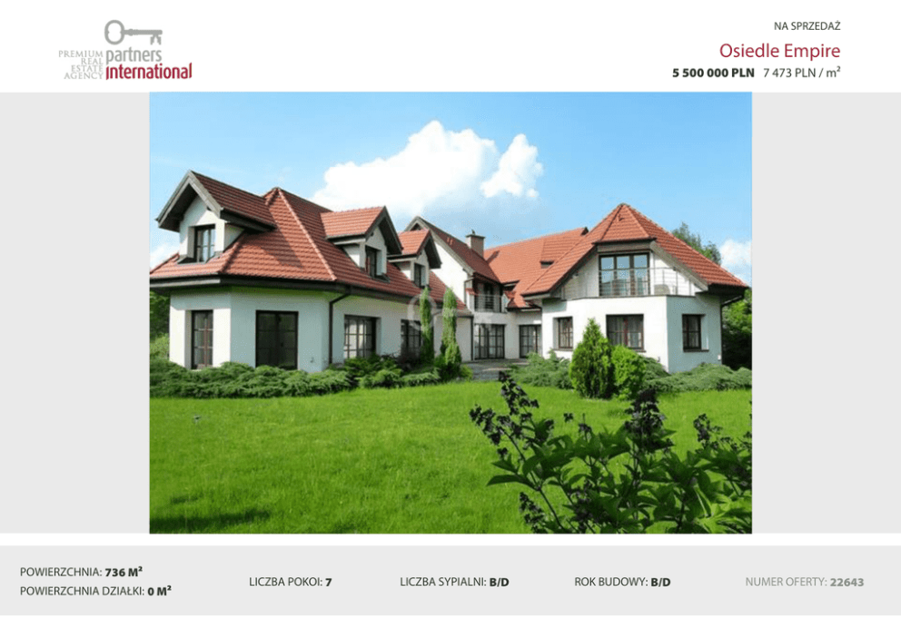 NA SPRZEDAŻ Osiedle Empire 5 500 000 PLN 7 473 PLN / m² POWIERZCHNIA: 736 M² POWIERZCHNIA DZIAŁKI: 0 M² LICZBA POKOI: 7 LICZBA SYPIALNI: B/D ROK BUDOWY: B/D NUMER OFERTY: 22643 Opis Nowoczesna willa zlokalizowana na Osiedlu Empire – Konstancinie Jeziorna UKŁAD POMIESZCZEŃ PARTER: Salon 42,79 m2 Jadalnia 17,5 m2 Bilard 40,88 m2 Hol 64,74 m2 Kuchnia 13,07 m2 Spiżarnia 12,11 m2 Gabinet 34,82 m2 Pokój gościnny 12,5 m2 Łazienka 6,47 m2 WC 2,46 m2 Wiatrołap 10,09 m2 Basen + Sauna 60,42 m2 WC 2,25 m2 Taras kuchenny 39,3 m2 Taras 75,48 m2 Garaż 36,42 m2 Warsztat 9,42 m2 Kotłownia 11,7 m2 I PIĘTRO: Sypialnia główna 32,97 m2 Garderoba 6,78 m2, Łazienka 16,66 m2 Taras 8,91 m2 Holl 89,00 m2 Taras 18,15 m2 Taras 10,15 m2 Pracownia 33,39 m2 Łazienka 13,6 m2 Balkon 5,36 m2 Pokój 21,98 m2 Pokój 20,65 m2 Pokój 20,35 m2 Łazienka 7,65 m2 Łazienka 7,65 m2 Mieszkanie- służbówka 25,44 m2 Łącznik 3,63 m2 Hol 8,97 m2 Łazienka 6,88 m2 Klatka schodowa 6,41 m2 Taras 7,72 m2 STANDARD Celem architekta było połączenie nowoczesności z wygodą mieszkańców. W sypialniach wykonano parkiety z naturalnego drewna. Drzwi zewnętrzne i wewnętrzne oraz okna z drewna mahoniowego. Pokój kąpielowy na piętrze wyposażony został w nowoczesną wannę z hydromasażem. W oddzielnym budynku połączonym łącznikiem zlokalizowano garaż, przeznaczony na dwa samochody oraz kotłownię gazową. Nad garażem jest mieszkanie dla obsługi domu z niezależnym wejściem. Rezydencja w wyposażona została w instalację EIB ułatwiającą sterowanie żaluzjami i światłem. Zainstalowano domofon. Pokoje wyposażone zostały w instalację zbiorczą TV satelitarnej, w każdym pokoju jest instalacja telefoniczna i dostęp do Internetu. Na parterze znajduje się pomieszczenie, w którym można urządzić część fitness, z jacuzzi, sauną oraz basenem – doprowadzono wszystkie niezbędne media. W zależności od potrzeb użytkownika, pokój może być adaptowany na olbrzymią jadalnię lub pokój dzienny. W ogrodzie wykonano instalację wodną do podlewania roślin. Dom i ogród jest oświetlony na zewnątrz. System alarmowy umożliwia swobodne poruszanie się mieszkańców wewnątrz domu, chroniąc skutecznie całą posiadłość na zewnątrz. Zainstalowany system alarmowy wyposażony jest w opcję umożliwiającą wpięcie do systemu monitorowania obiektu „online”. LOKALIZACJA Doskonałe położenie w Konstancinie – Jeziorna pod Warszawą, na terenie strzeżonego, pięknego osiedla willowego, w odległości ok. 5 minut samochodem znajduje się jedna z nowocześniejszych szkół w Europie – American School of Warsaw. KONTAKT: Joanna Czapska 502 709 530 POŚREDNIK ODPOWIEDZIALNY: Joanna Czapska (licencja zawodowa nr 4585), Przedstawiona wyżej propozycja nie jest ofertą handlową w rozumieniu przepisów prawa lecz ma charakter informacyjny. Partners International dokłada starań, aby treści przedstawione w naszych ofertach były aktualne i rzetelne. Dane dotyczące ofert uzyskano na podstawie oświadczeń sprzedających. Modern residential house in Empire Estate- Konstancin-Jeziorna ROOM LAYOUT GROUND FLOOR: Livingroom 42,79 m2 Dining room 17,5 m2 Billiards 40,88 m2 Hall 64,74 m2 Kitchen 13,07 m2 Store-room 12,11 m2 Private Office 34,82 m2 Guest Room 12,5 m2 Bathroom 6,47 m2 WC 2,48 m2 Porch 10,09 m2 Swimming pool + Sauna 60,42 m2 WC 2,25 m2 Kitchen terrace 39,3 m2 Terrace 75,48 m2 Garage 36,42 m2 Workshop 9,42 m2 Boiler 11,7 m2 Ist FLOOR: Master bedroom 32,97 m2 Dressing room 6,76 m2 Bathroom 16,66 m2 Terrace 8,91 m2 Hall 89,00 m2 Terrace 18,15 m2 Terrace 10,15 m2 Studio 33,39 m2 Bathroom 13,6 m2 Balcony 5,36 m2 Room 21,98 m2 Room 20,65 m2 Room 20,35 m2 Bathroom 7,65 m2 Bathroom 7,65 m2 Staff Flat 26,44 m2 Link 3,63 m2 Hall 8,97 m2 Bathroom 6,88 m2 Staircase 6,41 m2 Terrace 7,72 m2 STANDARD The main goal of the house architect was to combine modern style with residents’ comfort. The floors in the bedrooms are made of natural wood. The entrance door, all the doors inside the building and the window frames are made of mahogany wood. A bathroom on the floor is equipped with a modern bath with hydromassage. The residency is equipped with EIB installation to simplify the steering of light and window shuuters. Entrance bell has been installed. The rooms have satelite TV installation, each room has phone and Internet connection. On the ground floot there is a room with jacuzzi, sauna and swimming-pool – the media needed is provided. A part of this room can be arranged as a fitness part. Depending on the residents’ needs the room can be adapted as a huge dining-room or living room. In the garden there is a water installation to water plants. The house and the garden are lightsome from the outside. Alarm system enables the residents’ to go freely inside the house, succesfuly protecting the whole estate from the outside. Installed alarm system is equipped with the option enables connection of the property to the monitoring system „online”. LOCATION Great location in Konstancin-Jeziorna near Warsaw, in the area of a beautiful secured villa district. In the distance of 5 minute drive there is one of the most modern schools in Europe – the American School of Warsaw. CONTACT: Joanna Czapska 502 709 530 Broker responsible: Joanna Czapska (professional license No. 4585) Outlined above proposal is not a commercial offer for the purposes of the law but is informative. All data relating to real estate was obtained on the basis statements of the Sellers. Plan Lokalizacja Katarzyna Joanna Czapska Katarzyna Joanna Czapska Ul. Koszykowa 10/19 00-564 Warszawa tel. (+48 22) 646 52 02 fax: (+48 22) 646 26 99 partnersinternational.pl Pośrednik odpowiedzialny: JOANNA CZAPSKA Managing Director telefon: (+48) 502 709 530 email: [email protected]