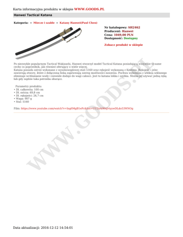 Karta informacyjna produktu w sklepie WWW.GOODS.PL Hanwei Tactical Katana Kategoria: » Miecze i szable » Katany Hanwei(Paul Chen) Nr katalogowy: SH2462 Producent: Hanwei Cena: 1049,00 PLN Dostępność: Dostępny Zobacz produkt w sklepie S. PL Po niezwykle popularnym Tactical Wakizashi, Hanwei stworzył model Tactical Katana posiadającą wszystkie te same cechy co poprzednik, jak również oferujący o wiele więcej. Katana posiada ostrze wykonane z wysokowęglowej stali 5160 oraz rękojeść wykonaną z Kratonu. Rękojeść i jelec zawierają otwory, które z dołączoną linką zapewniają szereg możliwości noszenia. Pochwa wykonana z włókna szklanego eliminuje wchłanianie wody i niewiele dodaje do wagi całosci. Jest to katana lekka i szybka. Można jej używać jedną ręką lub gdy zajdzie taka potrzeba oburącz. O D Parametry produktu: • Dł. całkowita: 100 cm • Dł. ostrza: 69,8 cm • Dł. rękojeści: 26,7 cm • Waga: 907 g • Stal: 5160 W W W .G O Film: https://www.youtube.com/watch?v=Ing0MgB1ePc&list=UU2oAiWeJvtyywDLdo53WNOg Data aktualizacji: 2016-12-12 14:54:01