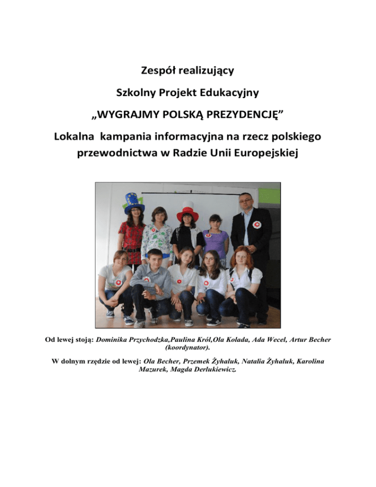 Zespół realizujący Szkolny Projekt Edukacyjny „WYGRAJMY POLSKĄ PREZYDENCJĘ” Lokalna kampania informacyjna na rzecz polskiego przewodnictwa w Radzie Unii Europejskiej Od lewej stoją: Dominika Przychodzka,Paulina Król,Ola Kolada, Ada Wecel, Artur Becher (koordynator). W dolnym rzędzie od lewej: Ola Becher, Przemek Żyhaluk, Natalia Żyhaluk, Karolina Mazurek, Magda Derlukiewicz.