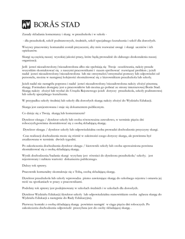Zasady składania komentarzy i skarg w przedszkolu i w szkole - dla przedszkoli, szkół podstawowych, średnich, szkół specjalnego kształcenia i szkół dla dorosłych. Wszyscy pracownicy komunalni zostali przyuczeni, aby móc rozważać uwagi i skargi uczniów i ich opiekunów. Skargi są częścią naszej wysokiej jakości pracy, które będą prowadzić do dalszego doskonalenia naszej organizacji. Jeśli jesteś niezadowolony/niezadowolona albo nie spełniają się Twoje oczekiwania, należy przede wszystkim skontaktować się z naszymi pracownikami i razem spróbować rozwiązać problem ; jeżeli nadal jesteś niezadowolony/niezadowolona lub nie otrzymałeś/otrzymałaś pomocy lub odpowiedzi od personelu, można w następnej kolejności skontaktować się z kierownikiem przedszkola lub szkoły. Jeżeli nadal nie nastąpiła poprawa i nadal jesteś niezadowolony/niezadowolona należy złożyć pisemną skargę. Formularz dostępny jest u pracowników lub można go pobrać ze strony internetowej Borås Stad. Skargę należy złożyć lub wysłać do Urzędu Rejonowego jeżeli dotyczy przedszkola, szkoły podstawowej lub szkoły specjalnego kształcenia. W przypadku szkoły średniej lub szkoły dla dorosłych skargę należy złożyć do Wydziału Edukacji. Skarga jest zarejestrowana i staje się dokumentem publicznym. Co dzieje się z Twoją skargą lub komentarzem? Dyrektor okręgu / dyrektor szkoły lub osoba równoważna zawodowo, w terminie pięciu dni roboczych,powinna skontaktować się z osobą składającą skargę. Dyrektor okręgu / dyrektor szkoły lub odpowiedzialna osoba prowadzi dochodzenie przyczyny skargi. Czas realizacji dochodzenia może się różnić w zależności czego dotyczy skarga, ale powinnna być zrealizowana w terminie dwóch tygodni. Po zakończeniu dochodzenia dyrektor okręgu / kierownik szkoły lub osoba upoważniona powinna skontaktować się z osobą składającą skargę. Wynik dochodzenia/badania skargi wysyłany jest również do dyrektora przedszkola/ szkoły; jest rejestrowany i nabiera wartości dokumentu publicznego. Dalszy tok sprawy. Pracownik komunalny skontaktuje się z Tobą, osobą składającą skargę. Dyrektor przedszkola lub szkoły wprowadza pismo zawierające skargę do szkolnego rejestru i omawia jej treść na spotkaniach w pracy z pracownikami. Podobny tok sprawy jest podejmowany w szkołach średnich i w szkołach dla dorosłych. Dyrektor Wydziału Edukacji/dyrektor szkoły lub odpowiedzialna stanowiskiem osoba zgłasza skargę do Wydziału Edukacji a następnie do Rady Edukacyjnej. Pierwszy kontakt z osobą składającą skargę powinien nastąpić w ciągu pięciu dni roboczych. Po zakończeniu dochodzenia odpowiedź przesyłana jest do osoby składającej skargę .