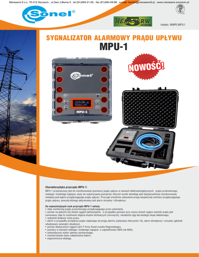 Meraserw-5 s.c. 70-312 Szczecin , ul.Gen.J.Bema 5 , tel.(91)484-21-55 , fax (91)484-09-86 , e-mail: [email protected] , www.meraserw.szczecin.pl Indeks: WMPLMPU1 SYGNALIZATOR ALARMOWY PRĄDU UPŁYWU MPU-1 NOWOŚĆ! Charakterystyka przyrządu MPU-1: MPU-1 przeznaczony jest do monitorowania (pomiaru) prądu upływu w sieciach elektroenergetycznych, prądu przemiennego, niskiego i średniego napięcia, służy do wykonywania pomiarów, których wyniki określają stan bezpieczeństwa monitorowanej instalacji pod kątem przepływającego prądu upływu. Przyrząd umożliwia ustawienie progu bezpiecznej wartości przepływającego prądu upływu, powyżej którego aktywowany jest alarm wizualny i dźwiękowy. Do najważniejszych cech przyrządu MPU-1 należą: · stały monitoring prądu przemiennego przepływającego przez uziemienie, · pomiar na jednych lub dwóch cęgach jednocześnie, w przypadku pomiaru przy użyciu dwóch cęgów wartość prądu jest sumowana, daje to możliwość objęcia slupów bliźniaczych (wirowych), niezależne cęgi dla każdego słupa składowego, · wskaźnik diodowy trybu pracy, · alarm w przypadku przepływu prądu większego od progu alarmu (ustawiany fabrycznie 1A), alarm dźwiękowy i wizualny (głośnik wbudowany wewnątrz obudowy), · pomiar elastycznymi cęgami serii F firmy Sonel (cewka Rogowskiego), · pomiary w sieciach niskiego i średniego napięcia o częstotliwości 50Hz lub 60Hz, · automatyczny wybór zakresu pomiarowego, · monitorowanie stanu naładowania baterii, · ergonomiczna obsługa. Sygnalizator alarmowy prądu upływu MPU-1 Przyrząd przyłącza się do badanej sieci elektroenergetycznej lub urządzenia zgodnie z rysunkami poniżej: Rys.1 Praca przyrządu przy użyciu pojedynczych cęgów Rys.2 Praca przyrządu przy użyciu podwójnych cęgów Rys.3 Praca w trybie średniego napięcia - na wyświetlaczu widzimy wartość ustawionego progu alarmu oraz wskazanie stanu naładowania akumulatora. Rys.4 Praca w trybie niskiego napięcia - na wyświetlaczu widzimy wartość mierzonego przepływającego prądu przez cęgi oraz wskazanie stanu naładowania akumulatora. Pomiar prądów upływu, przepływających przez cęgi: Zakres Rozdzielczość Błąd podstawowy 0,1..9,9A 0,01A 10..299A 0,1A ±(5% w.m. + 2 cyfr) ±(5% w.m. + 2 cyfry) - zakres częstotliwości: 50Hz lub 60Hz - cęgi prądowe giętkie – F-1 Rys.5 Rozmieszczenie gniazd w sygnalizatorze MPU-1. Dane techniczne: - stopień ochrony obudowy wg PN-EN 60529............................................................... IP67 - zasilanie przyrządu............................... pakiet akumulatora typu SONEL NiMH 9,4V 2,1Ah - czas pracy dla trybu czuwania:..................... .............................................................. >18h - czas pracy dla trybu alarmu:......................................................................................... >3h - wymiary............................................................................................... 125 x 150 x 95 mm - masa przyrządu z akumulatorami........................................................................ ok. 1,1 kg - temperatura pracy ............................................................................................. -10..+50 °C - temperatura pracy ładowarki ............................................................................ +10..+35 °C - temperatura odniesienia ........................................................................................ 23 ±2 °C - temperatura przechowywania............................................................................ -20..+80 °C - wilgotność względna............................................................................................. 20..85% - wilgotność względna nominalna............................................................................ 40..60% - wysokość n.p.m. ................................................................................................... <2000m - standard jakości............................... opracowanie, projekt i produkcja zgodnie z ISO 9001 - wyrób spełnia wymagania EMC wg norm PN-EN 61326-1:2013 i PN-EN 61326-2-2:2013 Wyposażenie podstawowe: - komplet opasek do mocowania sygnalizatora oraz cęgów - walizka transportowa - zasilacz sieciowy do ładowania akumulatora - przewód sieciowy do zasilacza - karta gwarancyjna, - instrukcja obsługi WAPOZOPAKPL WAWALL5 WAZASZ11 WAPRZLAD230 „w.m.” w określeniu niepewności podstawowej oznacza wartość mierzoną wzorcową.