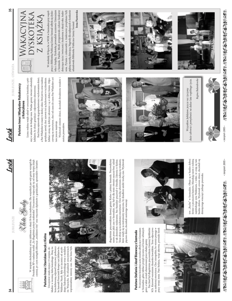 Złote Gody jubileusze Po uroczystości kościelnej uczta weselna odbyła się w Gimnazjum w Szemudzie, gdzie Jubilaci przyjęli życzenia od licznie zebranych gości, a także zostali uhonorowani przez władze gminy. Pan Józef był długoletnim pracownikiem Gminnej Spółdzielni SCh. Kierował warsztatem ślusarsko-kowalskim. Teraz odpoczywa na zasłużonej emeryturze. Choć niezupełnie, bo wiernie pomaga w pracy swojej żonie. Pani Stefania, wciąż aktywna, prowadzi kiosk Państwo Stefania i Józef Bizewscy z Szemuda • sierpień 2005 • tzw. „Ruchu” w Szemudzie. Oboje są w bardzo dobrej formie i z poczuciem humoru. Mieszkają razem z rodziną najmłodszego syna Waldemara, i widać, że czują się tam bardzo dobrze. Wychowali czworo dzieci, doczekali się dziesięciorga wnucząt i jednego prawnuka. długoletnim pracownikiem dawnej gminy Kielno i później Szemuda. Pracowałyśmy razem przez jakiś czas w Szemudzie, więc był to dla mnie również zaszczyt brać udział w tak doniosłym wydarzeniu. Pan Stanisław pracował w Ośrodku Zdrowia w Kielnie. Teraz oboje są na zasłużonej emeryturze. Choć trochę schorowani, radują się wnukami, które wzięły się za instrumenty muzyczne, by dziadkom umilić trochę czas. Wychowali pięcioro dzieci, doczekali sześciorga wnucząt. Państwo Irena i Stanisław Naczk z Kielna W sierpniu obchodziliśmy aż trzy jubileusze z okazji 50-lecia małżeństwa. Dla wszystkich par wójt gminy wystąpił do Prezydenta RP o nadanie medali „Za długoletnie pożycie małżeńskie”. Uroczystości rozpoczęły się od mszy świętej dziękczynnej, po czym nastąpiła dekoracja „medalami róży” oraz wręczenie dyplomów z gratulacjami, upominków i kwiatów. Uroczystość miała miejsce 15 sierpnia, dokładnie w rocznicę ślubu kościelnego. Mszę św. koncelebrowaną odprawił miejscowy proboszcz ks. kanonik Franciszek Rompa i syn Jubilatów ks. Waldemar Naczk. Były też życzenia od arcybiskupa Tadeusza Gocłowskiego wraz z medalem św. Wojciecha. Po oficjalnych uroczystościach wspominaliśmy miniony czas. Pani Irena była 34 • sierpień 2005 • Regina Balandowska Wszystkim Jubilatom jeszcze raz życzymy dużo zdrowia i pomyślności na dalsze lata wspólnego życia. Liczna rodzina wzięła udział w uroczystości kościelnej, a później w zabawie do białego rana. Władze gminy również odwiedziły Jubilatów, by złożyć gratulacje i odpowiednio uhonorować. Pani Irena zajmowała się gospodarstwem i wychowaniem dzieci, a Pan Władysław to znany w okolicy zdun. Dziś jest to coraz rzadziej spotykany zawód, choć synowie też są fachowcami w tej dziedzinie. Jubilaci cieszą się dobrym zdrowiem i są w dobrej formie. Odpoczywają na emeryturze, choć od czasu do czasu Pan Władysław coś tam jeszcze majstruje. Wychowali ośmioro dzieci, doczekali dwudziestu wnuków i sześciu prawnuków. Państwo Irena i Władysław Robakowscy z Koleczkowa Wakacyjna dyskoteka z książką 35 W niedzielę 30 lipca br. w WOK w Szemudzie przy współpracy z Biblioteką Publiczną Gminy Szemud odbyła się dyskoteka z książką. Dyskotekę prowadzili uczniowie Gimnazjum z Szemuda. Paulina Miotk przygotowała ciekawe konkursy dotyczące życia i twórczości Andersena z okazji roku Andersena. Pytania i ciekawostki o Andersenie przeplatane były piękną muzyką dziecięcą. Nagrody dla najlepszych w konkursie ufundowała Biblioteka Publiczna Gminy Szemud. Irena Piastowska jubileusze, oświata