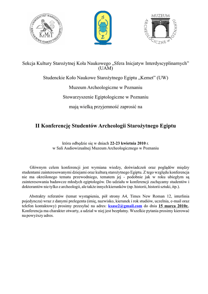 Sekcja Kultury Staro¿ytnej Ko³a Naukowego „Sfera Inicjatyw Interdyscyplinarnych” (UAM) Studenckie Ko³o Naukowe Staro¿ytnego Egiptu „Kemet” (UW) Muzeum Archeologiczne w Poznaniu Stowarzyszenie Egiptologiczne w Poznaniu maj¹ wielk¹ przyjemnoœæ zaprosiæ na II Konferencjê Studentów Archeologii Staro¿ytnego Egiptu która odbêdzie siê w dniach 22-23 kwietnia 2010 r. w Sali Audiowizualnej Muzeum Archeologicznego w Poznaniu G³ównym celem konferencji jest wymiana wiedzy, doœwiadczeñ oraz pogl¹dów miêdzy studentami zainteresowanymi dziejami oraz kultur¹ staro¿ytnego Egiptu. Z tego wzglêdu konferencja nie ma okreœlonego tematu przewodniego, tematem jej - podobnie jak w roku ubieg³ym s¹ zainteresowania badawcze m³odych egiptologów. Do udzia³u w konferencji zachêcamy studentów i doktorantów nie tylko z archeologii, ale tak¿e innych kierunków (np. historii, historii sztuki, itp.). Abstrakty referatów (temat wyst¹pienia, pó³ strony A4, Times New Roman 12, interlinia pojedyncza) wraz z danymi prelegenta (imiê, nazwisko, kierunek i rok studiów, uczelnia, e-mail oraz telefon kontaktowy) prosimy przesy³aæ na adres: [email protected] do dnia 15 marca 2010r.. Konferencja ma charakter otwarty, a udzia³ w niej jest bezp³atny. Wszelkie pytania prosimy kierowaæ na powy¿szy adres.