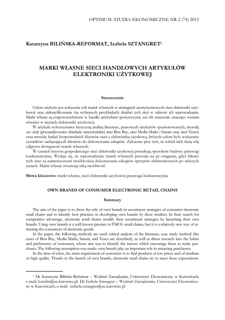OPTIMUM. STUDIA EKONOMICZNE NR 2 (74) 2015 Katarzyna BILIŃSKA-REFORMAT, Izabela SZTANGRET1 MARKI WŁASNE SIECI HANDLOWYCH ARTYKUŁÓW ELEKTRONIKI UŻYTKOWEJ Streszczenie Celem artykułu jest wskazanie roli marek własnych w strategiach asortymentowych sieci elektroniki użytkowej oraz zidentyfikowanie (na wybranych przykładach) działań tych sieci w zakresie ich wprowadzania. Marki własne są rozpowszechnione w handlu artykułami spożywczymi, zaś ich znaczenie znacząco wzrasta również w sieciach elektroniki użytkowej. W artykule wykorzystano: krytyczną analizę literatury, prasowych artykułów sponsorowanych, metodę case study (przeanalizowano działanie amerykańskiej sieci Best Buy, sieci Media Markt i Saturn oraz sieci Tesco) oraz metodę badań bezpośrednich klientów sieci z elektroniką użytkową, których celem było wskazanie czynników zachęcających klientów do dokonywania zakupów. Założono przy tym, że wśród nich dużą rolę odgrywa dostępność marek własnych. W czasach kryzysu gospodarczego sieci elektroniki użytkowej poszukują sposobów budowy przewagi konkurencyjnej. Wydaje się, że wprowadzanie marek własnych pozwala na jej osiąganie, gdyż klienci tych sieci są zainteresowani możliwością dokonywania zakupów sprzętów elektronicznych po niższych cenach. Marki własne stwarzają taką możliwość. Słowa kluczowe: marki własne, sieci elektroniki użytkowej przewaga konkurencyjna OWN BRANDS OF CONSUMER ELECTRONIC RETAIL CHAINS Summary The aim of the paper is to show the role of own brands in assortment strategies of consumer electronic retail chains and to identify best practices in developing own brands by these retailers. In their search for competitive advantage, electronic retail chains modify their assortment strategies by launching their own brands. Using own brands is a well known practice in FMCG retail chains, but it is a relatively new way of attracting the consumers of electronic goods. In the paper, the following methods are used: critical analysis of the literature, case study method (the cases of Best Buy, Media Markt, Saturn, and Tesco are described), as well as direct research into the habits and preferences of customers, whose aim was to identify the factors which encourage them to make purchases. The following assumption was made: own brands play an important role in attracting purchasers. In the time of crisis, the main requirement of customers is to find products at low prices and of medium or high quality. Thanks to the launch of own brands, electronic retail chains try to meet these expectations. 1 Dr Katarzyna Bilińska-Reformat – Wydział Zarządzania, Uniwersytet Ekonomiczny w Katowicach; e-mail: [email protected]. Dr Izabela Sztangret – Wydział Zarządzania, Uniwersytet Ekonomiczny w Katowicach; e-mail: [email protected] 172 Katarzyna Bilińska-Reformat, Izabela Sztangret Observation of the activity of these entities reveals that the share of own brands offered in their assortments is growing. Key words: own brands, electronic retail chains, competitive advantage DOI: 10.15290/ose.2015.02.74.11 1. Wstęp Pojęcie marek własnych najczęściej jest kojarzone z sieciami spożywczymi i markami obecnymi w sieciach takich detalistów, jak: Auchan, Carrefour, Tesco czy Real. Marki własne są rozpowszechnione w wielu przemysłach, od spożywczego przez kosmetyczny, np. w sieci Rossmann, ISANA czy RIVAL de Loop, na serwisach internetowych kończąc. Często były one kojarzone z produktami niższej jakości, tym samym tańszymi od regionalnych, krajowych czy międzynarodowych marek. Obecnie sytuacja powoli ulega zmianie, produkty te zaczynają być traktowane jako produkty klasy „Premium”, stanowiąc jednocześnie konkurencję dla towarów markowych. Międzynarodowa Organizacja Marek Własnych (Private Label Manufacturer's Association (PLMA)) rozpoznaje cztery kategorie producentów marek własnych2: 1. Duże krajowe marki, które chcą wykorzystać zdolności produkcyjne, zaopatrując również na większą skalę sieci marketów; 2. Mali producenci, którzy specjalizują się w pojedynczych liniach produktowych. Ich właścicielami są często korporacje produkujące także wyroby markowe; 3. Główni hurtownicy i detaliści, którzy są w stanie sami zaopatrzyć się w marki własne; 4. Regionalne zakłady produkcyjne, które produkują marki własne na potrzeby poszczególnych rynków. Marki własne są wykorzystywane jako ważne narzędzie marketingowe (związane ze strategią kształtowania asortymentu), pozwalające na skuteczną walkę konkurencyjną. Analizując asortymenty sieci handlujących elektroniką użytkową, można zauważyć, że stają się one coraz ważniejszym elementem ich strategii asortymentowych i tym samym strategii konkurencji. 2. Marka własna – identyfikacja kategorii badawczej Bardzo ważnym elementem strategii działania sieci handlowych jest kwestia doboru sprzedawanych marek. Coraz więcej sieci handlowych zdecydowało się wprowadzić do swojego asortymentu produkty sygnowane marką stworzoną specjalnie dla danej sieci [Domański, 2001]. W dużej mierze jest to spowodowane ogólnoświatowym kryzysem [Gala, Patil, 2013]. 2 Dokument elektroniczny, tryb dostępu: [http://www.investopedia.com/terms/p/private-brand.asp, data wejścia: 12.03.2014]. Marki własne sieci handlowych artykułów elektroniki użytkowej 173 Markami własnymi określa się produkty wytwarzane na zlecenie sieci handlowej, opatrzone etykietą z nazwą tej sieci i dostępne wyłącznie w sklepach do niej należących3. Istnieje również inna definicja mówiąca, że są to produkty wytwarzane z inicjatywy sieci handlowej lub na wyłączne jej zlecenie, opatrzone nazwą dystrybutora, dostępne w sklepach należących i kooperujących z siecią handlową [Gupta, Randhawa, 2005]. Produkty takie zazwyczaj oferują podobną jakość do produktów znanych marek, lecz oferowane są po niższych cenach. Mark